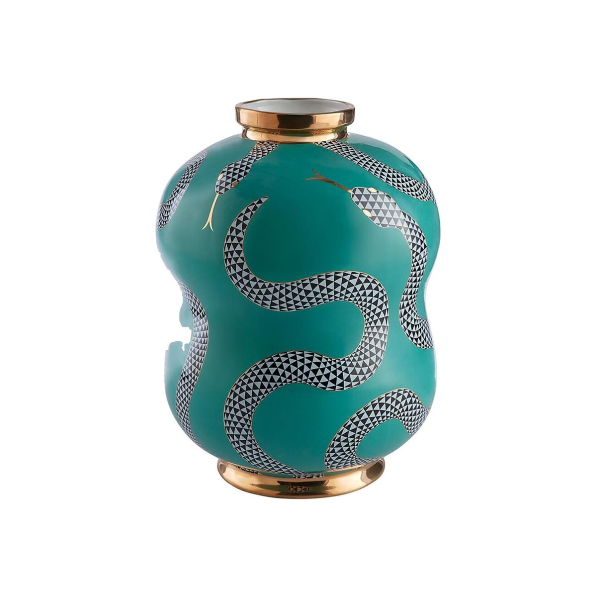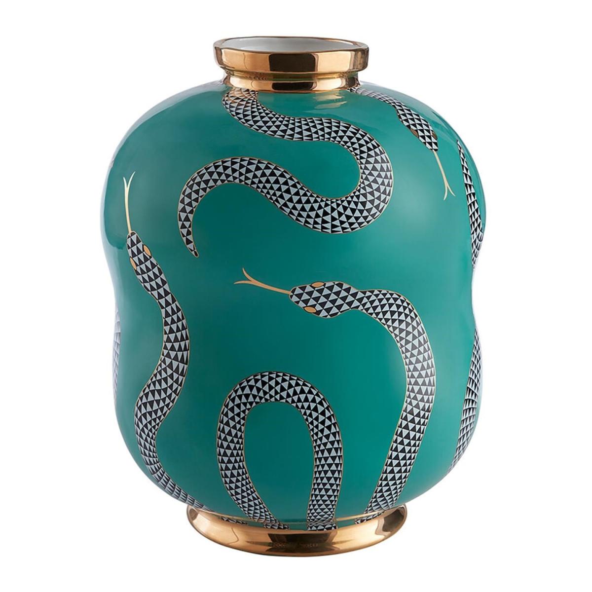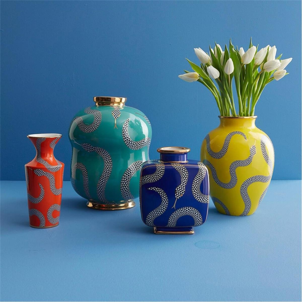 Jonathan Adler's Eden vases are a visually appealing addition to any surface – be it a table, shelf, or a mantel. The vases are decorated with our signature serpents, which adds a unique touch to their overall aesthetic. The pop-toned hues make them stand out, while the sparkling gold accents elevate their glamour quotient. You can mix and match the vases with others to create a unique look or keep the collection together for an added impact.