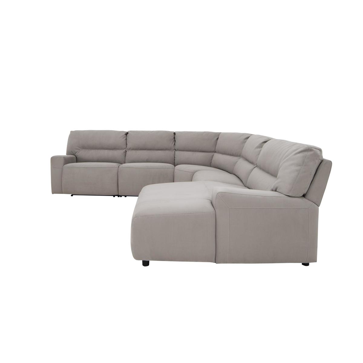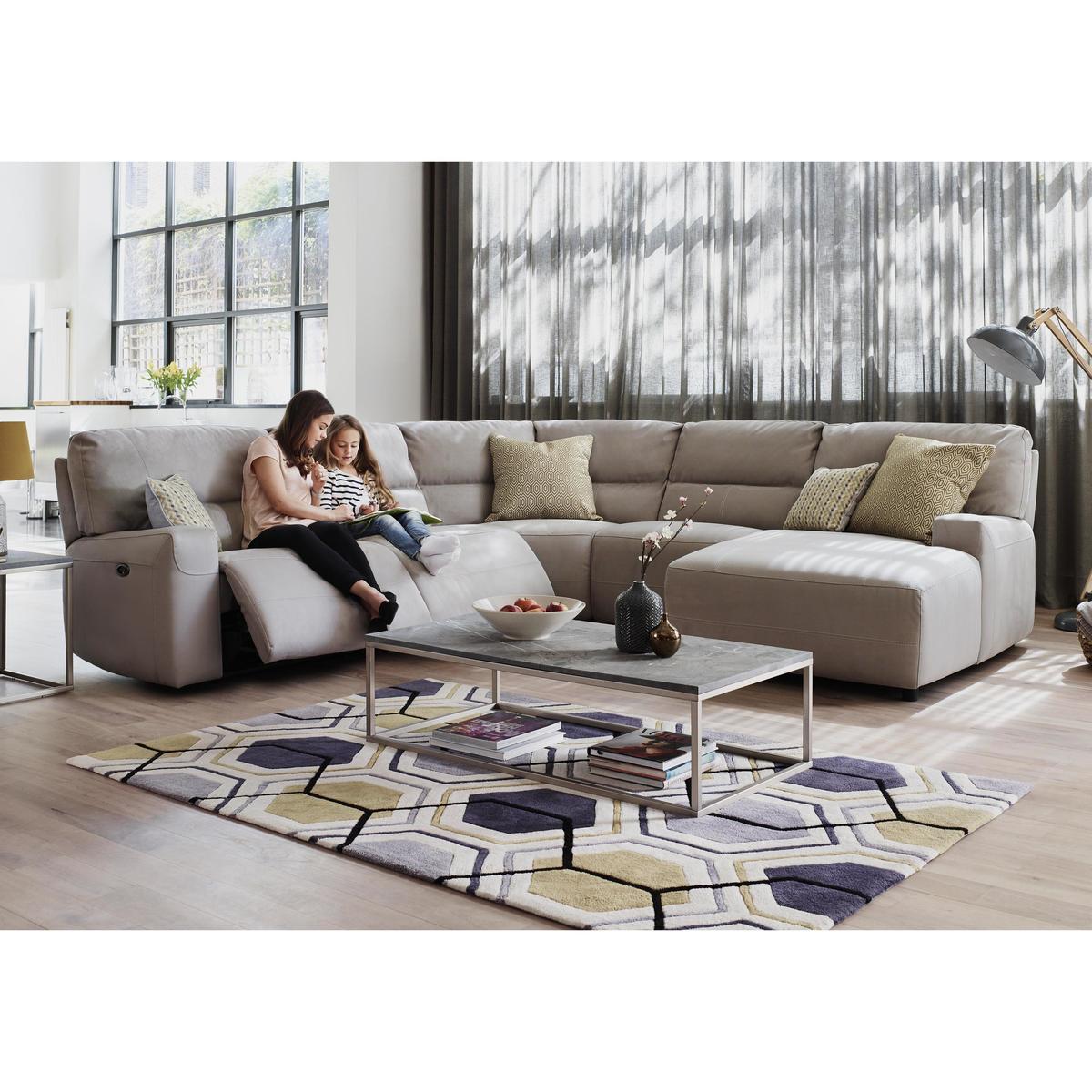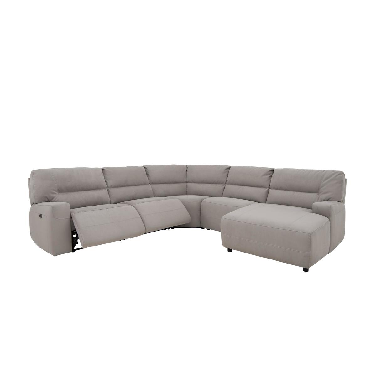 Beautifully cushioned corner chaise sofa has 2 recliners. Soft-touch fabric upholstery available in a choice of colours. Horizontal stitching creates extra padding for lumbar support. Sprung seats have foam and fibre top cushions for extra comfort. Luxury fibre back cushions and foam with fibre top arm pads. Available in manual or power recliner options. Wooden feet in a dark walnut finish. Choose right hand or left hand facing chaise. Now with higher density foam interiors, no-sag spring and stronger frames. Exclusive to Furniture Village