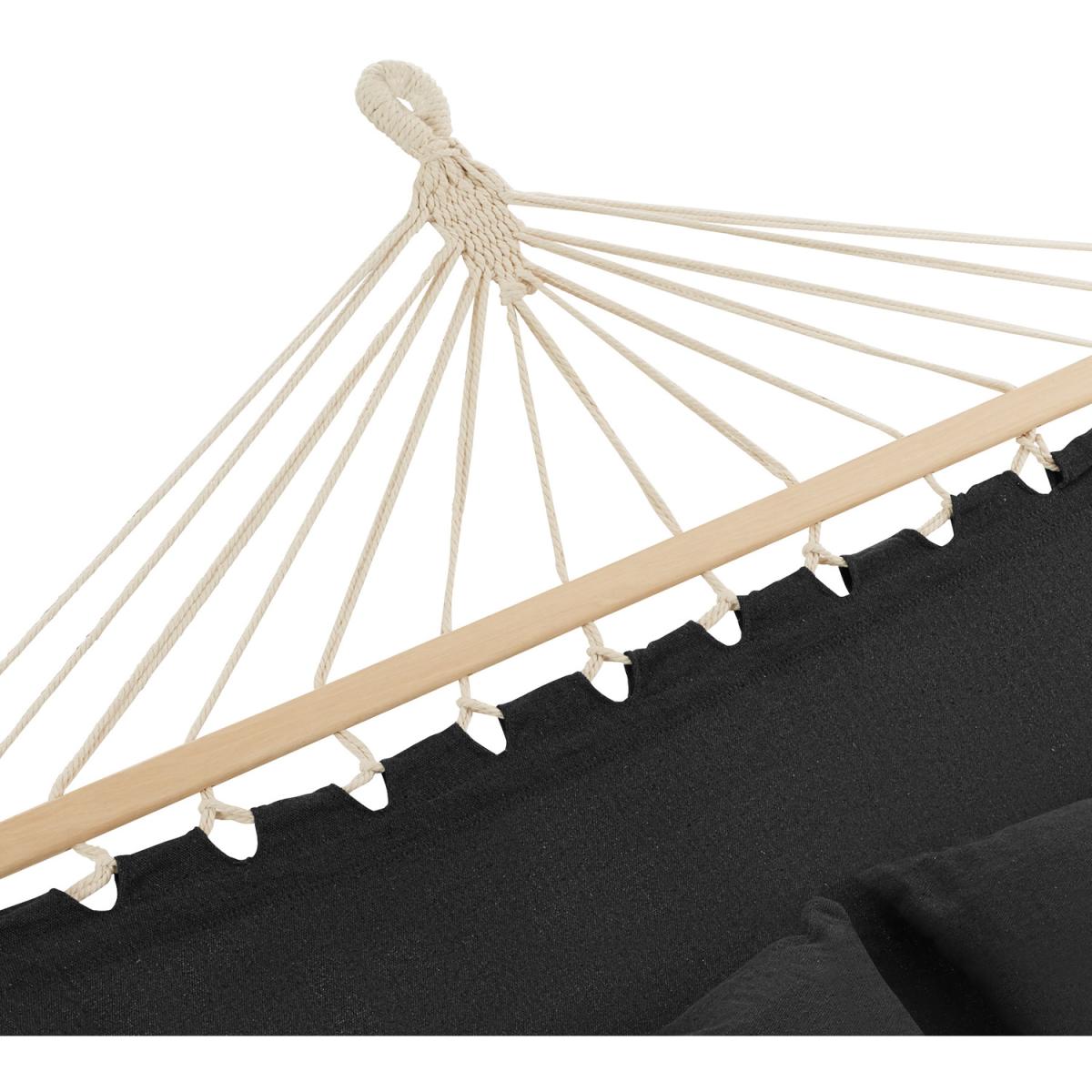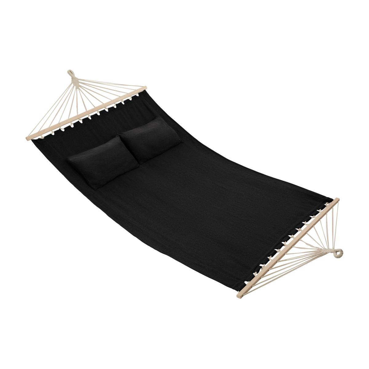 Enjoy moments of pure relaxation in this inviting hanging hammock from tectake. A high-quality cotton and polyester blend makes this back-friendly hammock exceptionally supple as well as extremely durable. The beechwood rods at the top and bottom keep the cloth taut, making it easy to get in and out of the hammock. Thanks to its spacious design and two soft cushions, this cosy double hammock is perfect for two people to cuddle up. Great to use at home or on camping and travel trips.