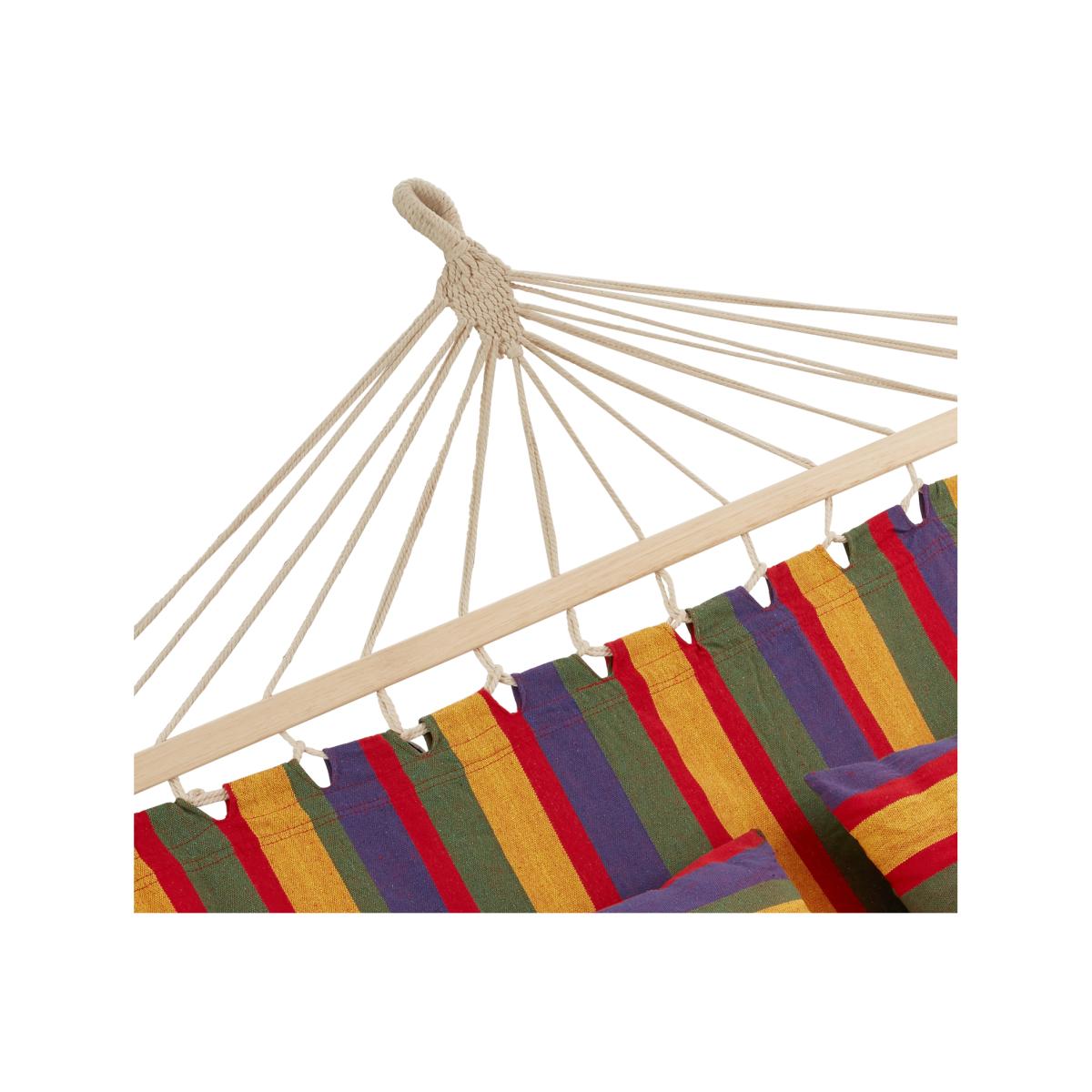 Enjoy moments of pure relaxation in this inviting hanging hammock from tectake. A high-quality cotton and polyester blend makes this back-friendly hammock exceptionally supple as well as extremely durable. The beechwood rods at the top and bottom keep the cloth taut, making it easy to get in and out of the hammock. Thanks to its spacious design and two soft cushions, this cosy double hammock is perfect for two people to cuddle up. Great to use at home or on camping and travel trips.
