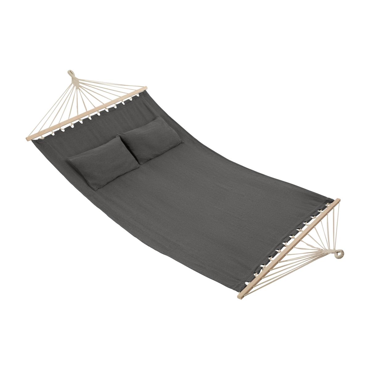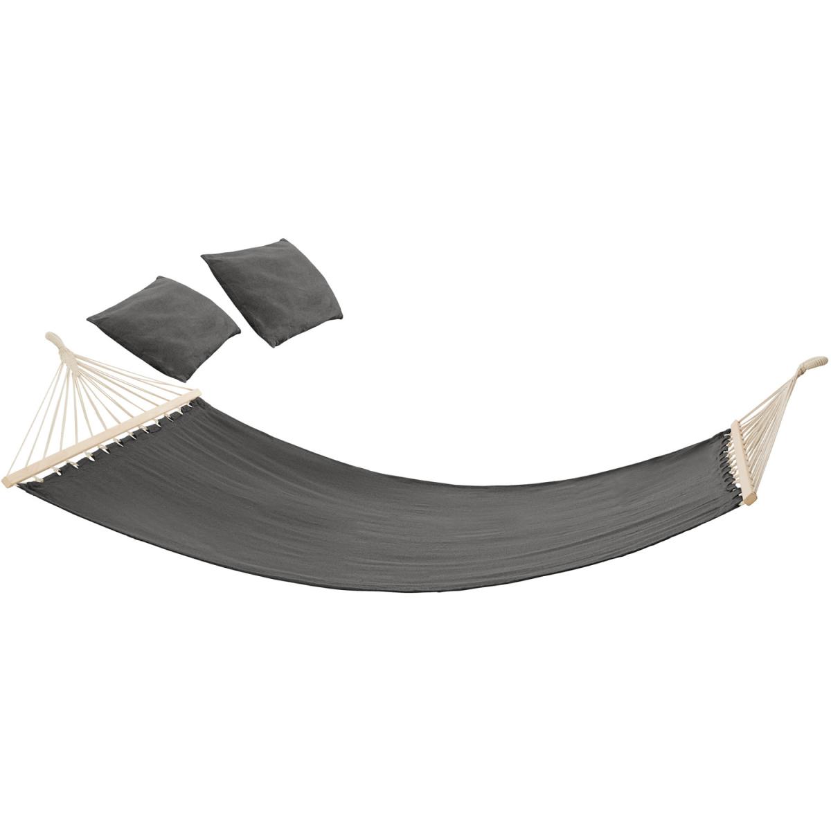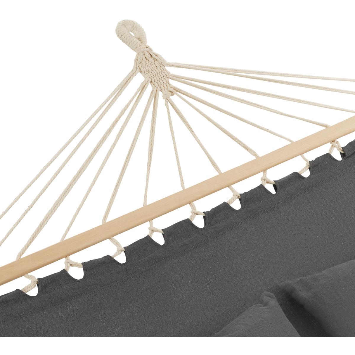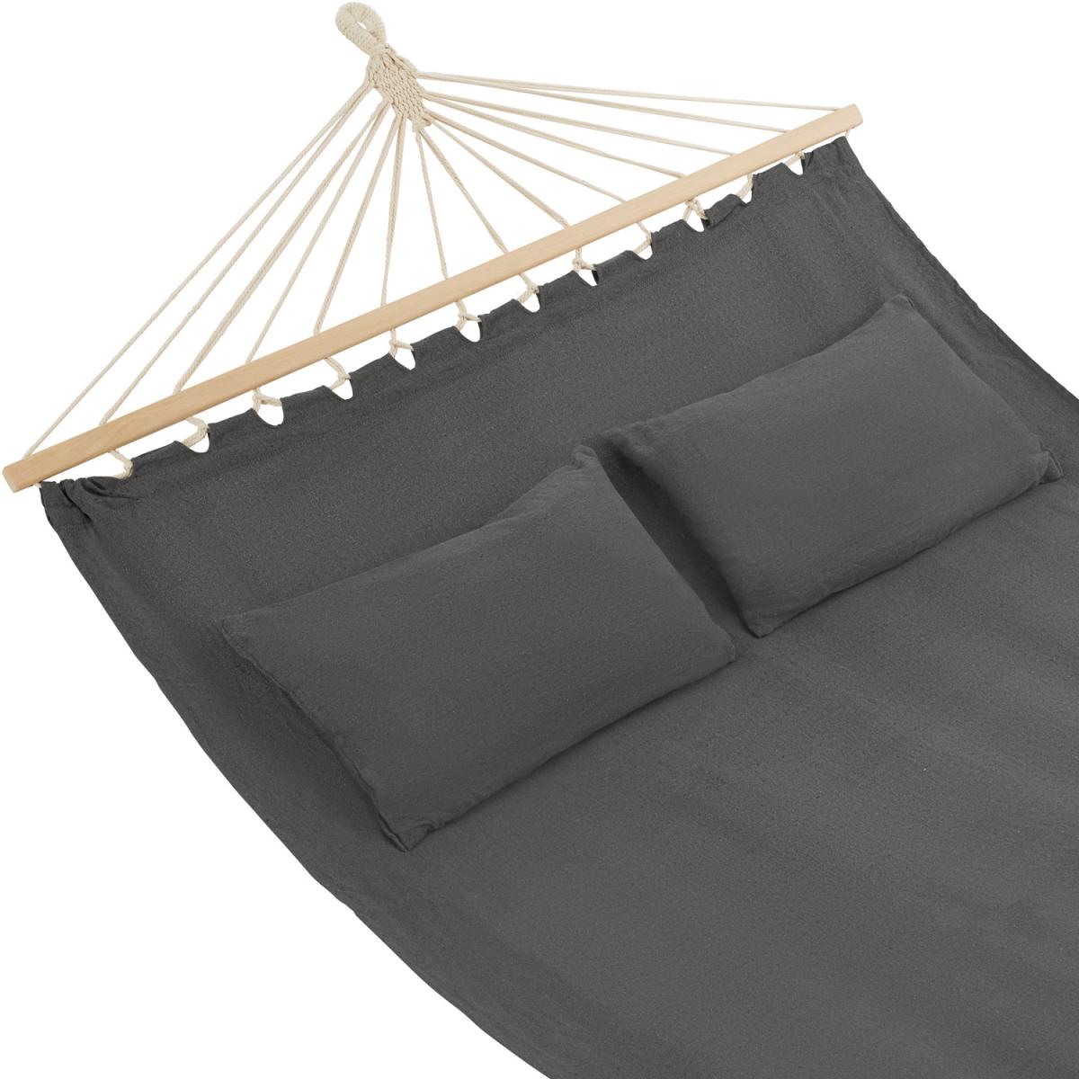 Enjoy moments of pure relaxation in this inviting hanging hammock from tectake. A high-quality cotton and polyester blend makes this back-friendly hammock exceptionally supple as well as extremely durable. The beechwood rods at the top and bottom keep the cloth taut, making it easy to get in and out of the hammock. Thanks to its spacious design and two soft cushions, this cosy double hammock is perfect for two people to cuddle up. Great to use at home or on camping and travel trips.