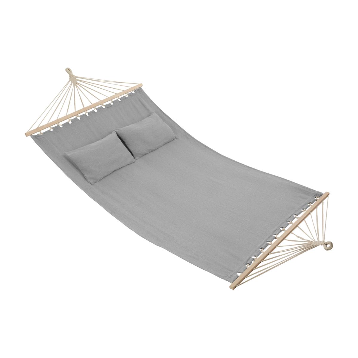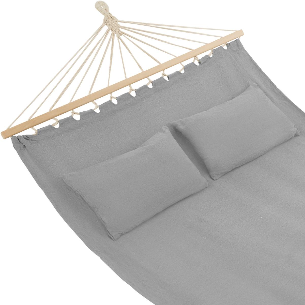 Enjoy moments of pure relaxation in this inviting hanging hammock from tectake. A high-quality cotton and polyester blend makes this back-friendly hammock exceptionally supple as well as extremely durable. The beechwood rods at the top and bottom keep the cloth taut, making it easy to get in and out of the hammock. Thanks to its spacious design and two soft cushions, this cosy double hammock is perfect for two people to cuddle up. Great to use at home or on camping and travel trips.