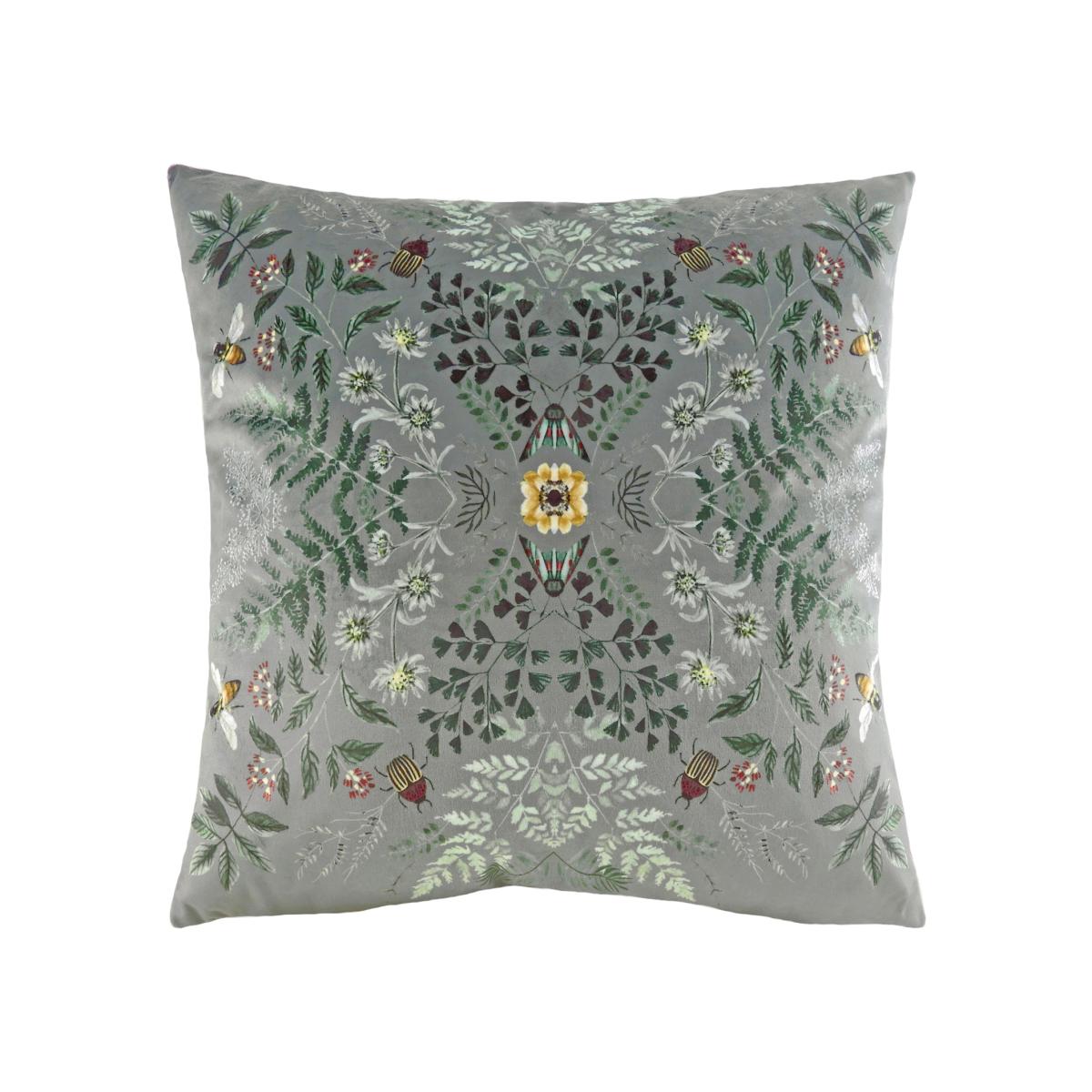 The perfect combination of botanics and insects this perfectly symmetrical and mirrored design is balanced an intricate. Printed onto a soft grey faux-velvet making this cushion a beautiful addition to your bedroom or living room, pair with other rich colours and luxe finishes for a sophisticated feel.