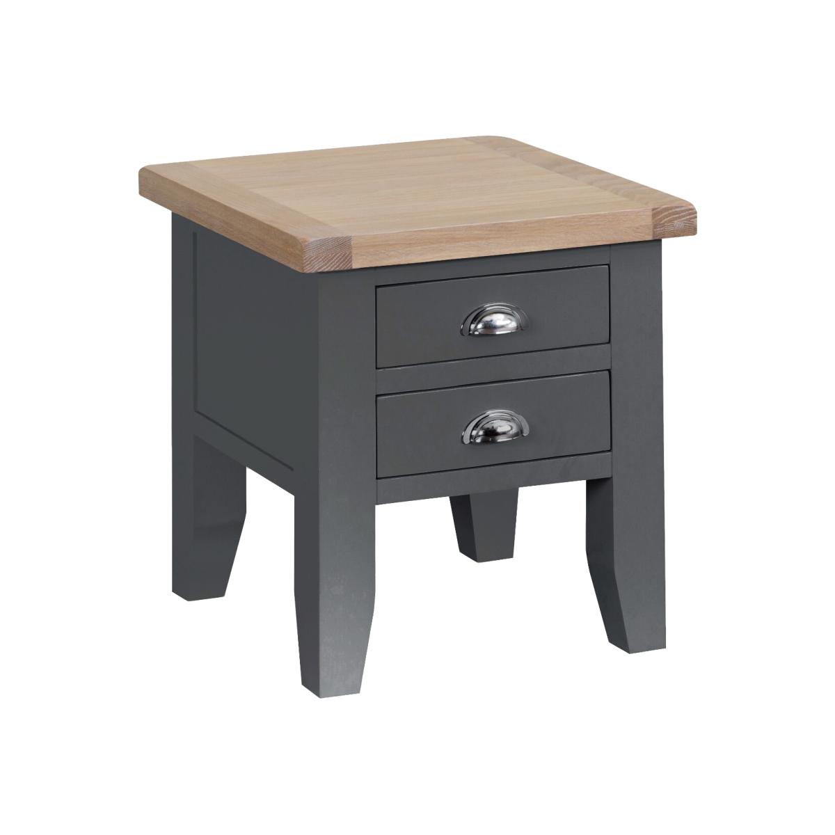 Versatile in size and design, the Eden Side Table features a Grey painted finish, a functional square shape, a soft lime washed oak top and multiple storage options. Boasting a small sliding drawer on metal runners and additional low shelf, with modern shining chrome details. Featuring a versatile square shape making it ideal as a Side Table or Lamp Table With a smooth lime washed top and Grey washed finish for a unique and stylish colour combo Crafted in quality solid oak for a sturdy, quality piece to last An additional 16cm lower shelf offers further storage Chrome details add a modern charm Designed to match the full Eden Oak and Grey range