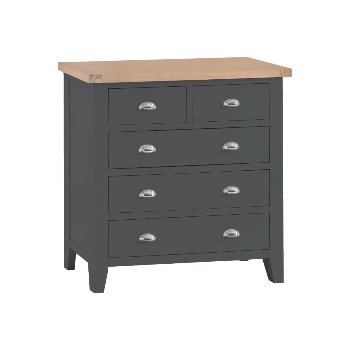 The two-toned Eden collection enhances modern rooms. Warm lime-washed oak shows the beauty of the natural grain and contrasts with contemporary charcoal paint. Five drawers sit sleekly in the solid frame, ready to be filled with your favourite clothes. Oak, oak veneer, plywood, pine and MDFGorgeous lime-washed oak top. Drawers with metal runners and chrome cup handles. Modern charcoal painted finish