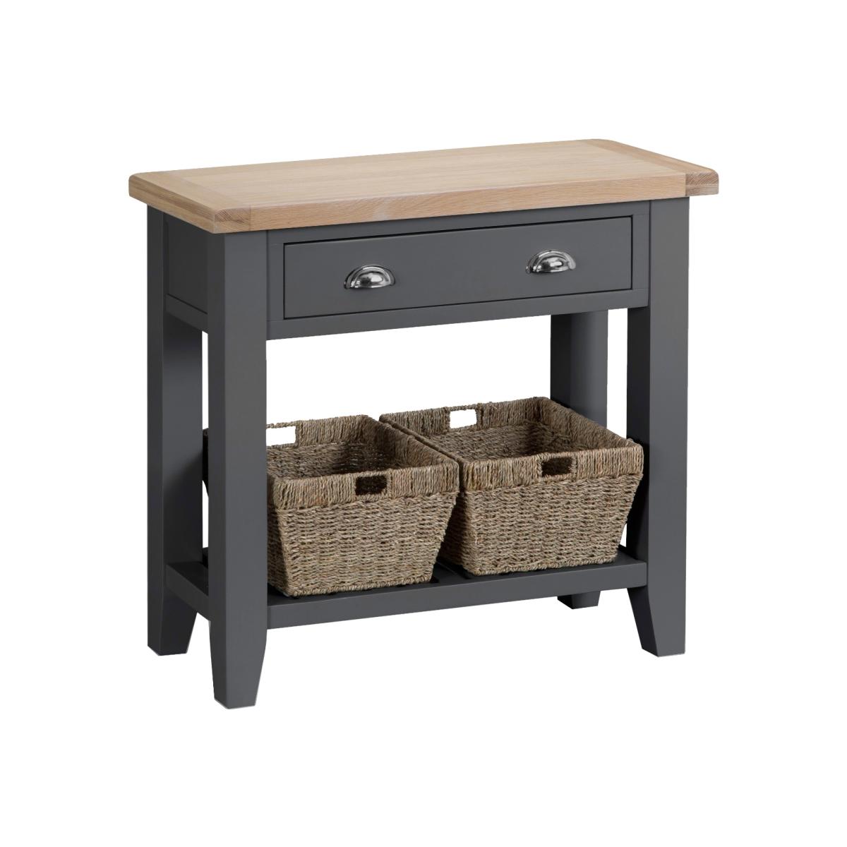 The two-toned Eden collection enhances modern rooms. Warm lime-washed oak shows the beauty of the natural grain and contrasts with contemporary charcoal paint. This stunning combination of styles allows the console to look great in different hallways or living rooms. Add decorative baskets, books or vases to personalise it further. Oak, oak veneer, plywood, pine and MDFGorgeous lime-washed oak top. Lower storage shelf Modern charcoal painted finish