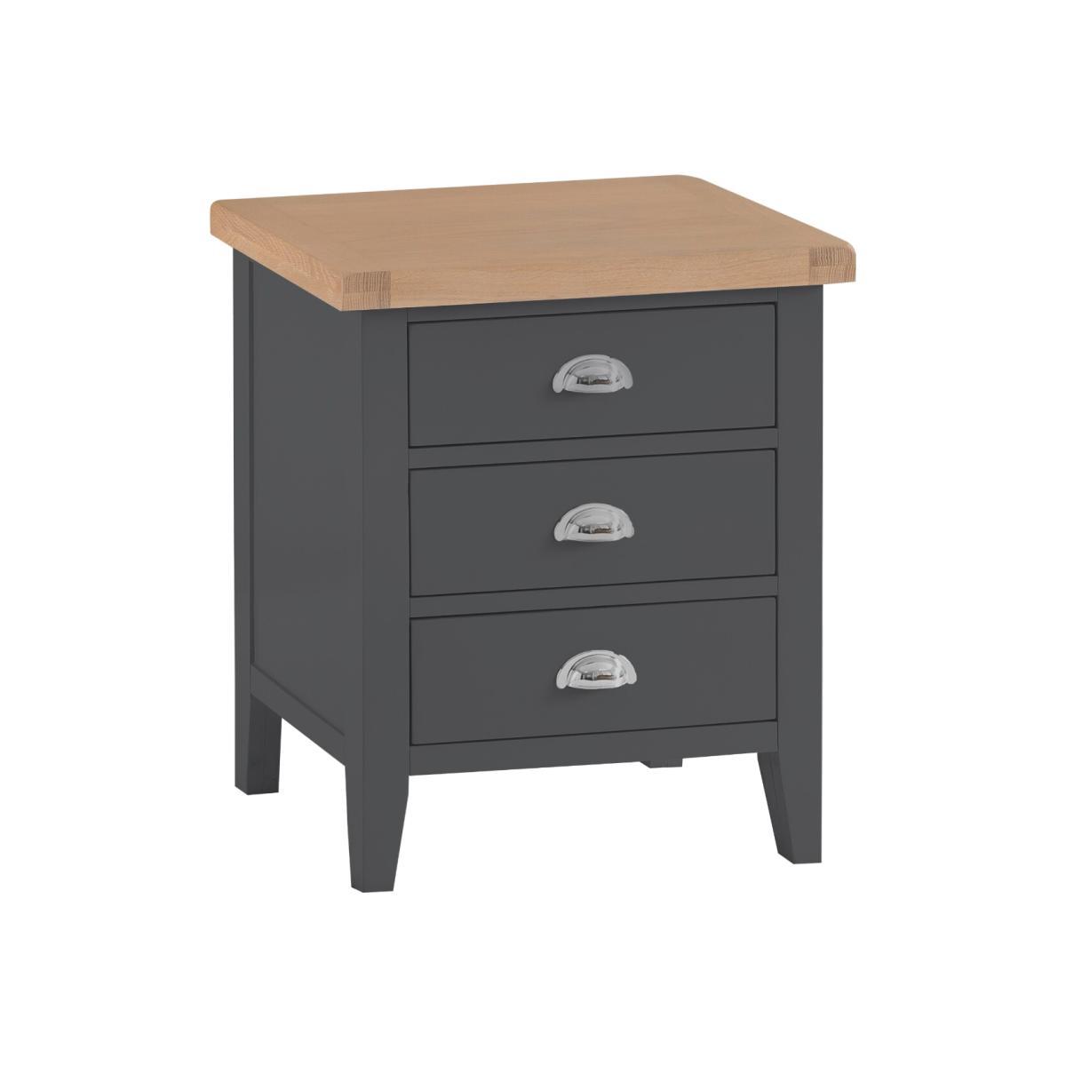 Bring classic style with a touch of contemporary flair to your bedroom with the Eden Oak and Grey Extra Large 3 Drawer Bedside Table. The extra-large bedside table features plenty of storage space thanks to its drawers and is complete with chrome cup handles. Stylish and practical extra-large bedside table Attractive two-toned design with lime washed oak top and grey painted frame Three drawers on metal guides Chrome cup handles complete the look Matching items from the Eden bedroom furniture range available