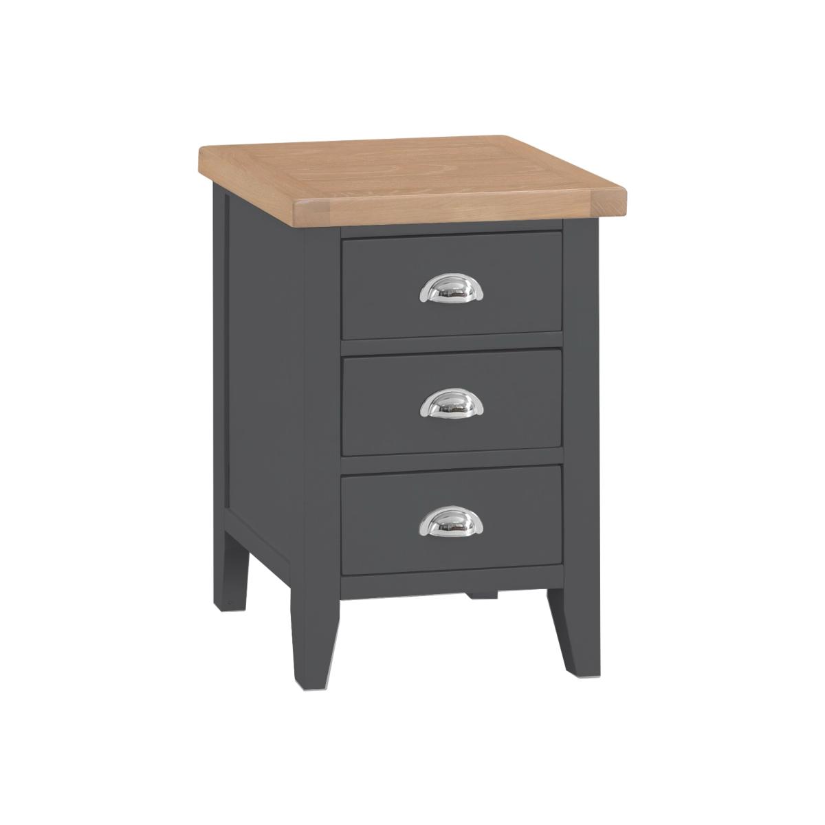 The two-toned Eden collection enhances modern rooms. Warm lime-washed oak shows the beauty of the natural grain and contrasts with contemporary charcoal paint. Three drawers are useful to keep eye-masks, kindles and other essentials near to hand during the night. Oak, oak veneer, plywood, pine and MDFGorgeous lime-washed oak top. Drawers with metal runners and chrome cup handles. Modern charcoal painted finish