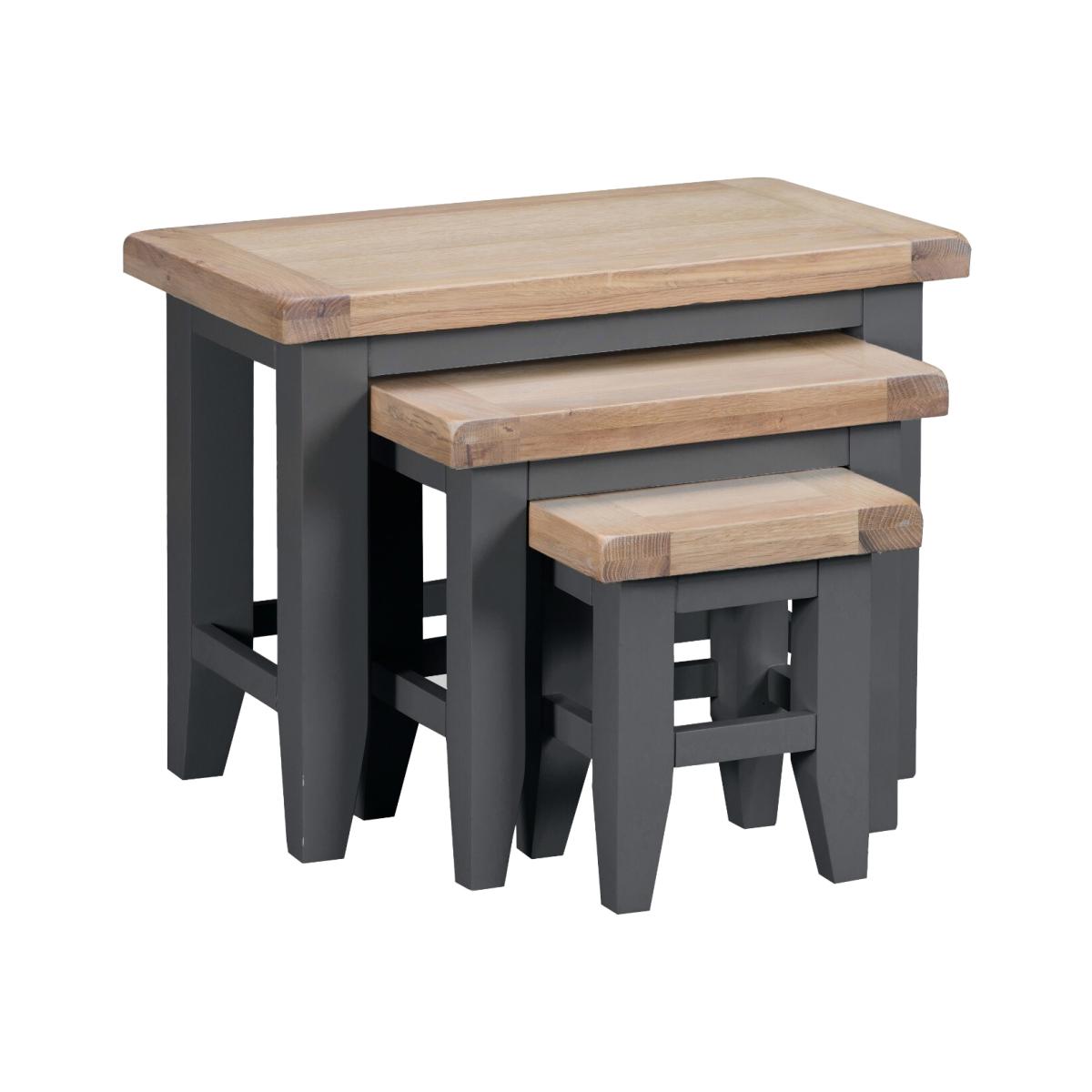 Minimal and stylish, the Eden Nest of 3 Tables feature smooth, lime washed oak table tops and Grey painted sturdy frames, versatile rectangular and square shapes that conveniently stack together for effortless storage, and strong oak legs. Space saving and elegant, for multi-use around the home. Crafted in a sturdy solid oak for style that lasts Designed to easily stack on top of one another for minimal fuss, space-saving storage Grey painted frames update a timeless oak design Minimal and versatile for styling in all types of home 3 sizes of table means there’s a height and size for all needs Deigned to match the full Eden collection