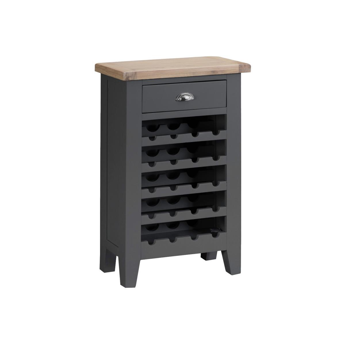 The two-toned Eden collection enhances modern rooms. Warm lime-washed oak shows the beauty of the natural grain and contrasts with contemporary charcoal paint. This unique design helps you store up to twenty bottles and had a useful drawer for corkscrews and mats. Materials used are oak, oak veneer, plywood, pine and MDFGorgeous lime-washed oak top. Storage for twenty bottles of your favourite wines Modern charcoal painted finish