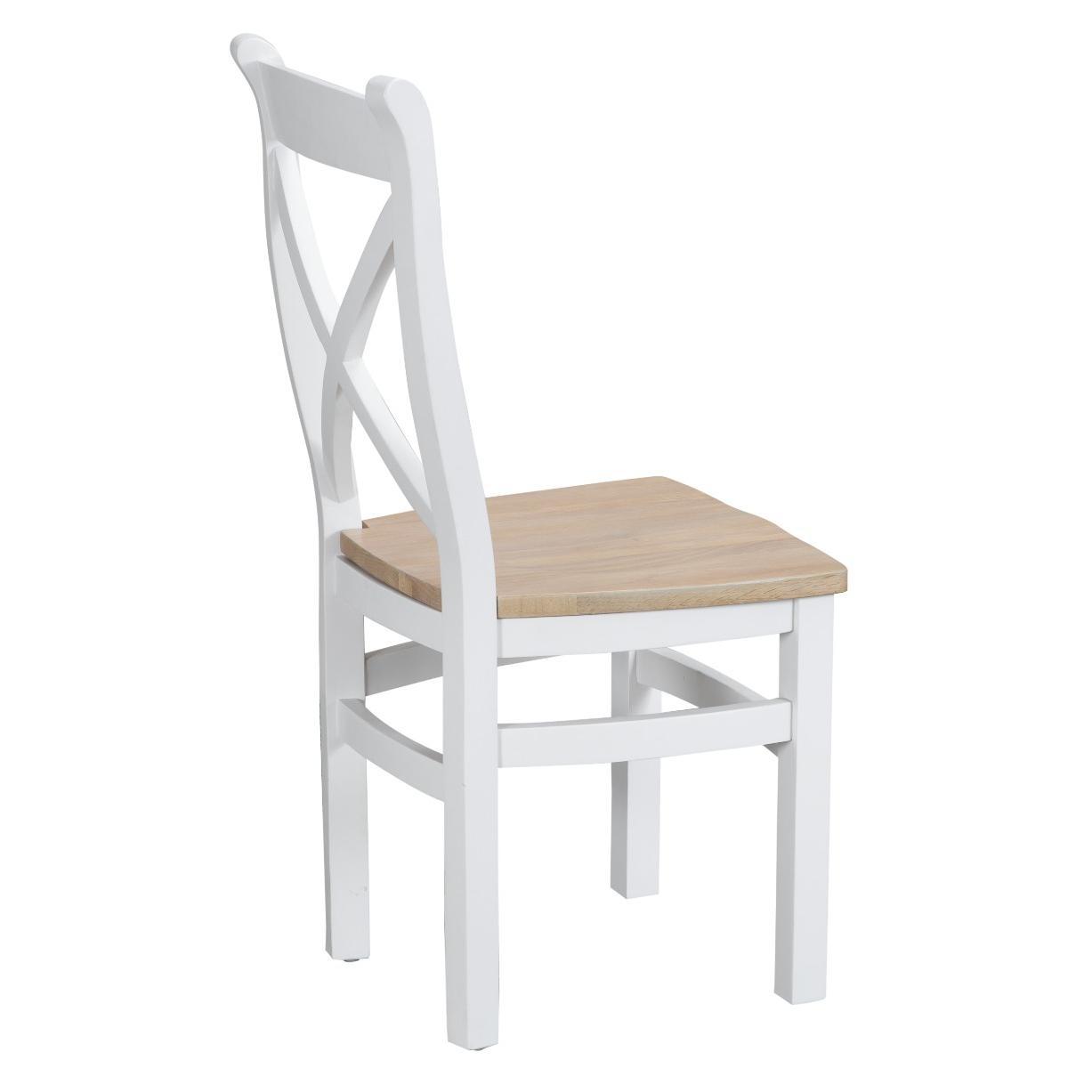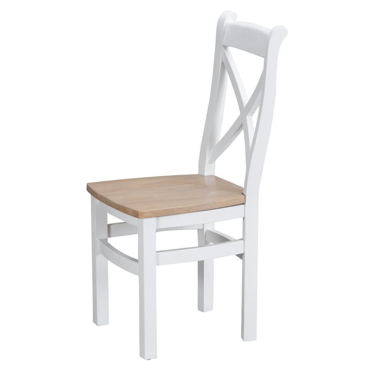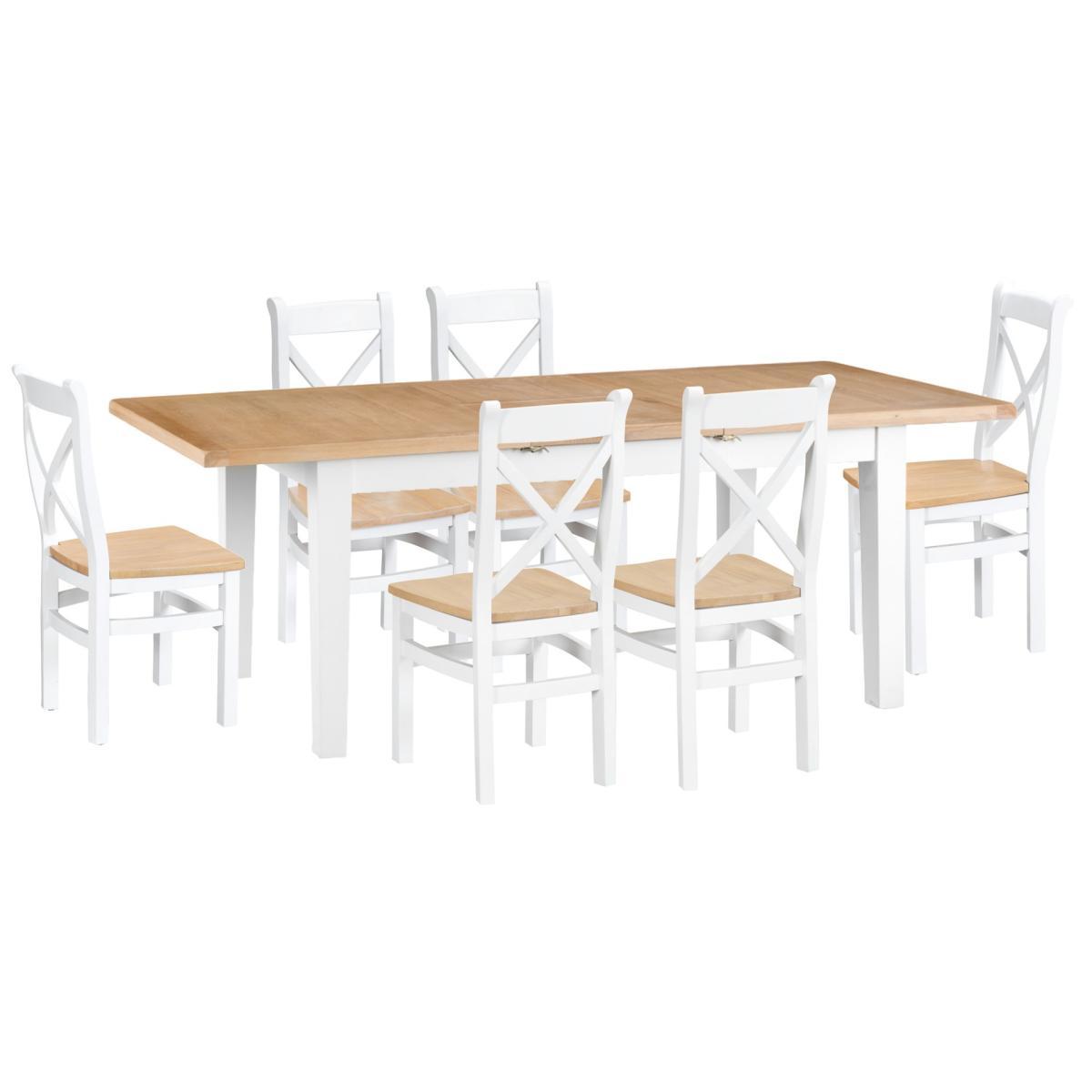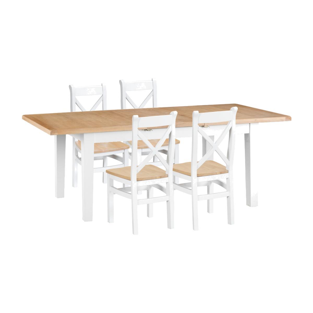 In a white and natural oak colour combination, elegant and versatile Eden Extending Table with its fresh painted white frame and minimal design features a contrasting soft lime washed oak tabletop that extends via a smooth and effortless butterfly mechanism. Teamed with the complementing Cross Back chairs, with their matching natural oak seats, it’s a set ideal for smaller family dining, that still offers the option of a larger option when needed. Crafted in quality solid oak for style that lasts. A white painted finish to the set adds charm. The table extends via a smooth butterfly mechanism via an aluminium ball-bearing runner for a larger dining option. Table extends from 160cm to 210cm. Table reaches 78cm in height. Chairs are sturdy and supportive, with high crossed backs. Stylish and versatile, for easy styling into all types of homes. Also available: The 160cm Eden Extending Table with Cross Back Chairs with Fabric Seats, Ladder Back Chairs and Ladder Back Chairs with Fabric Seats