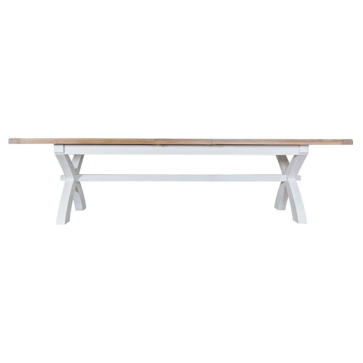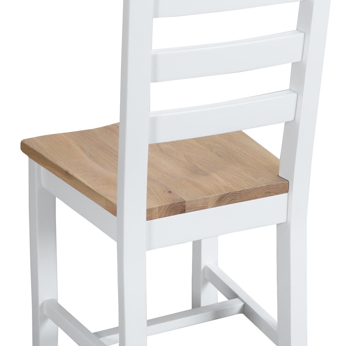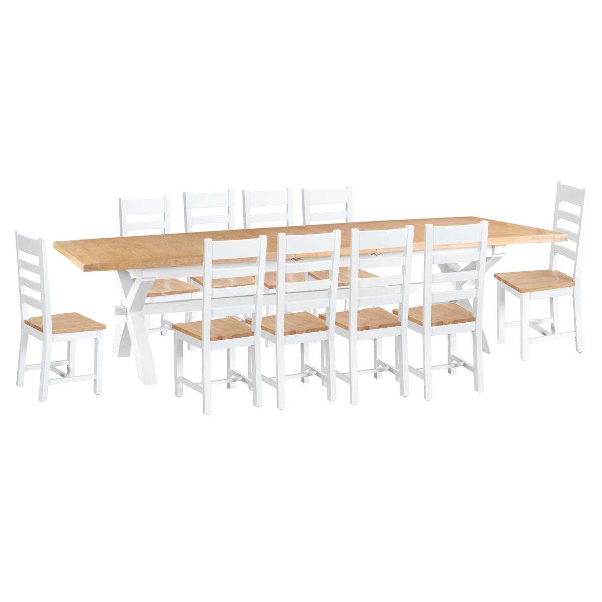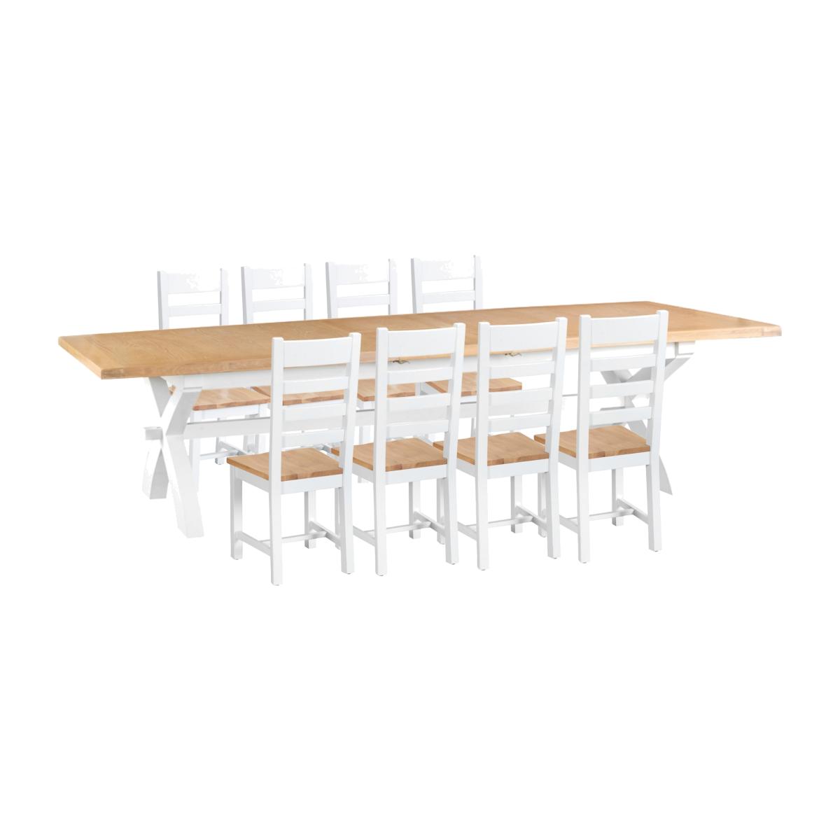 In fresh and minimal white and natural oak colour combo, the large and charming 250cm Eden Extending Table with its sturdy painted white frame features a soft lime washed oak tabletop that extends an additional 50cm via a smooth and effortless butterfly mechanism. Teamed with the supportive Ladder Back chairs, with their matching oak seats, it’s a set ideal for larger dining spaces, which also offers the option of an even longer length. Designed for full family homes, and those that love to host. Crafted in quality solid oak for style that lasts. A white painted finish to the set adds charm. The table extends via a smooth butterfly mechanism via an aluminium ball-bearing runner for a larger dining option. Table extends from 250cm to 300cm, for the largest dining option. Chairs are sturdy, with high crossed backs for support. Also available: The 250m Eden Extending Table with Cross Back Chairs with Fabric Seats, Cross Back Chairs and Ladder Back Chairs with Fabric Seats