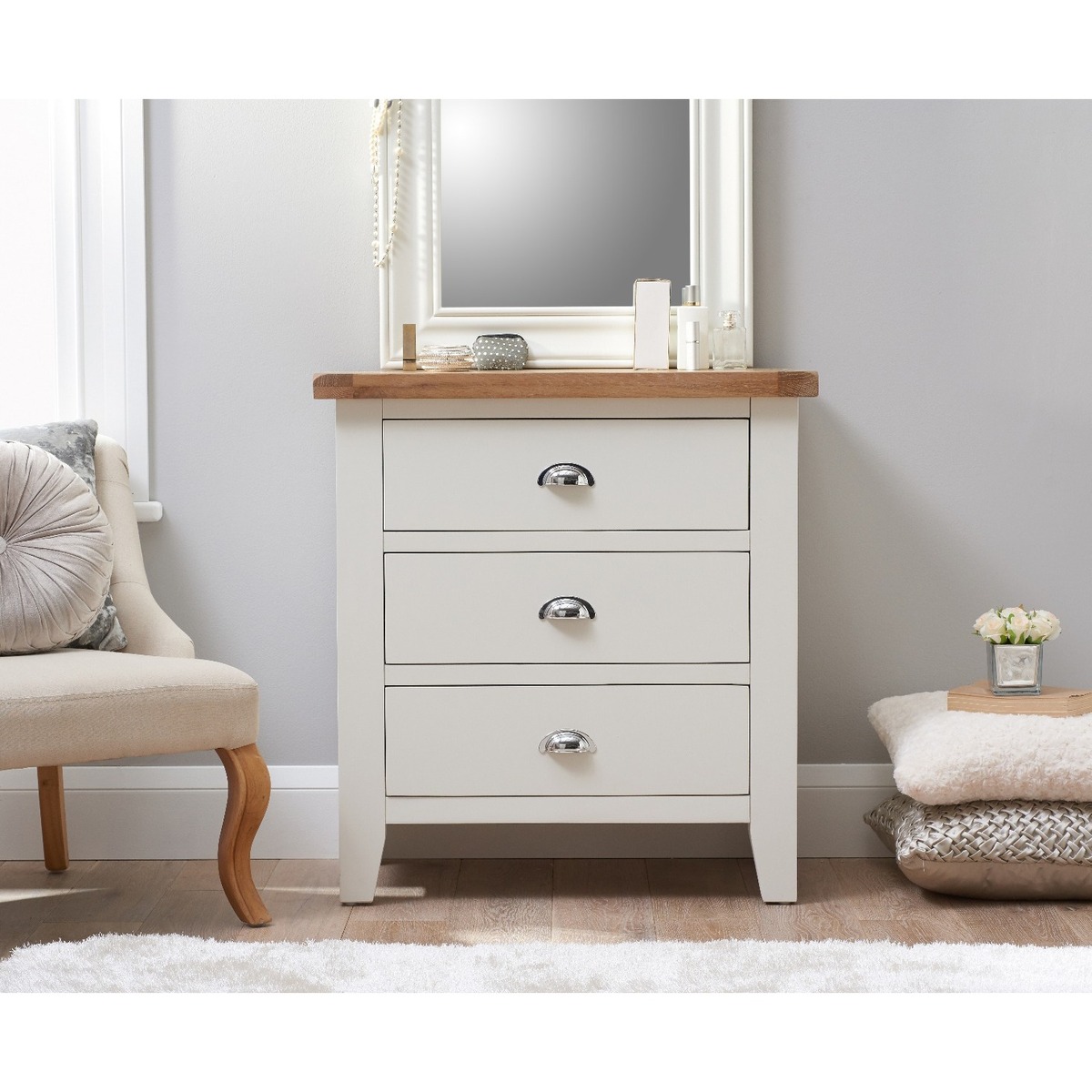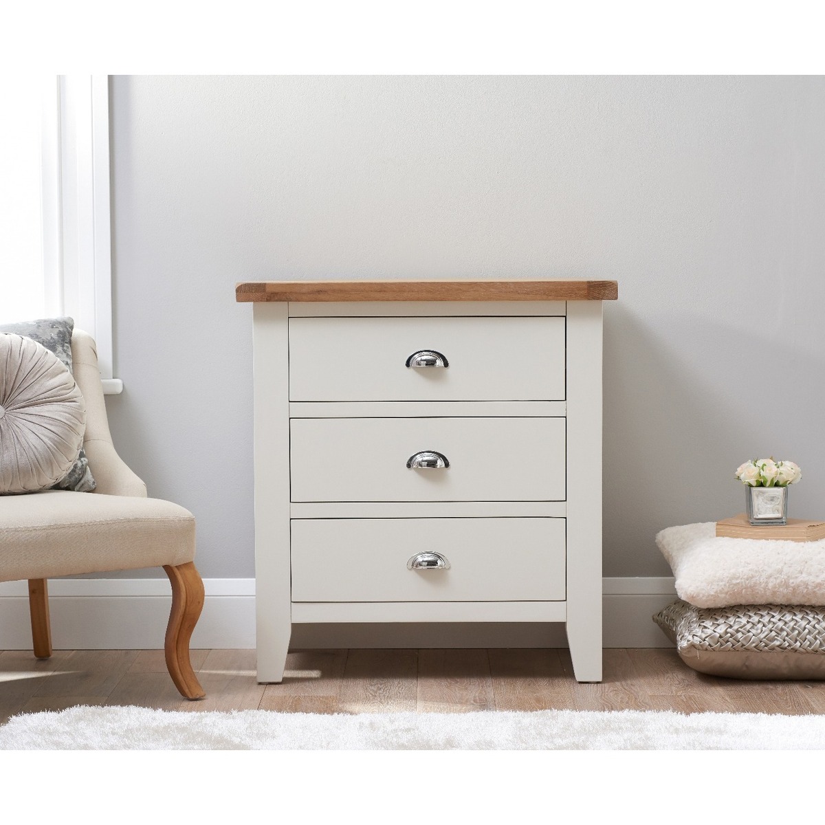 The Eden Oak and White 3 Drawer Chest is a stylish and practical bedroom storage solution. Featuring a stunning two-toned oak and white painted finish, the 3 drawer chest makes an impression in any bedroom setting. Stylish and practical 3 drawer chest. Attractive two-toned design with limewashed oak top and white painted frame. 3 drawers on metal guides. Chrome cup handles complete the look. Matching furniture available from the Eden bedroom furniture collection.