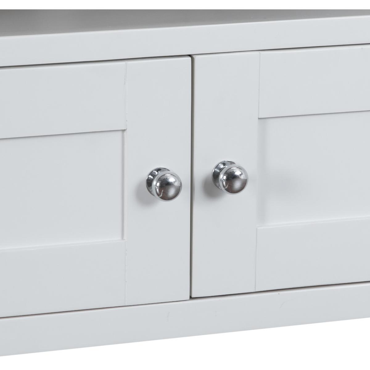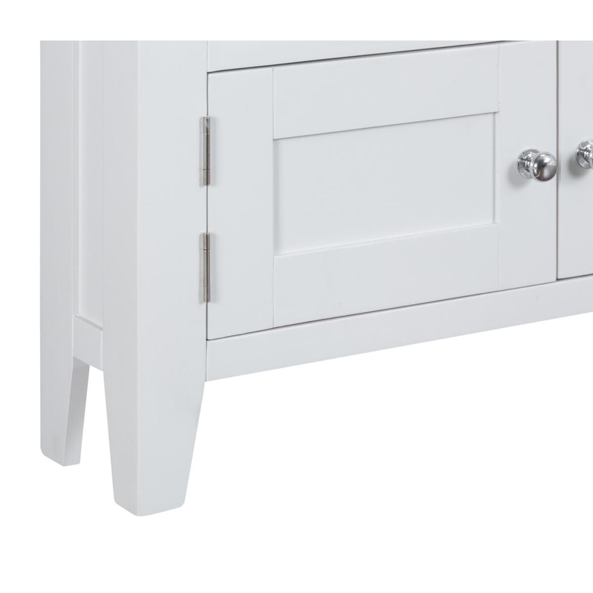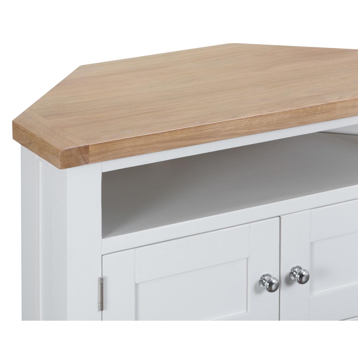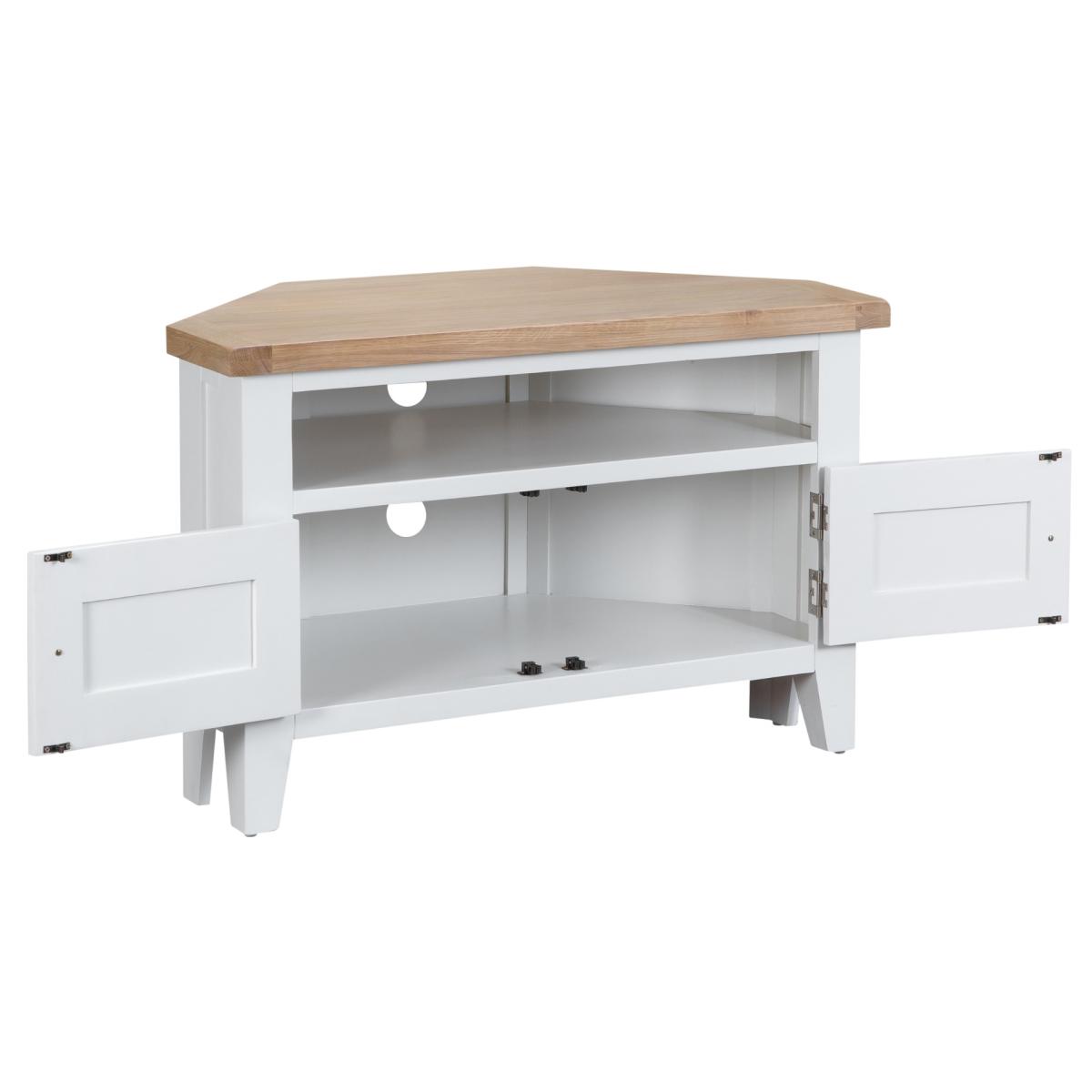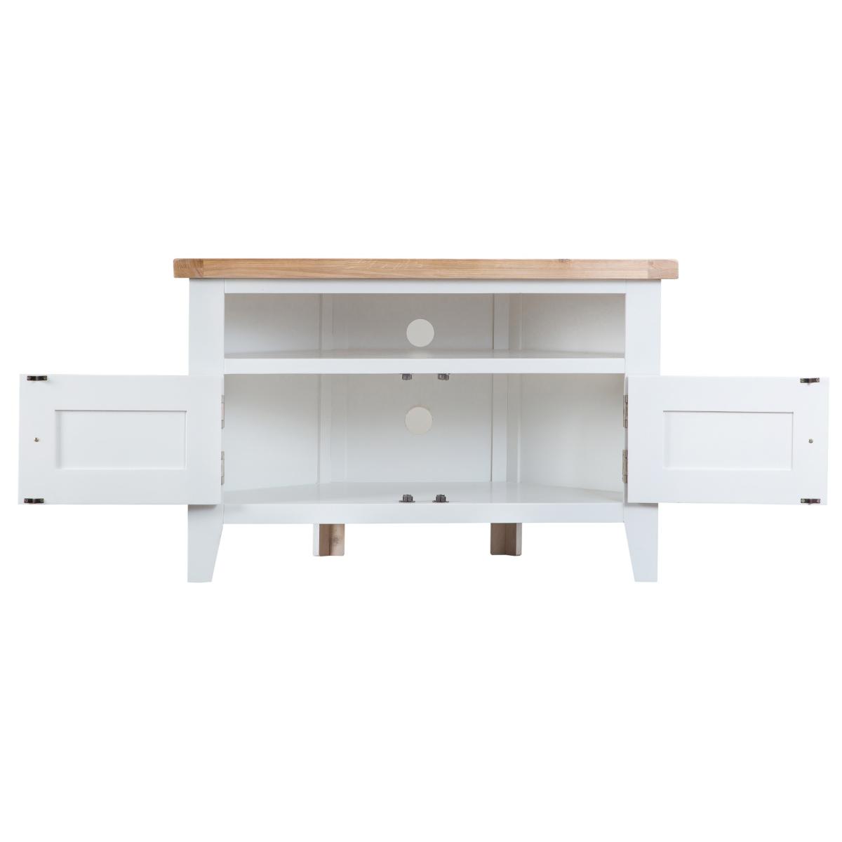 Crafted from a quality oak in a white painted finish, the Eden Oak and White Corner TV Unit features a corner-friendly shape with an open shelf for media items and a bottom cupboard with two chrome-handled doors. Perfect for styling in all homes and spaces needing a corner-designed base for their TV, plus extra storage. Made from solid oak for a sturdy, quality piece to last. Painted in a fresh, stylish white for an elegant take on a classic. Designed to fit effortlessly into room corners. With a slim open shelf for media storage, and holes for all cables to the back. A double-door cupboard with magnetic closure offers hidden storage. Finished with modern chrome handles. Designed to match the Eden collection