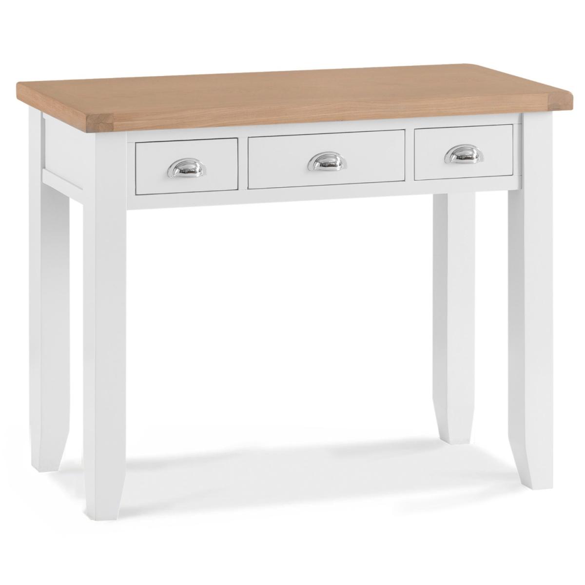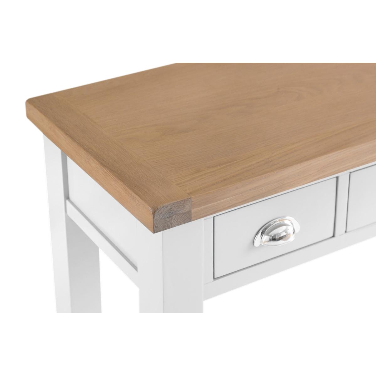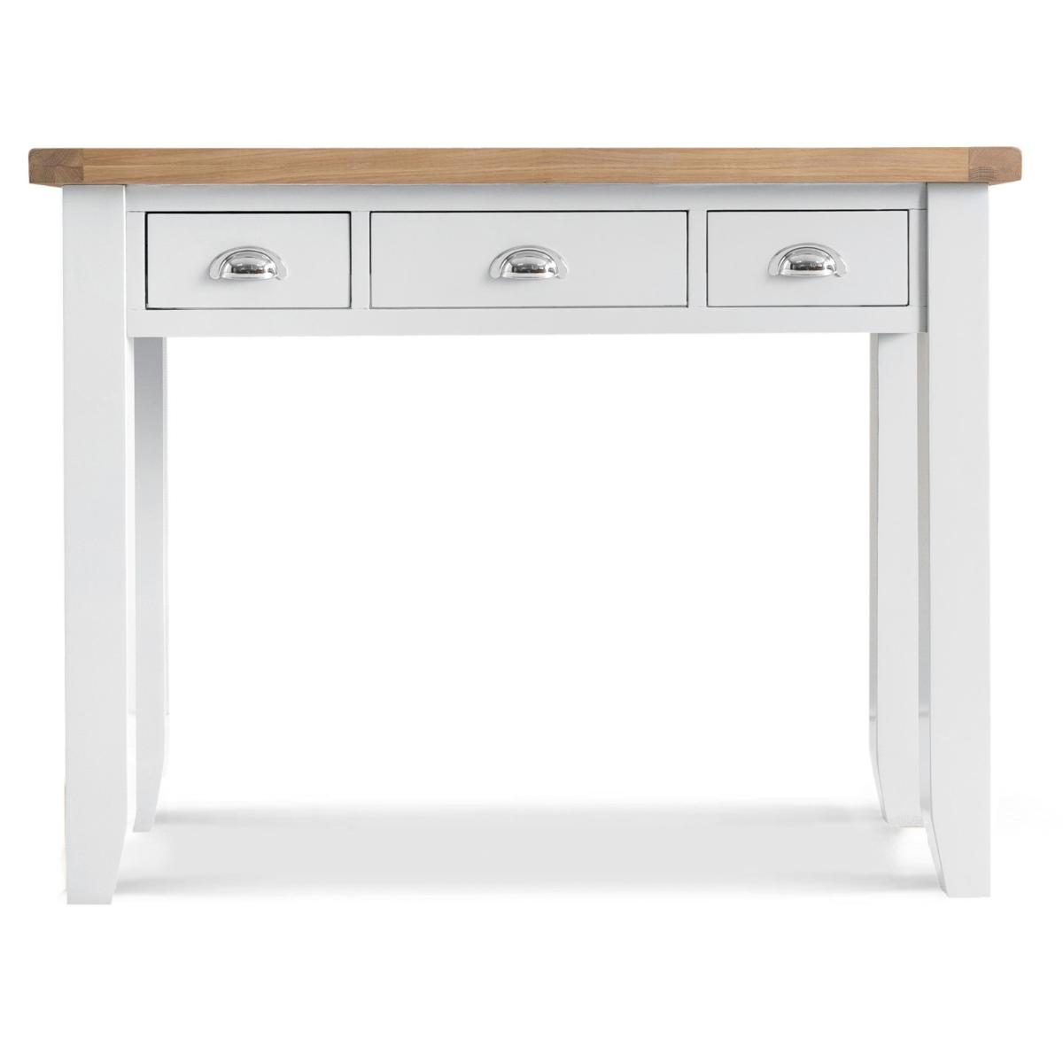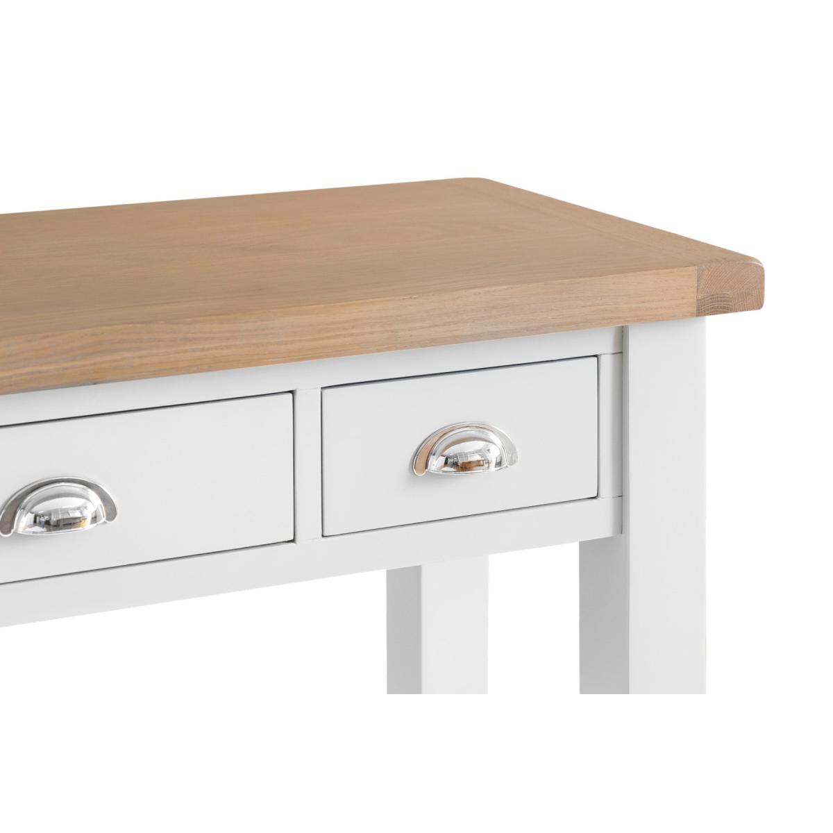 The Eden Oak and White Dressing Table is a stunning blend of contemporary and classic style. The perfect finishing touch for your bedroom setting, the oak and white dressing table features a stunning two-toned design and is complete with 3 handy drawers. Stylish and practical dressing table. Stunning two-toned design with lime washed oak top and white painted frame3 handy drawers on metal guides are perfect for storing makeup and trinkets. Chrome cup handles complete the look. Complements other pieces in the Eden bedroom furniture range