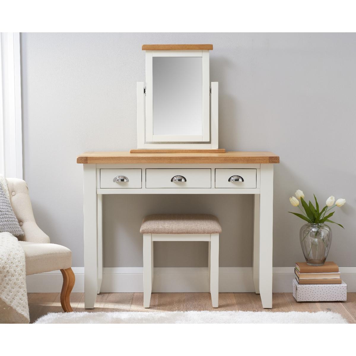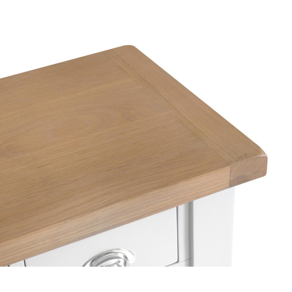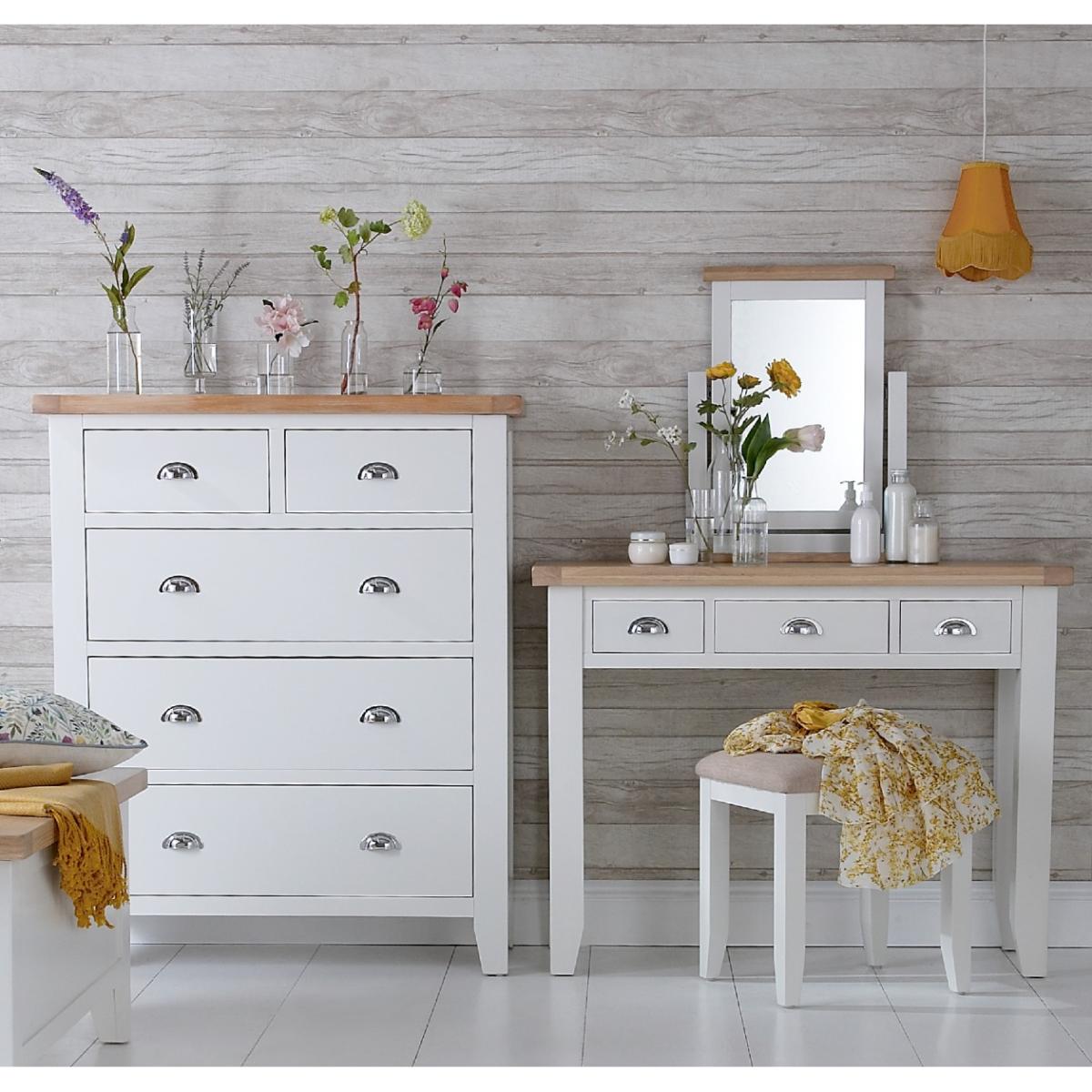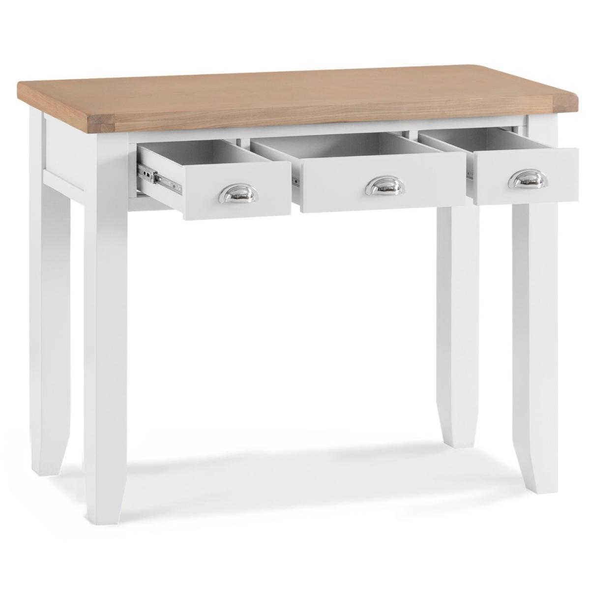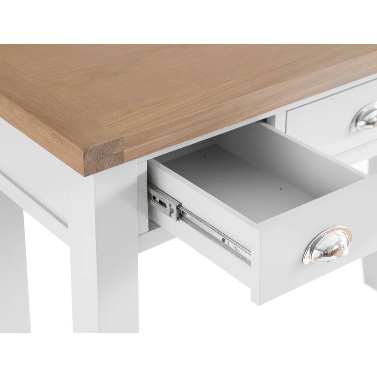 The Eden Oak and White Dressing Table is a stunning blend of contemporary and classic style. The perfect finishing touch for your bedroom setting, the oak and white dressing table features a stunning two-toned design and is complete with 3 handy drawers. Stylish and practical dressing table. Stunning two-toned design with lime washed oak top and white painted frame3 handy drawers on metal guides are perfect for storing makeup and trinkets. Chrome cup handles complete the look. Complements other pieces in the Eden bedroom furniture range