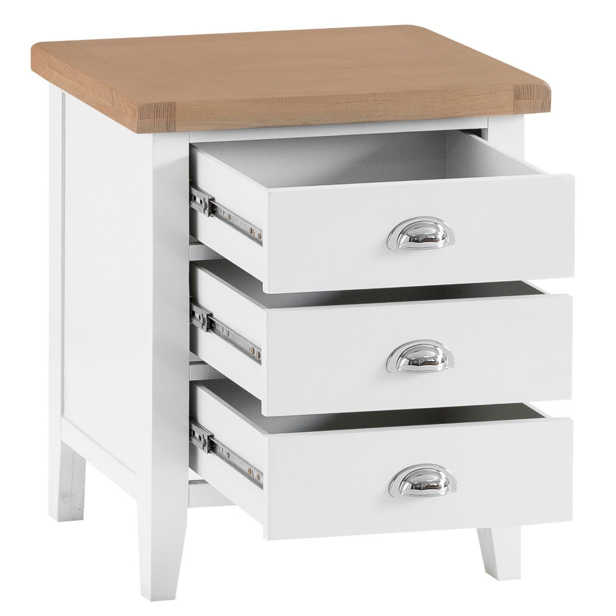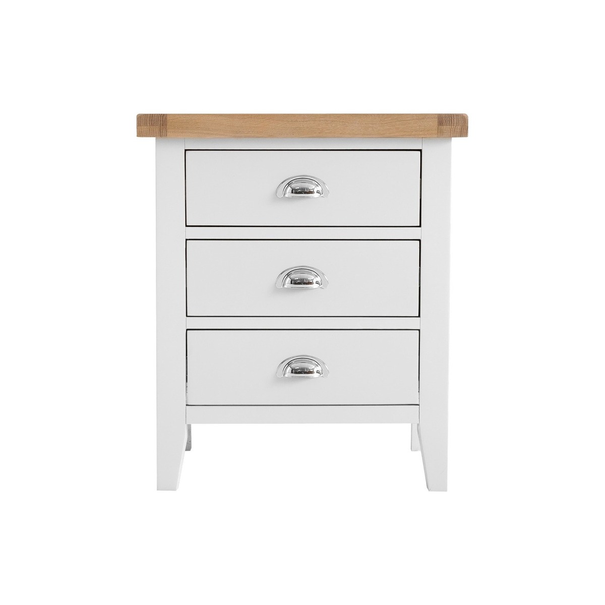 Bring classic style with a touch of contemporary flair to your bedroom with the Eden Oak and White Extra Large 3 Drawer Bedside Table. The extra-large bedside table features plenty of storage space thanks to its drawers and is complete with chrome cup handles. Stylish and practical extra-large bedside table. Attractive two-toned design with lime washed oak top and white painted frame. Three drawers on metal guides. Chrome cup handles complete the look. Matching items from the Eden bedroom furniture range available.