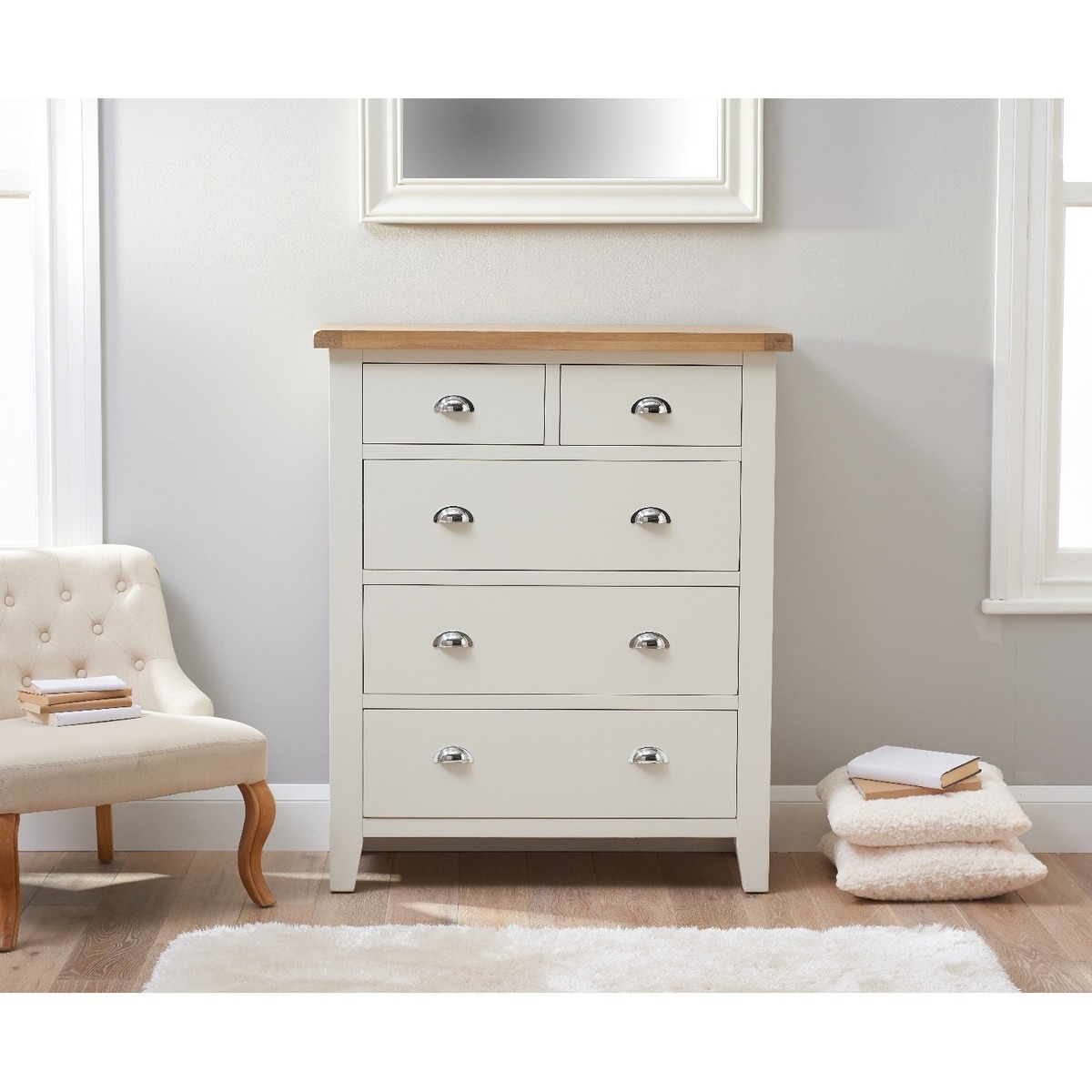 The Eden Oak and White Large 2 Over 3 Chest of Drawers is a stylish and practical storage option for your bedroom. Featuring an attractive two-toned finish, the large chest of drawers is complete with 2 small drawers over 3 large drawers. Stylish large chest of drawers. Stunning two-toned design with lime washed oak top and white painted frame. 5 drawers on metal guides for storing your clothing. Chrome cup handles complete the look. Look out for more from the Eden bedroom range.