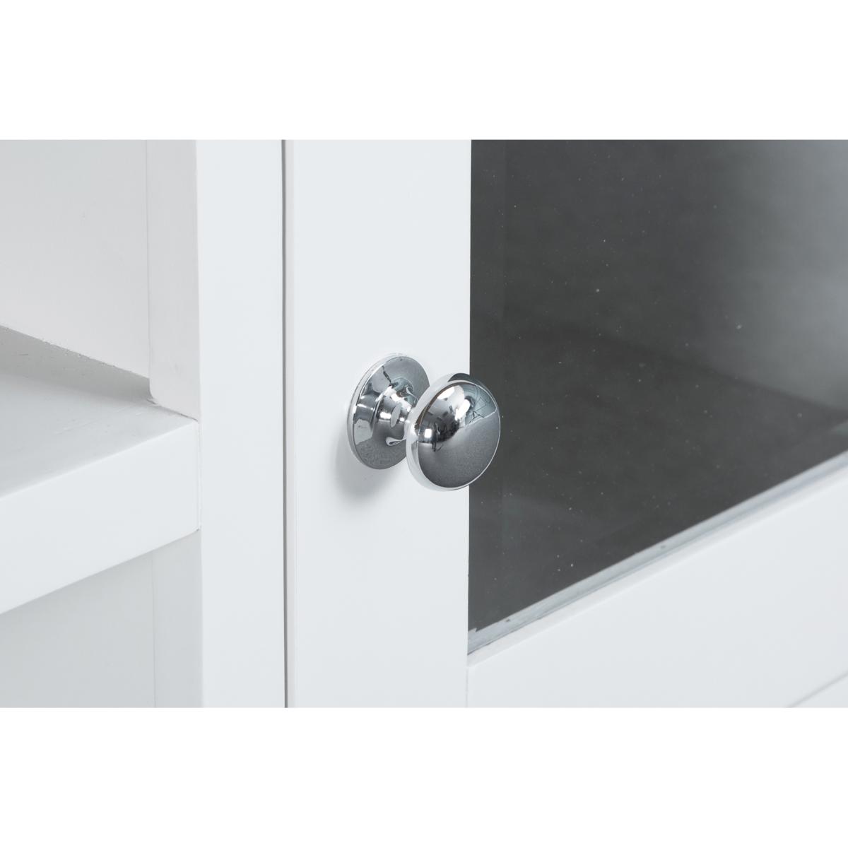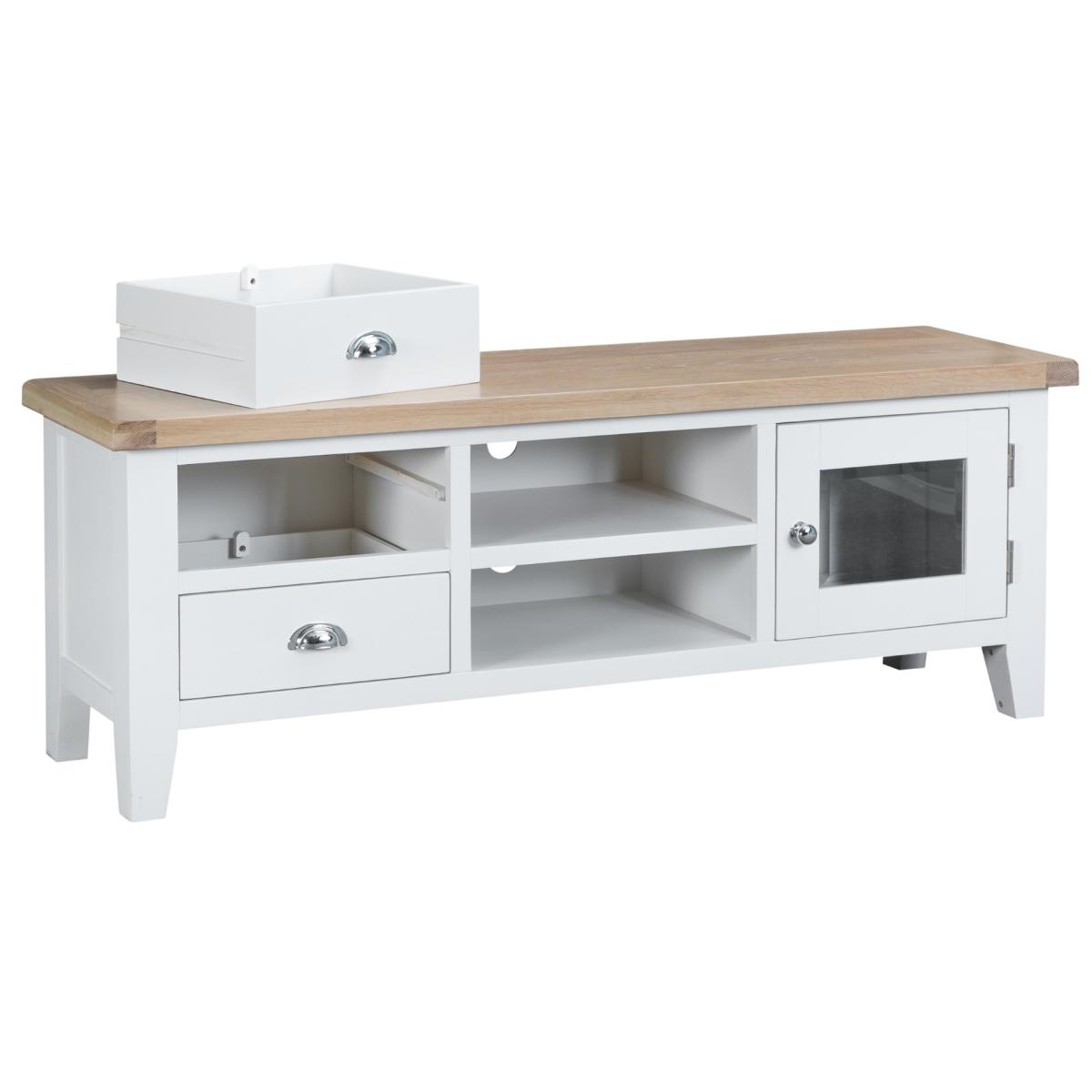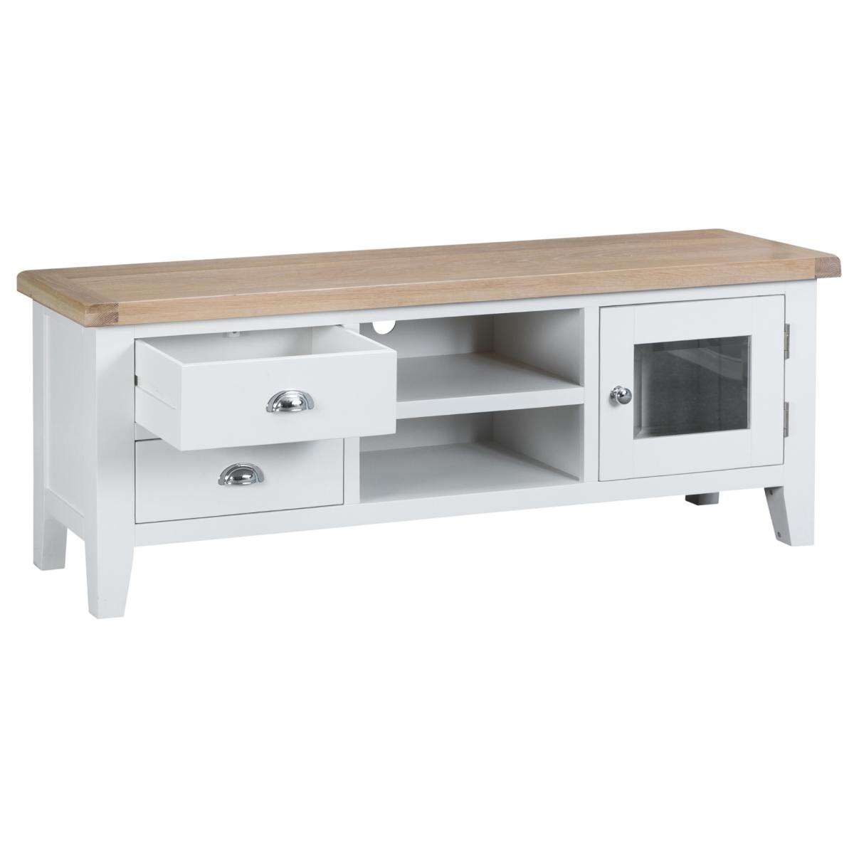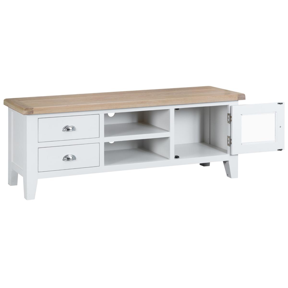 Featuring a low and wide design, the Eden Oak and White Large TV Cabinet boasts a stylish painted white finish with a lime washed oak top big enough for a 65” TV, plus an abundance of additional storage. With two sliding side drawers on metal runners, two open inner shelves and a stylish glazed cupboard. Finished with shining chrome details for a modern feel. Crafted in solid oak for a quality, sturdy piece that lasts. Featuring two open shelves for media storage, two sliding drawers and a small cupboard with glazed door. A fresh white painted finish adds style and a charm. Wide enough to fit up to a 65” TV, and low to not cover too much wall space. Features cable holes to the back of the unit for easy access to plugs