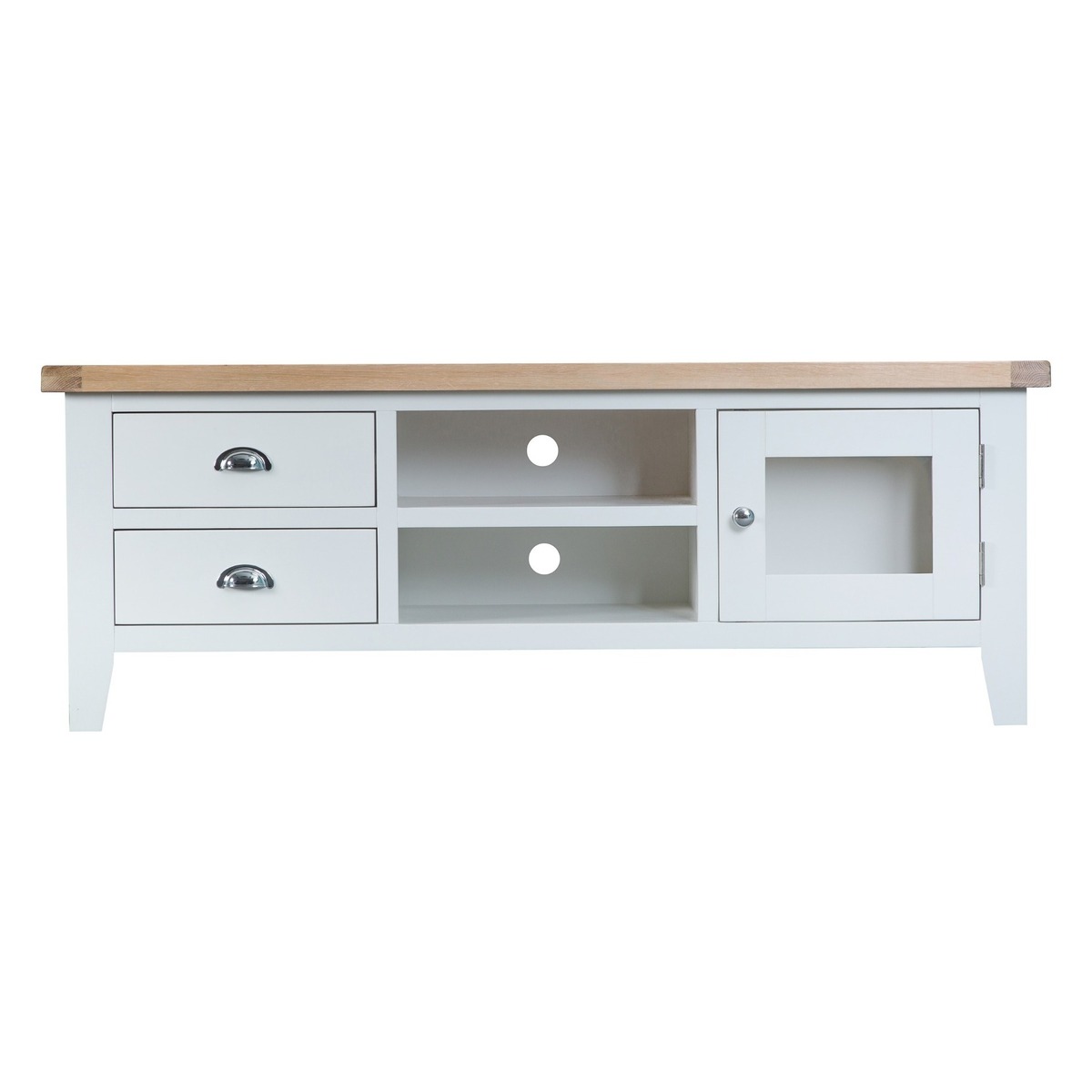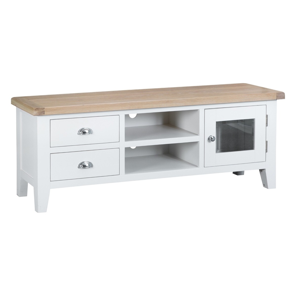 Featuring a low and wide design, the Eden Oak and White Large TV Cabinet boasts a stylish painted white finish with a lime washed oak top big enough for a 65″ TV, plus an abundance of additional storage. With two sliding side drawers on metal runners, two open inner shelves and a stylish glazed cupboard. Finished with shining chrome details for a modern feel. Crafted in solid oak for a quality, sturdy piece that lasts. Featuring two open shelves for media storage, two sliding drawers and a small cupboard with glazed door. A fresh white painted finish adds style and a charm. Wide enough to fit up to a 65″ TV, and low to not cover too much wall space. Features cable holes to the back of the unit for easy access to plugs.
