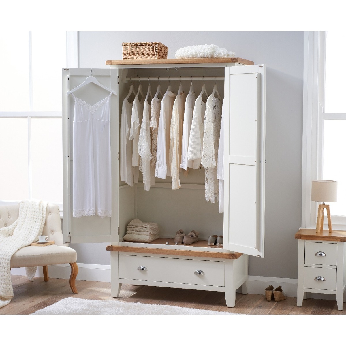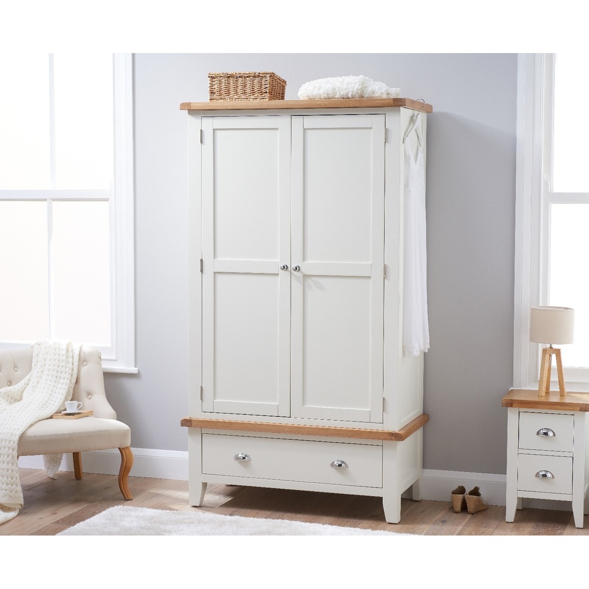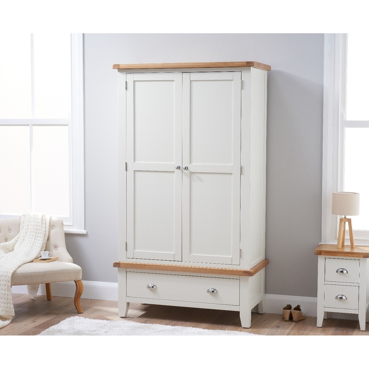 The Eden Oak and White Large Two Door Wardrobe is an elegant blend of classic and contemporary style elements. Featuring a stunning two-toned oak and white design, the large two door wardrobe is complete with a handy lower drawer. Large oak and white two door wardrobe. Attractive two-toned design with a lime washed oak top and bottom trim and white painted frame. Hardwood hanging rail. Lower drawer on metal guides provides additional storage. Chrome handles complete the look. Complements other items in the Eden bedroom furniture collection