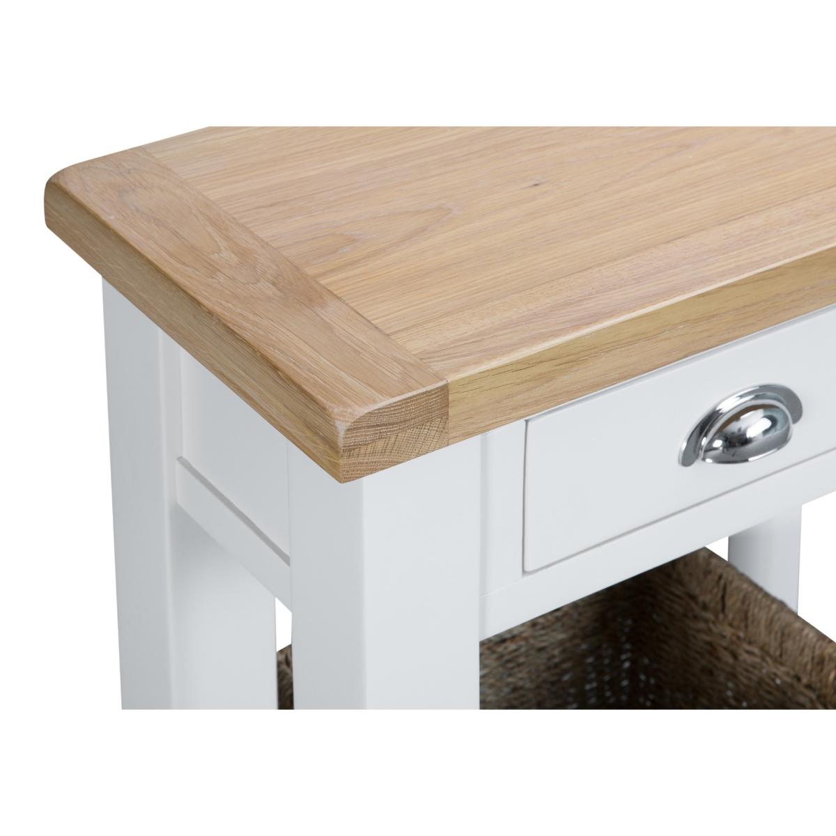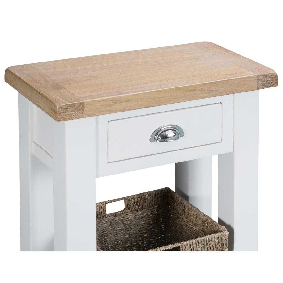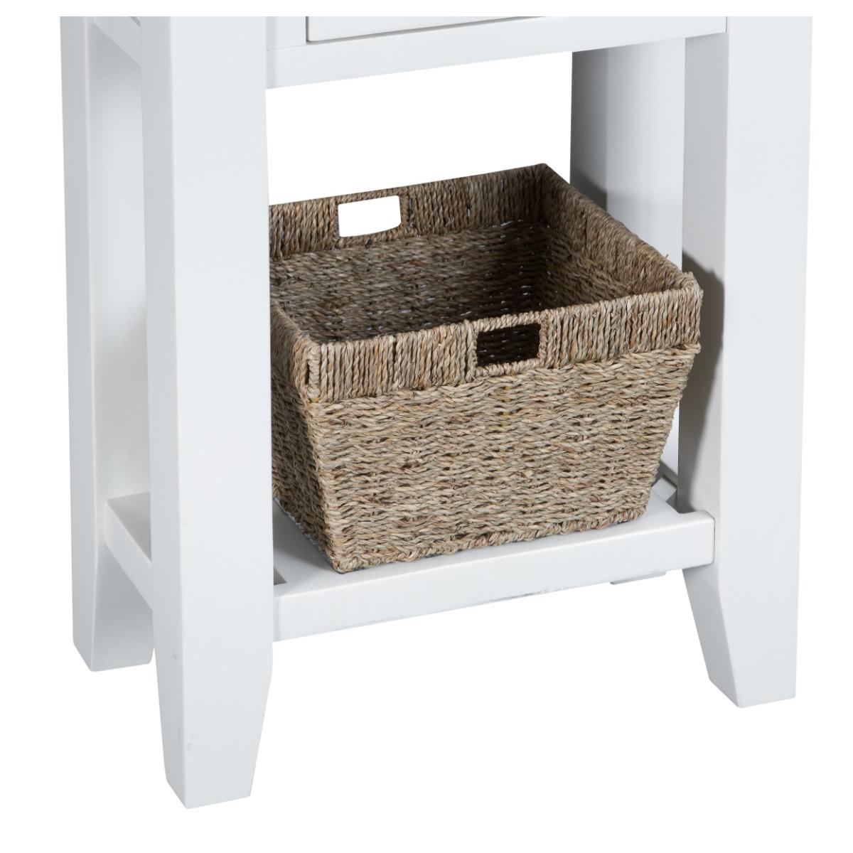 Crafted from sturdy, quality solid oak and painted in a fresh white, the Eden Telephone Table is compact and versatile in its design, with a smooth lime washed oak top and single drawer with a modern chrome cup handle. Made from a sturdy oak for lasting style. A fresh white painted finish offers a charming update on classic natural oak. Tall, neat and space-saving in size. A chrome cup handle adds a modern, stylish touch. Its lower shelf is adjustable for all needs. Comes with two seagrass wicker baskets for charming storage. Matches all items within the Eden collection
