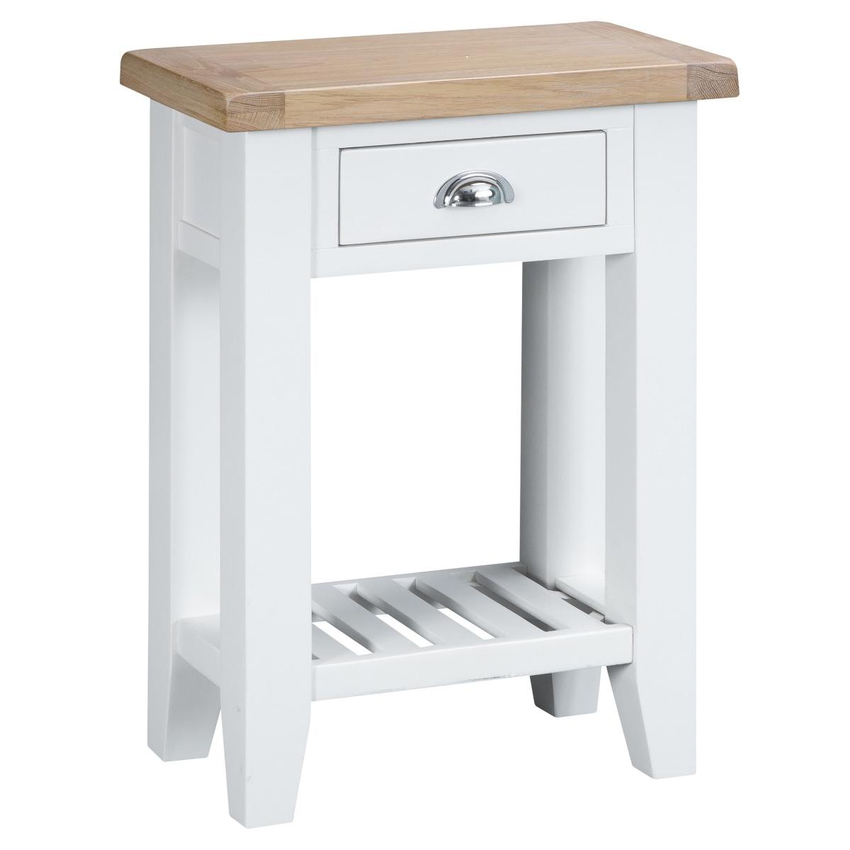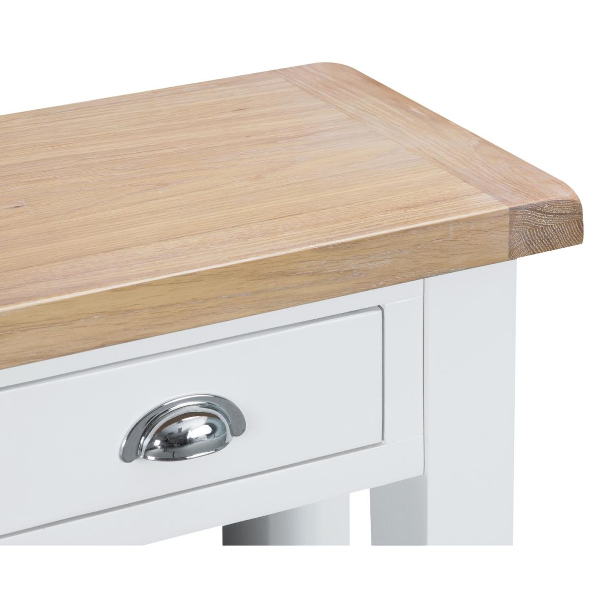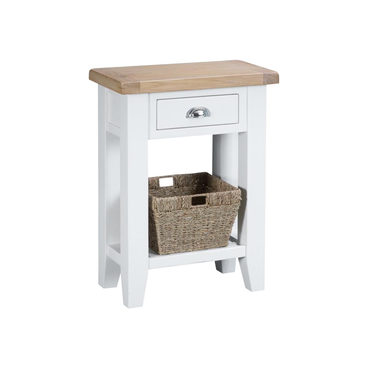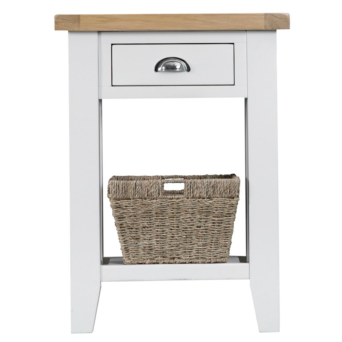 Crafted from sturdy, quality solid oak and painted in a fresh white, the Eden Telephone Table is compact and versatile in its design, with a smooth lime washed oak top and single drawer with a modern chrome cup handle. Made from a sturdy oak for lasting style. A fresh white painted finish offers a charming update on classic natural oak. Tall, neat and space-saving in size. A chrome cup handle adds a modern, stylish touch. Its lower shelf is adjustable for all needs. Comes with two seagrass wicker baskets for charming storage. Matches all items within the Eden collection