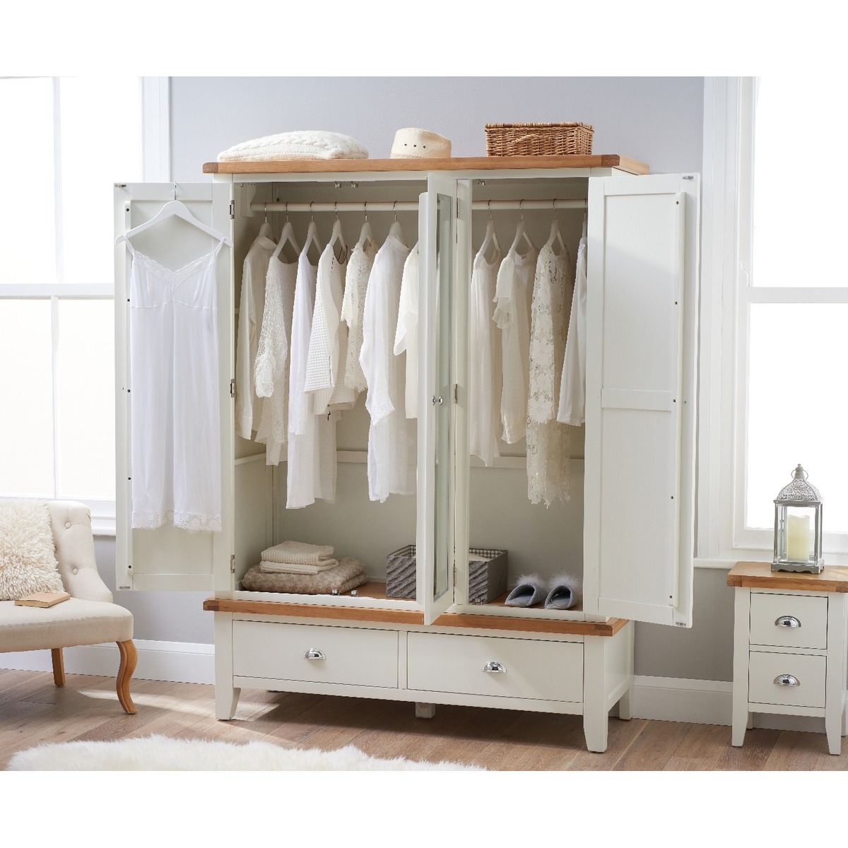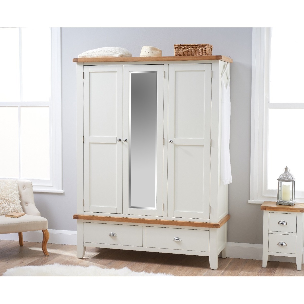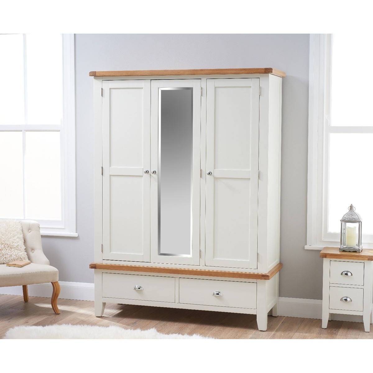 The Eden Oak and White Three Door Wardrobe features a stunning two-toned design to instantly update your bedroom setting. The large wardrobe offers plenty of storage and is complete with a full-length mirror and two handy lower drawers. Large oak and white three door wardrobe. Stylish two-toned oak and white design. Offers plenty of storage space for your garments. Features a full-length mirror in the centre. Two handy lower drawers on metal guides. Chrome handles complete the look. Complements other items in the Eden bedroom furniture collection.