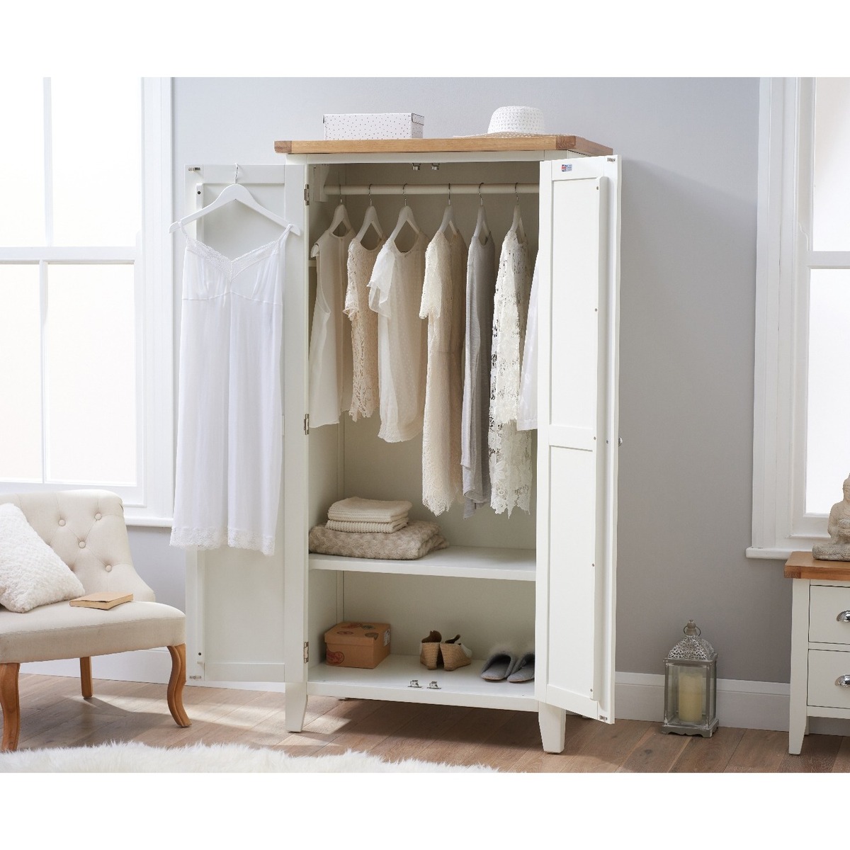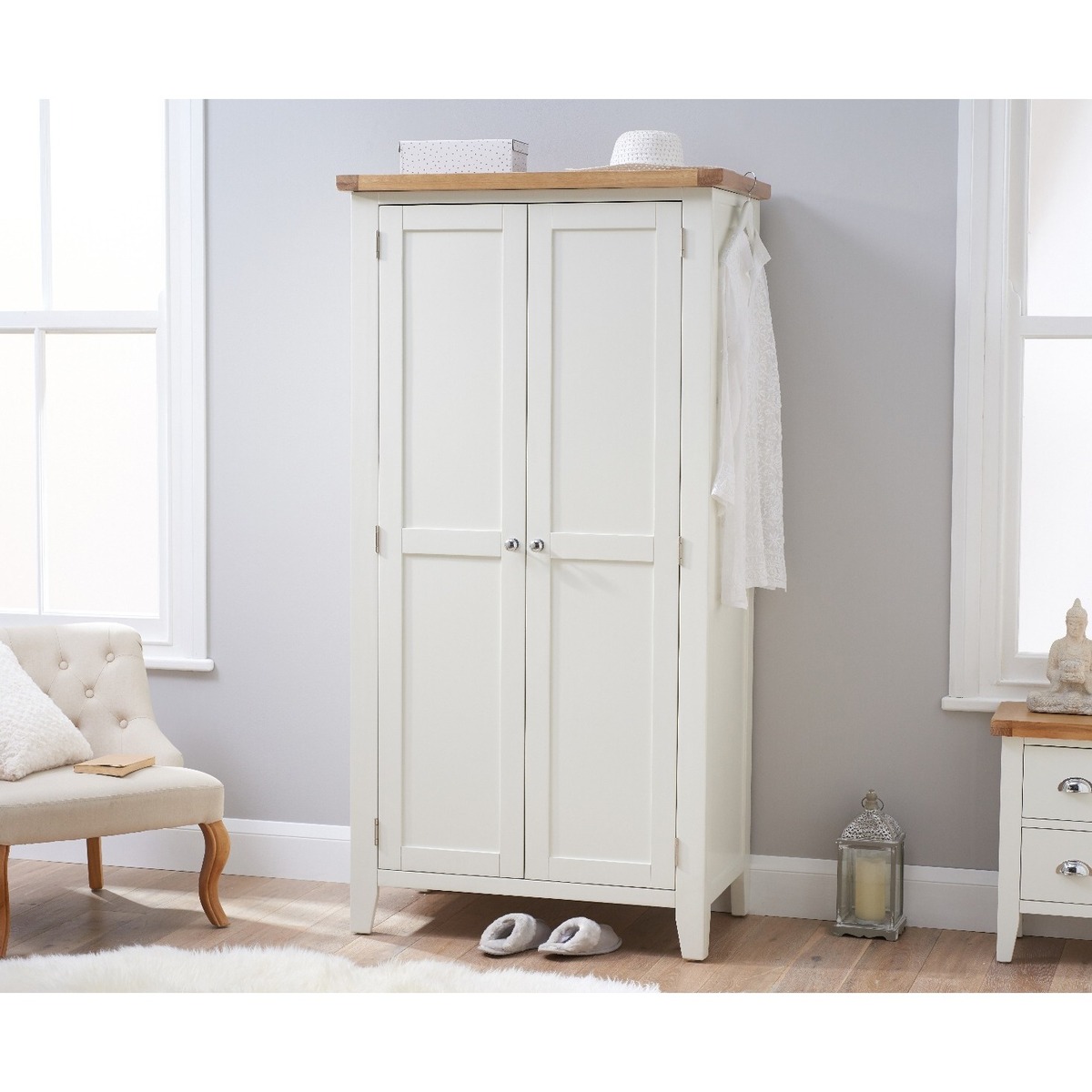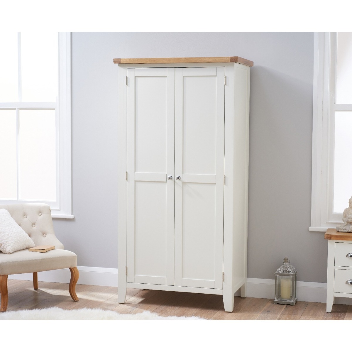 Bring classic style with a contemporary edge to your bedroom with the Eden Oak and White Two Door Wardrobe. Featuring plenty of storage space, the two door wardrobe is complete with a hardwood hanging rail and chrome handles for the perfect finishing touch. Elegant oak and white two door wardrobe. Stunning two-toned design with a lime washed oak top and white painted frame. Offers full-height hanging space Hardwood hanging rail for optimum support for your garments. Chrome handles complete the look. Complements other items in the Eden bedroom furniture range