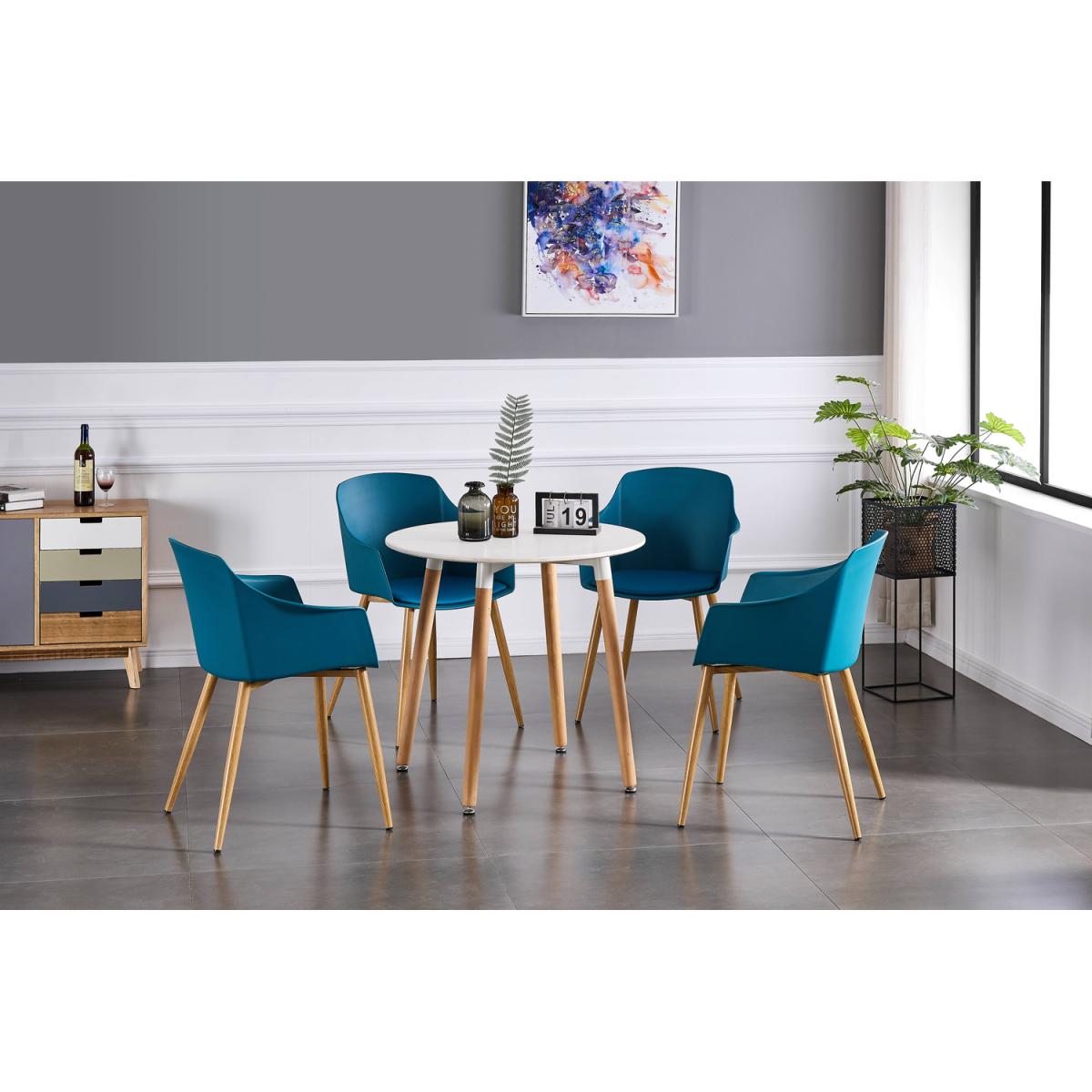 We are offering the Eden Halo Dining Set that includes the round Table, and delivers superior comfort and durability which makes it perfect for everyday use. Solid wooden legs ensure that the table is sustainable and long-lasting. Its luxury yet simple design will elevate your dining space to a new level. A perfect table for everyday family mealtimes, as well as an excellent table for grownup dinner gatherings. Also, the dinette table offers a brilliant surface solution for placing drinks, food, and snacks with its perfect size making it even easier to place anywhere you wish without cluttering your room. Combined with the padded Eden dining armchairs, are sure to add style to any home or lounge. It has a deep bucket-style seat and metal legs wrapped in natural oak finish. As well as being beautiful, these mid-century Scandinavian-inspired dining chairs are incredibly practical for everyday use. The Eden armchair has a deep, curved seat and high armrests to provide maximum support for all your dining needs, and the natural wrap finish on the legs will add a touch of modern Scandinavian design to your dining room.