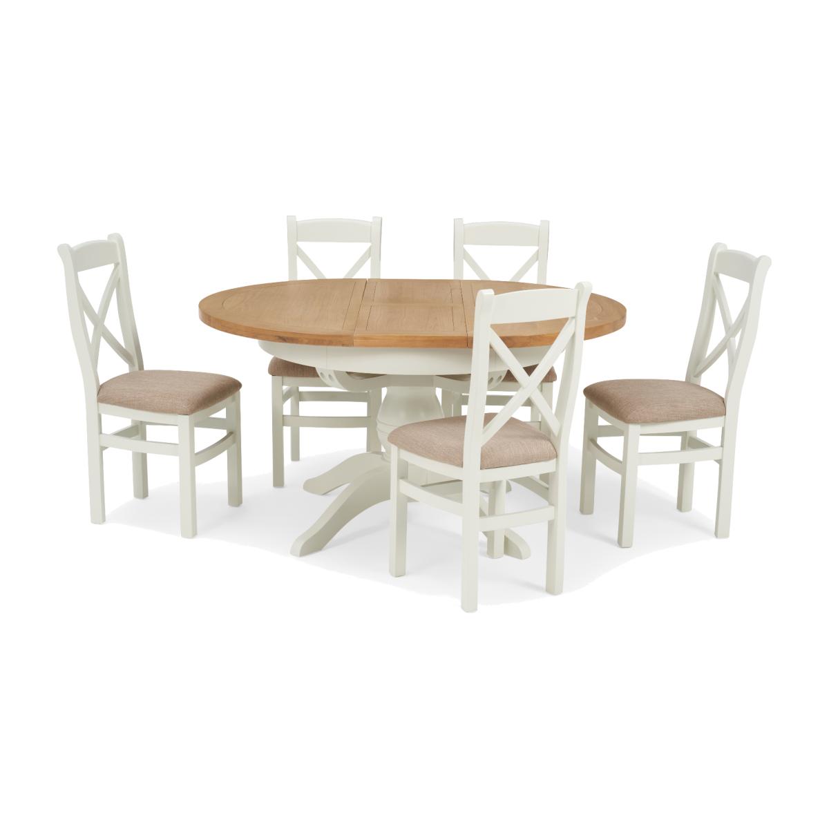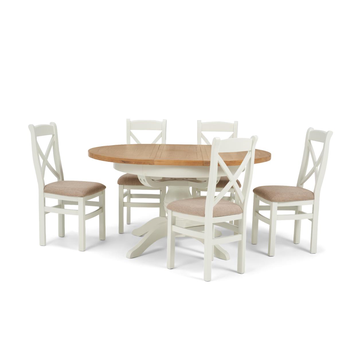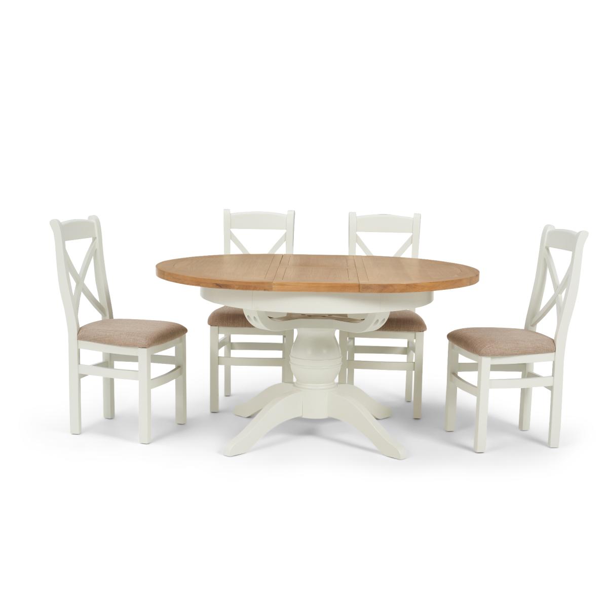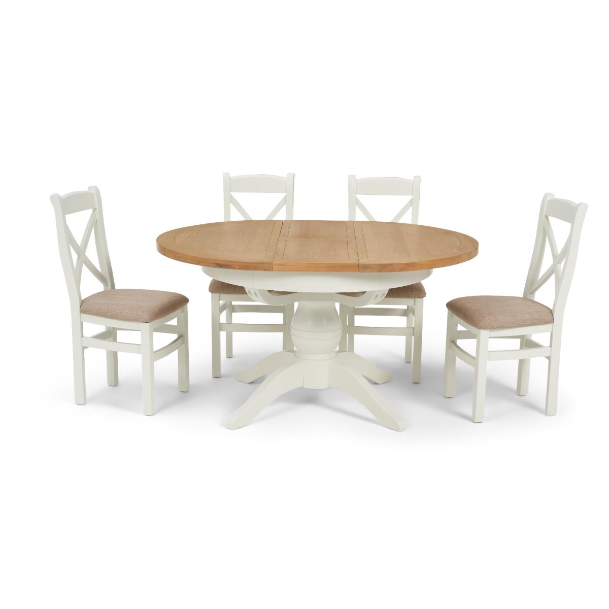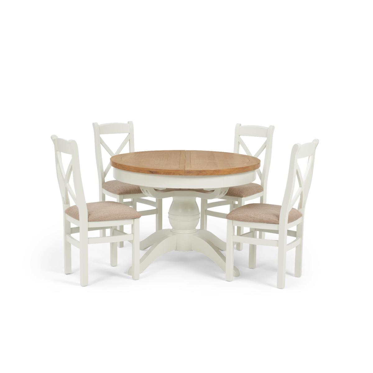 The Eden Round Extending Dining Table with Cross Back Fabric Chairs is a compact and stylish set. Perfect for small areas, the space saving dining set features an oak and white pedestal dining table complemented by matching chairs with a classic cross back design and fabric seats. Small and space saving set Versatile round dining table Smooth white painted pedestal and lime washed oak table top Seats 4 and extends to seat 6 Handy inbuilt butterfly feature extends the table to 135cm Matching chairs complete the look Classic cross back design Comfortable padded seats with fabric finish