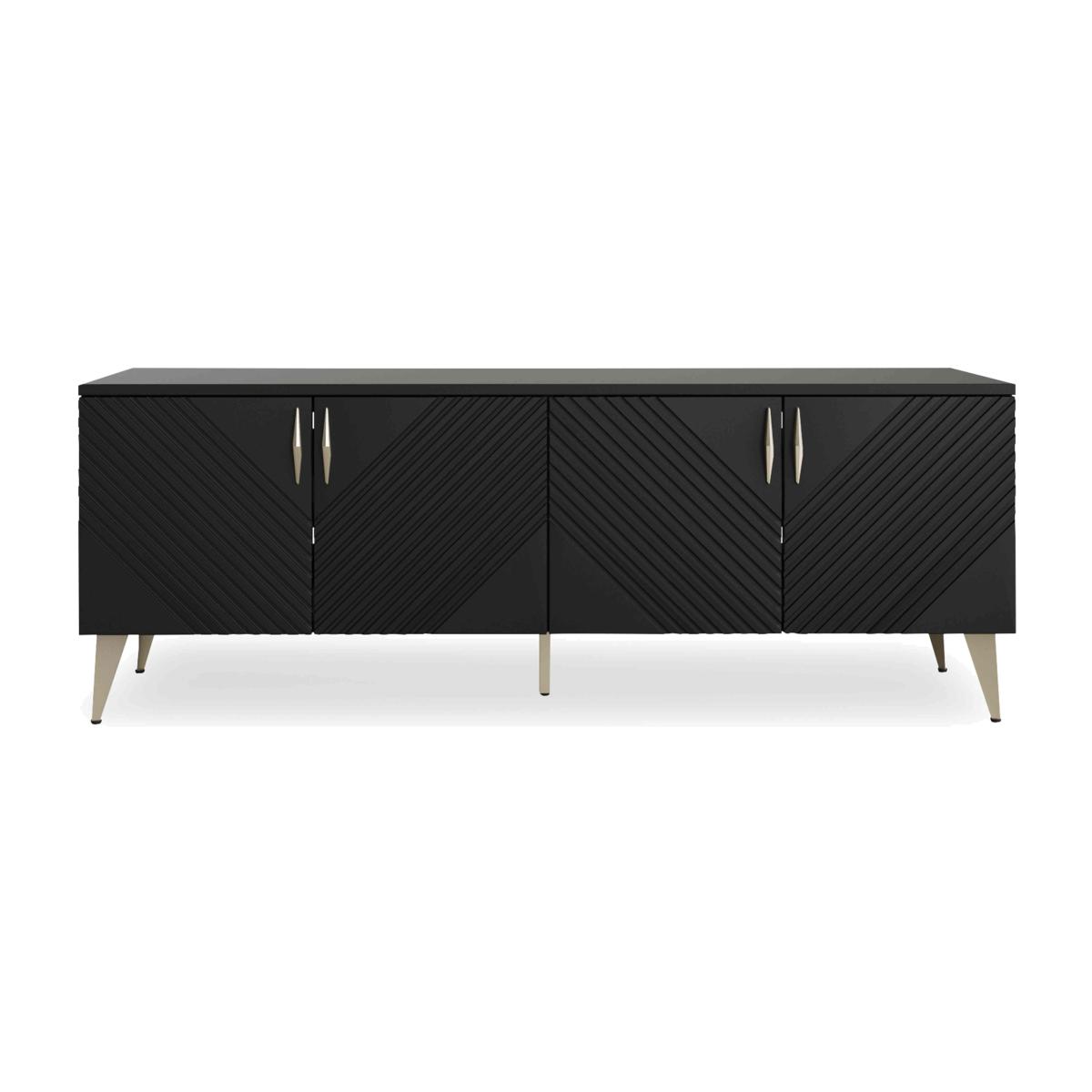 This low- profile TV unit is sleek, stylish and has seamlessly integrated SMART technology. Its Intelligent Eye feature means that remote controls work through closed doors. Online only. Why you'll love it SMART functionality meets sleek, modern glam style. Make life easier with seamlessly integrated technology. LED uplighting controlled via your SMART speaker or phone app. With Intelligent Eye technology – remote controls work even with the doors closed. Clever cable management also ensures adequate ventilation. Satin- painted fluted finish in a choice of fashion- forward colours. Midnight purple interior. Bold, angular metal legs and handles have a brushed gold- coloured finish. Easy, click- together self- assembly system for a perfect finish. A Furniture Village online exclusive – you won’t find it in stores. This SMART TV unit is part of the Eden range. What you need to know 2 double- door cupboards each with an adjustable shelf. Assemble on a soft surface such as a carpet, and in the room where the unit will live. All doors must be attached before aligning them. Adjust doors on an even floor. Wipe clean with a damp cloth. We recommend using coasters and placemats at all times.
