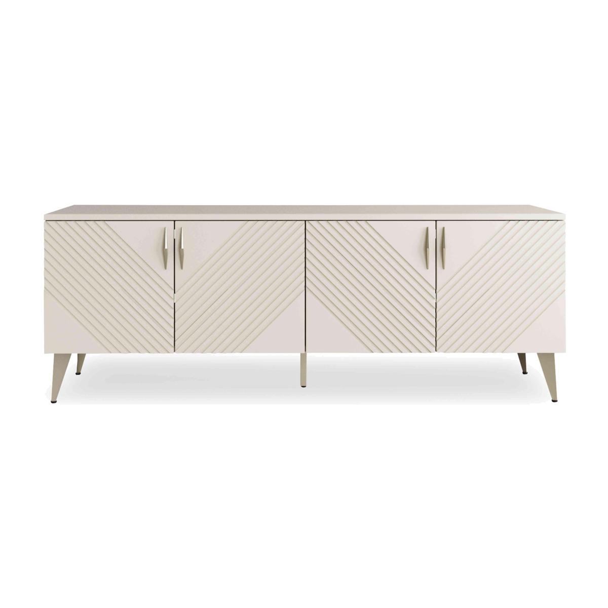 This low- profile TV unit is sleek, stylish and has seamlessly integrated SMART technology. Its Intelligent Eye feature means that remote controls work through closed doors. Online only. Why you'll love it SMART functionality meets sleek, modern glam style. Make life easier with seamlessly integrated technology. LED uplighting controlled via your SMART speaker or phone app. With Intelligent Eye technology – remote controls work even with the doors closed. Clever cable management also ensures adequate ventilation. Satin- painted fluted finish in a choice of fashion- forward colours. Midnight purple interior. Bold, angular metal legs and handles have a brushed gold- coloured finish. Easy, click- together self- assembly system for a perfect finish. A Furniture Village online exclusive – you won’t find it in stores. This SMART TV unit is part of the Eden range. What you need to know 2 double- door cupboards each with an adjustable shelf. Assemble on a soft surface such as a carpet, and in the room where the unit will live. All doors must be attached before aligning them. Adjust doors on an even floor. Wipe clean with a damp cloth. We recommend using coasters and placemats at all times.