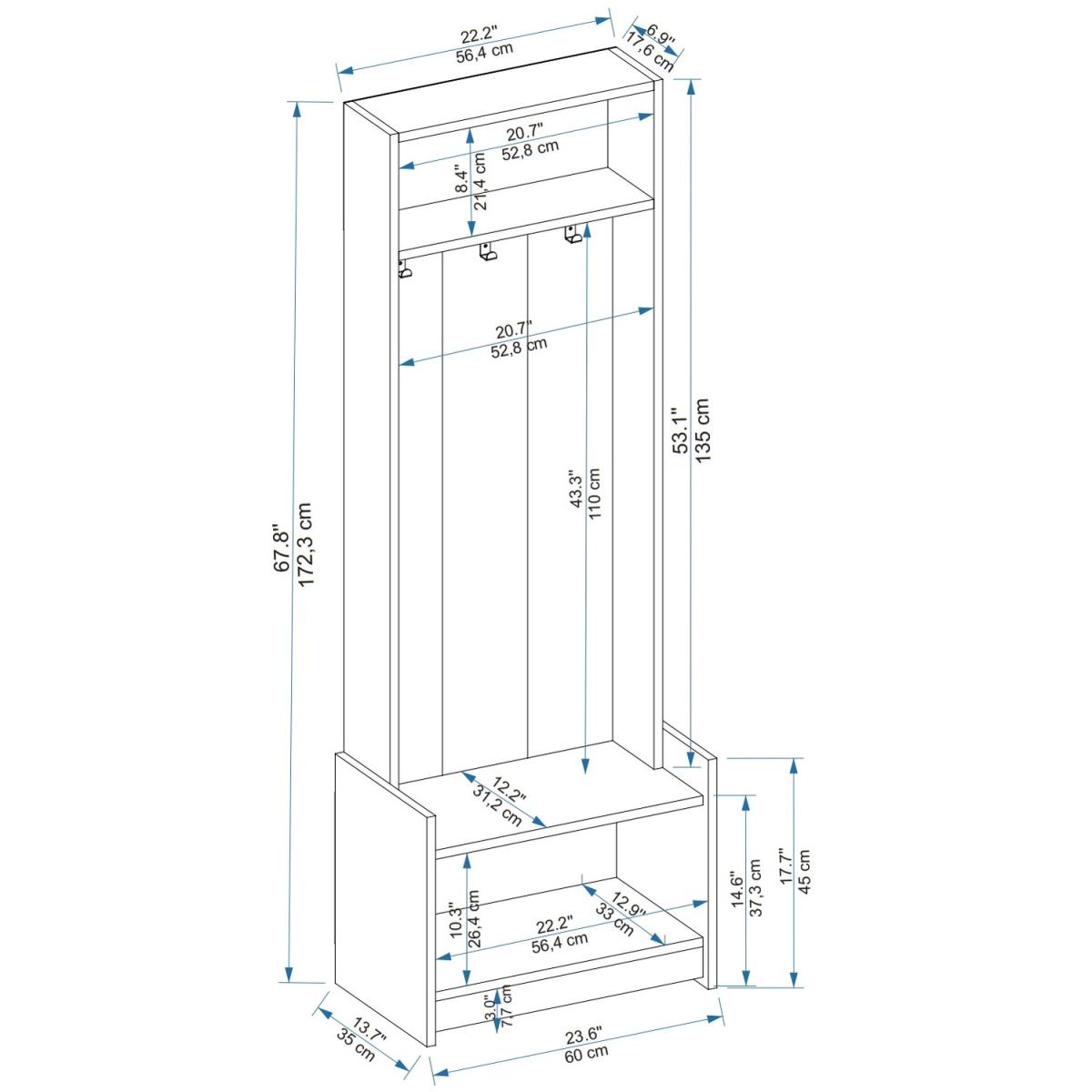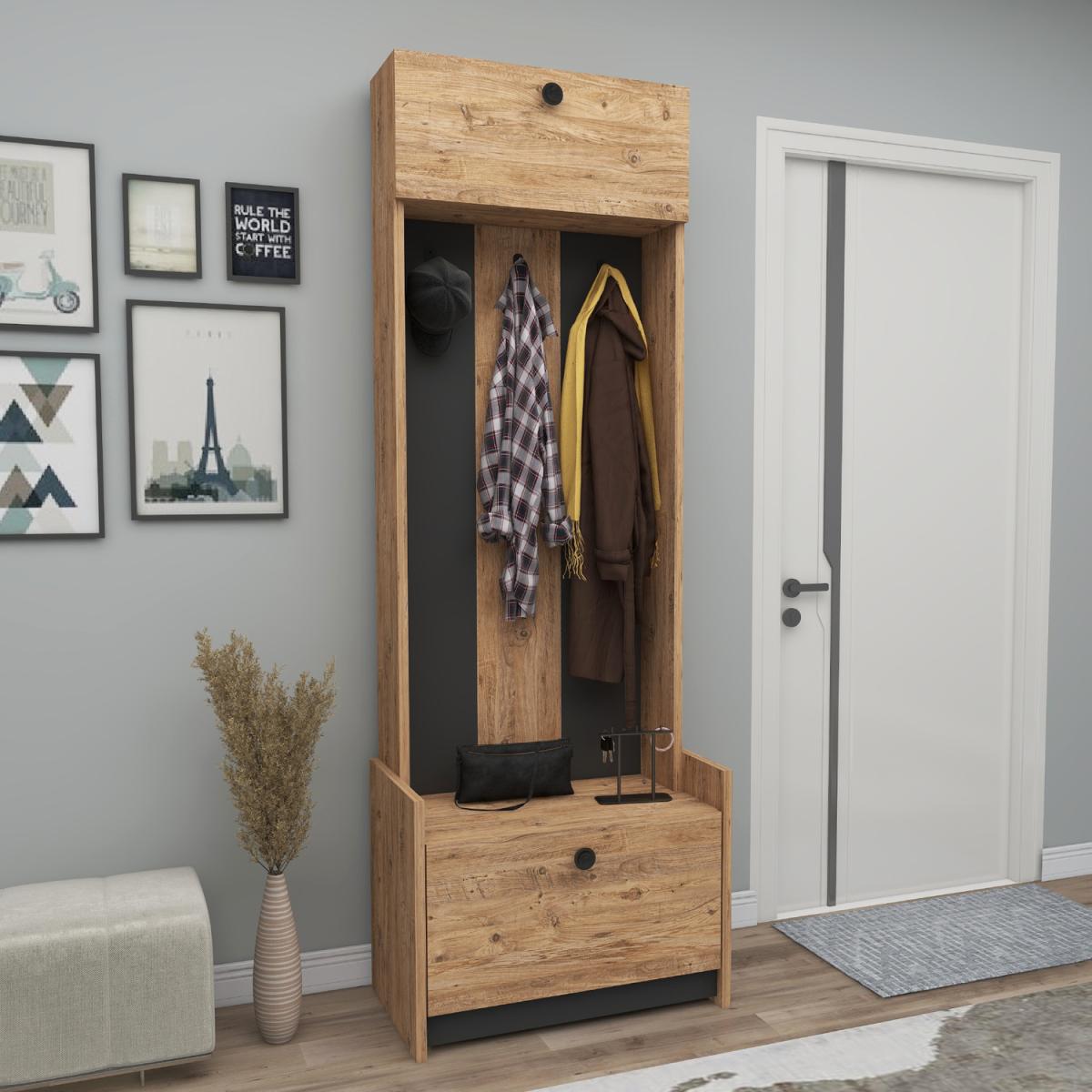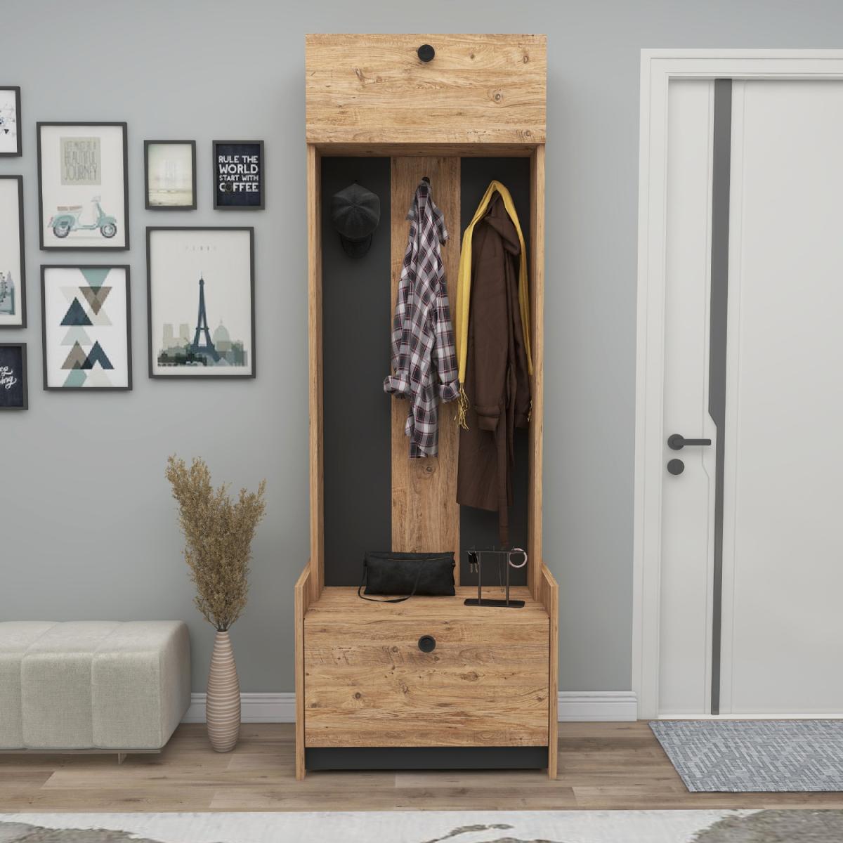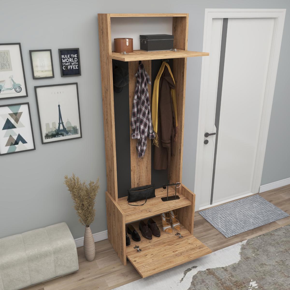 MATERIAL The coat rack is made of an 18 mm thick quality melamine-coated particleboard. The manufactured wood surface is water-resistant to some extent and the edges are banded with PVC edge banding tape. Hooks are quality iron metal. First-class assemblyinstallation hardware and accessories are used. Our products are produced from certified quality raw materials that do not contain carcinogenic substances and comply with European Union health norms. CLEANING You can clean your furniture with a damp cloth. Avoid prolonged contact of your product with copious amounts of water. ASSEMBLY The product will be delivered to the customer in the original package as disassembled. It is designed to be assembled by the customer using a power drill and screwdriver. Assembly instructions and installation hardware are included in the package. For fast and error-free installation, product parts are numbered with stickers in accordance with the assembly guide.