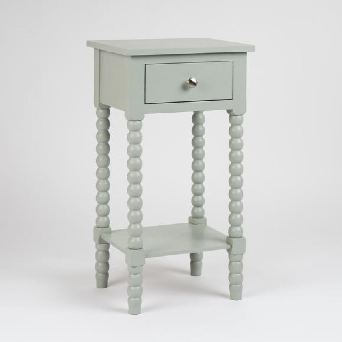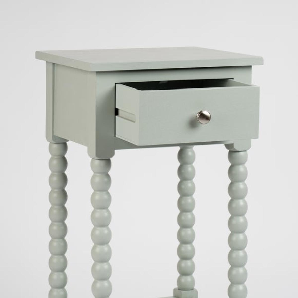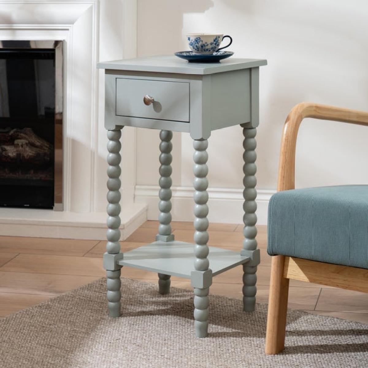 I love this little side table for its charming, vintage-inspired design, which adds character without overpowering a space. It works particularly well in cosy living rooms or bedrooms with a traditional or farmhouse vibe, but it can also bring a touch of charm to more modern interiors when styled thoughtfully. Practical styling tips include using the top surface for a coffee cup or a small plant, and the lower shelf as additional storage for books or decorative baskets. The soft colour makes it versatile, allowing it to blend seamlessly with both neutral palettes and pastel colour schemes. Its sturdy, turned legs offer a tactile detail that elevates the look, making it both functional and visually appealing.