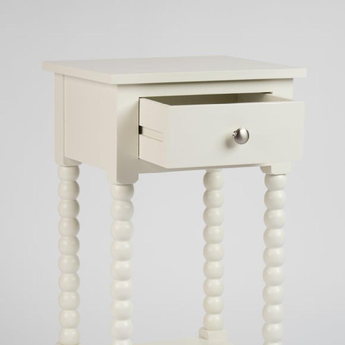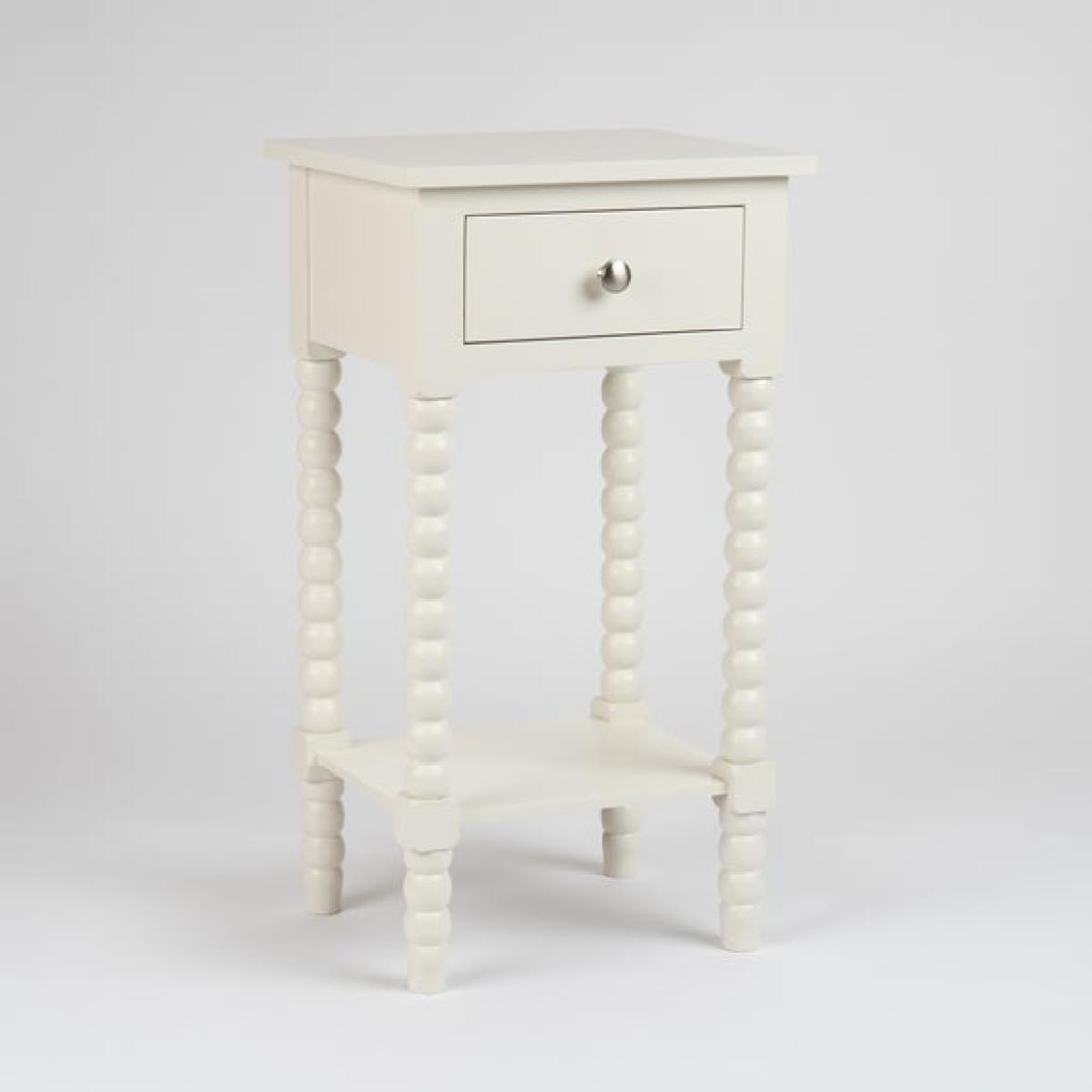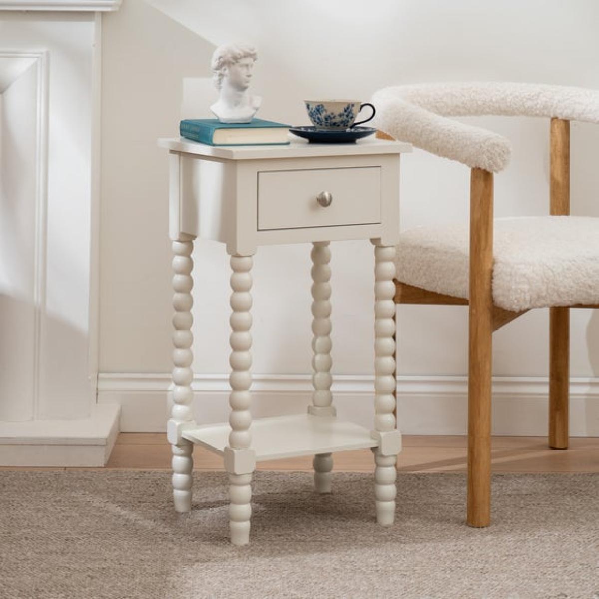 * Elegant style side table * Bobbin legs * Painted finish * Spacious drawer Bold and distinctive, the Edie side table combines classic bobbin-style legs with a sleek, modern finish. The drawer provides practical storage, while the tabletop is perfect for showcasing your favourite pieces.