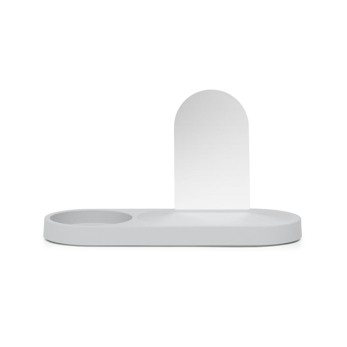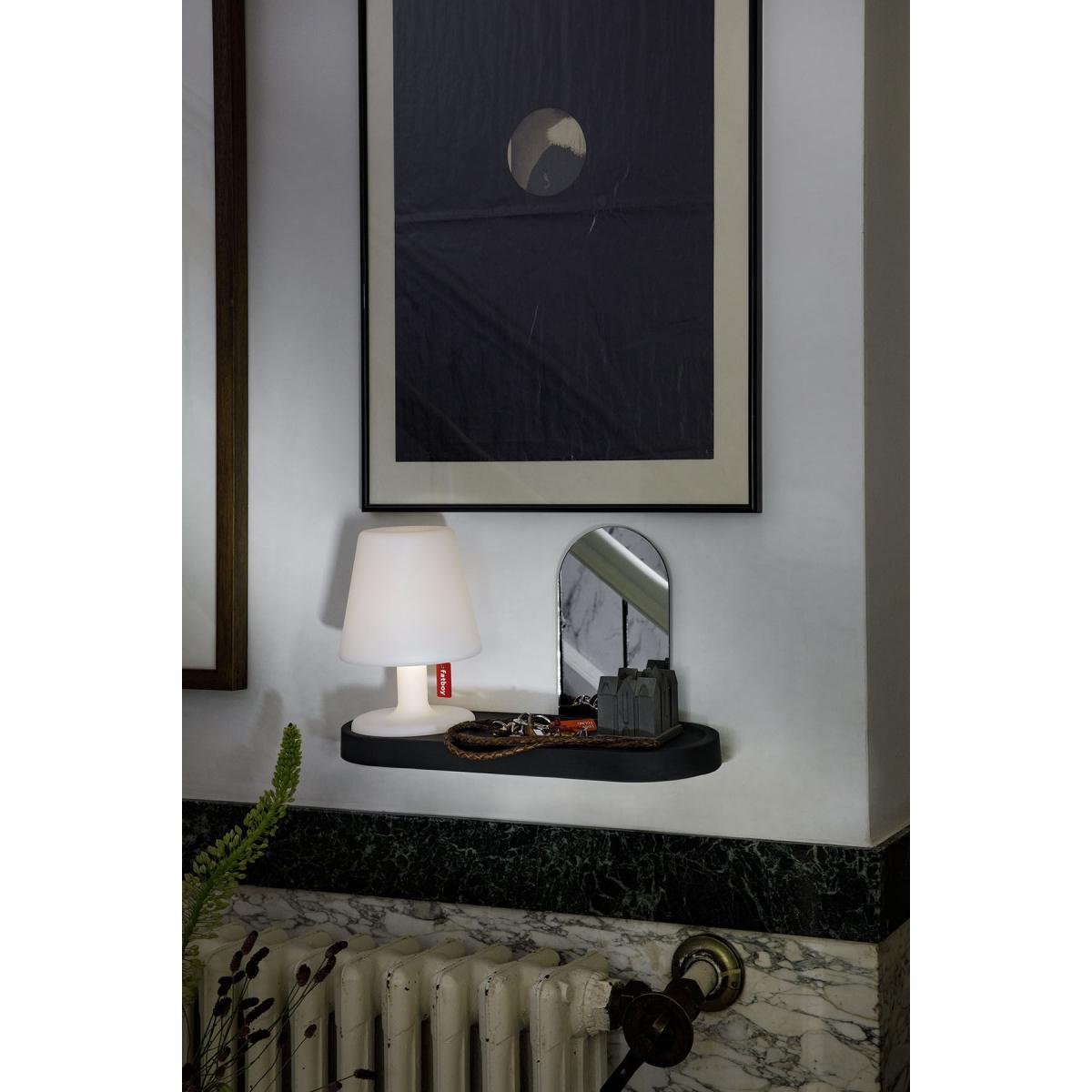 PLEASE NOTE: Edison the Petit II wireless lamp NOT INCLUDED (sold separately). This large tray is highly practical. Equipped with a detachable mirror, you can use it as a trinket bowl to store all your small items in: keys, money and mobile in the entrance, jewellery and make-up in the bathroom, etc. The ABS tray is coated in a rubber finish that is very soft to the touch. The mirror is detachable: it slides into a groove located on the back of the tray in which you can also place mail, photos or post cards, etc. The tray can be placed on a piece of furniture or attached to the wall like a shelf (invisible wall fastening made from steel included). To the left of the tray, the round space can house an Edison the Petit II wireless lamp (PLEASE NOTE: lamp NOT INCLUDED, sold separately). A hole on the lamp space lets you pass the lamp charging cable through. This lets you recharge the lamp while it remains on the shelf.