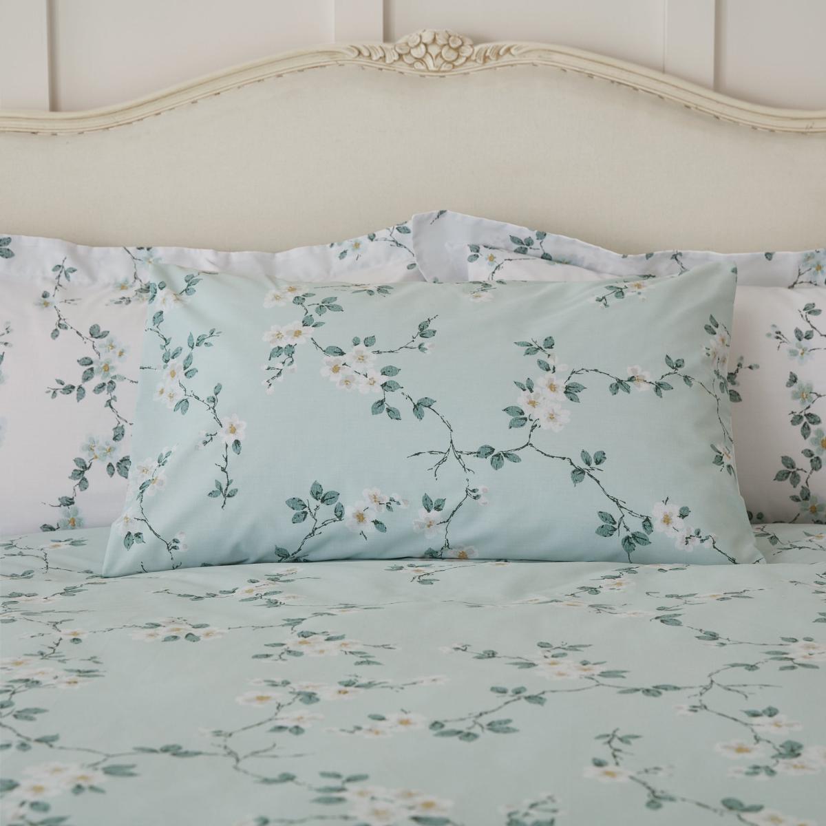 Decorated with delicate springs of blossom on a pretty duck egg background, our Edith duvet cover and pillowcase set is fully reversible for easy colour change featuring a fresh white reverse. Made from a quality polycotton blend with a soft touch design for added comfort, this duvet cover set is machine washable for easy care with coordinating items available to purchase separately.