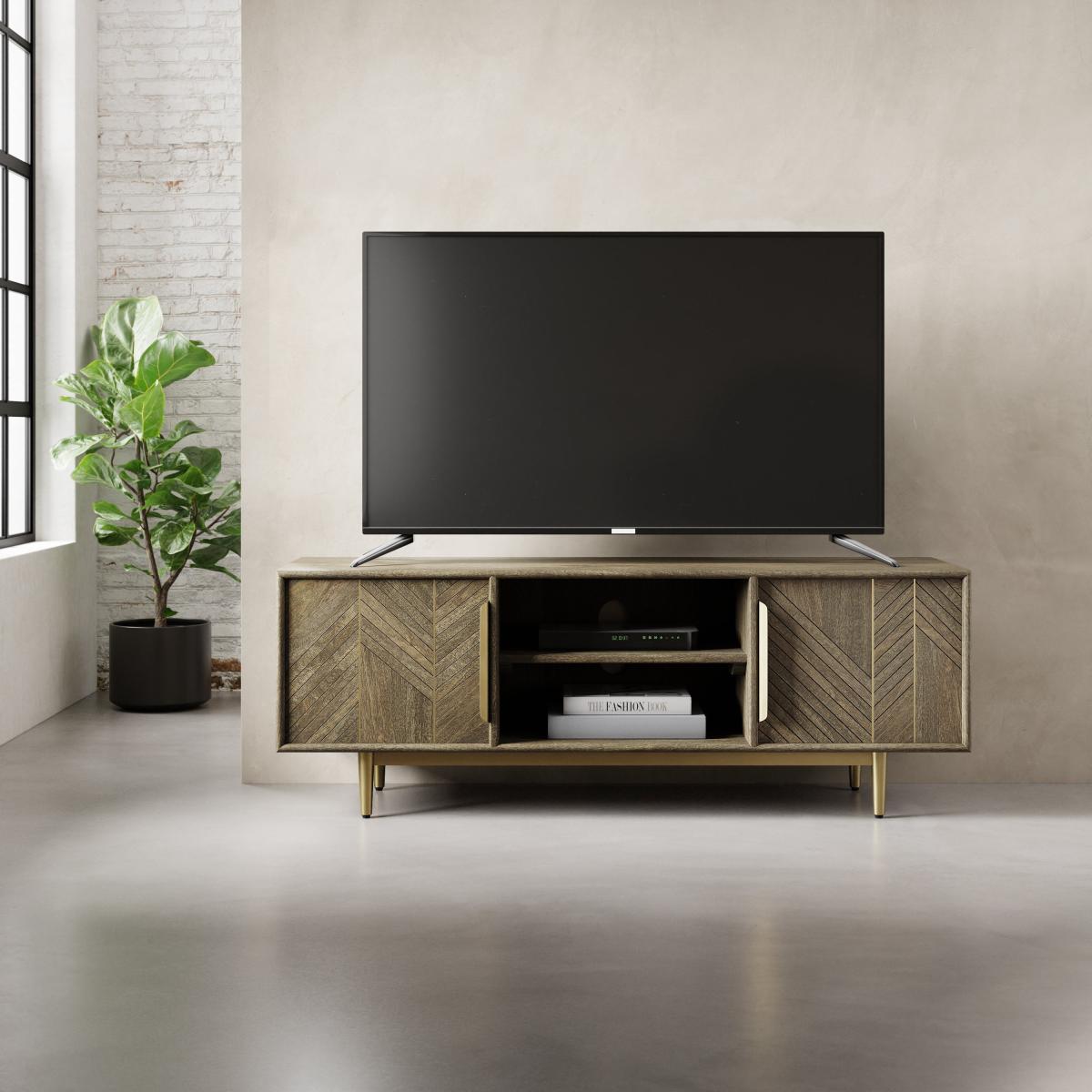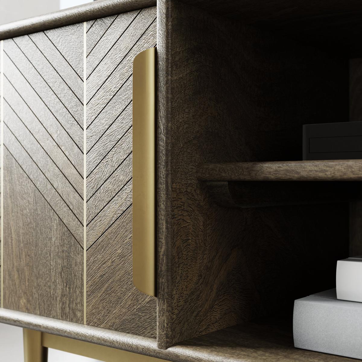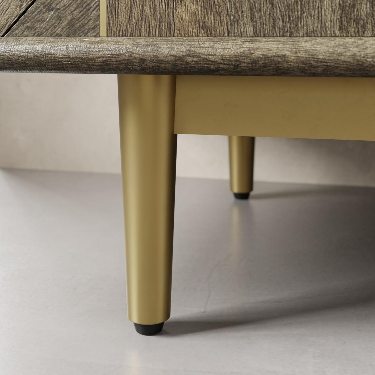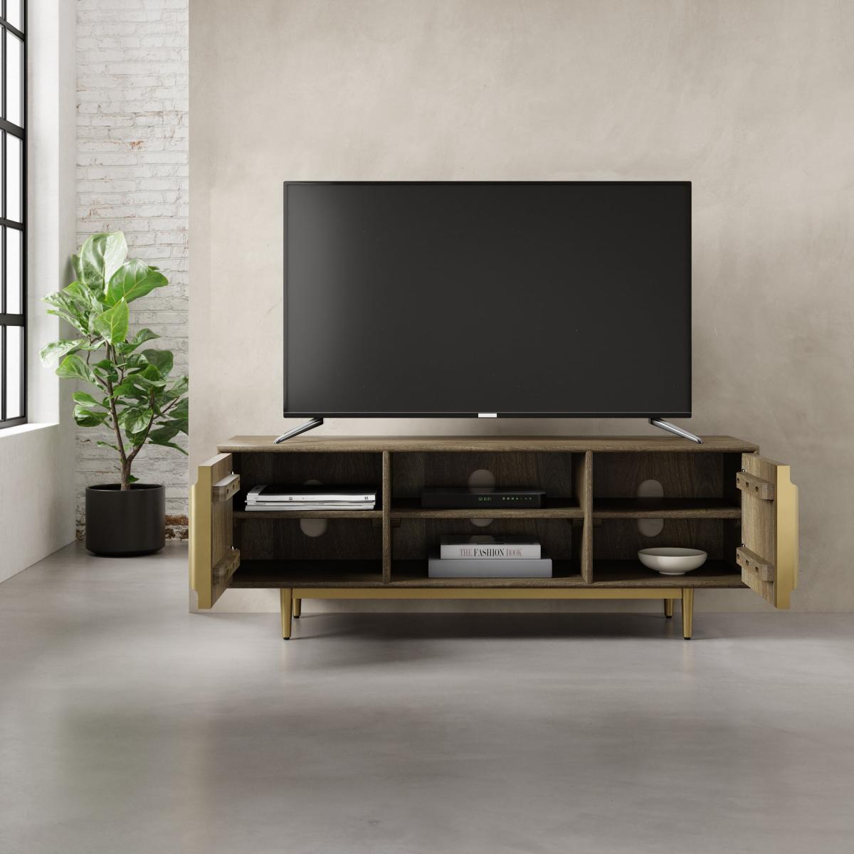 For a stunning focal point in your living room, consider this tv unit stand. Designed with grooved detailing on the doors, this TV unit offers two doors and open shelving space for your media equipment. Its cable management feature keeps your cords neatly organized, while the wood finish and opulent gold metal handles and legs make a statement of luxury.