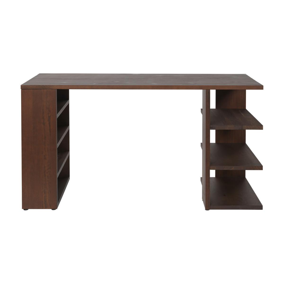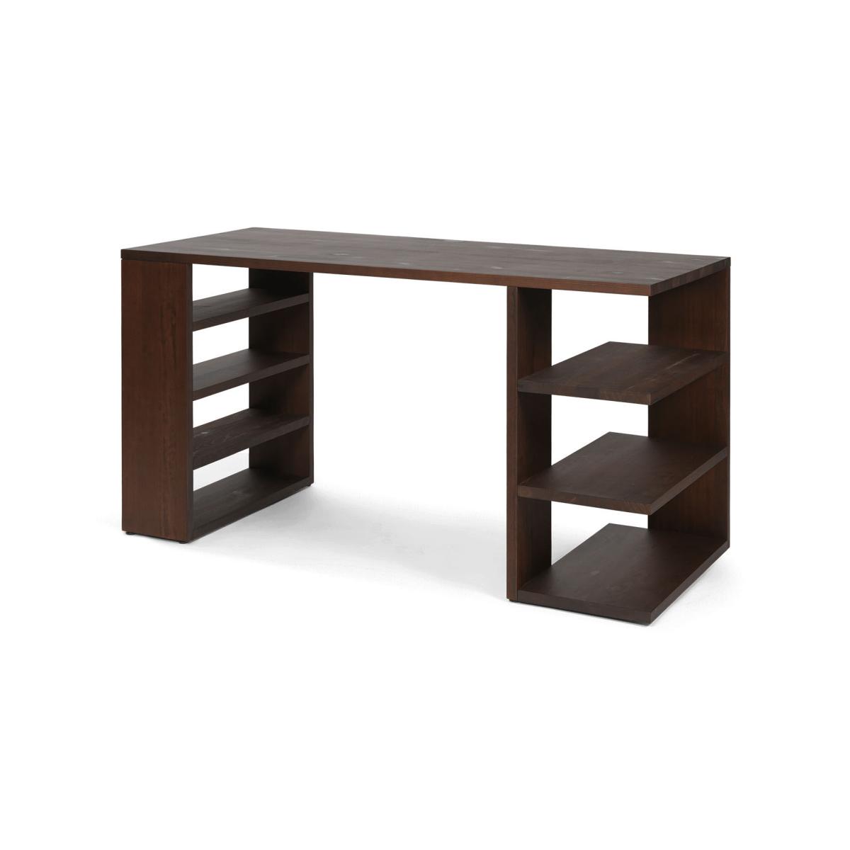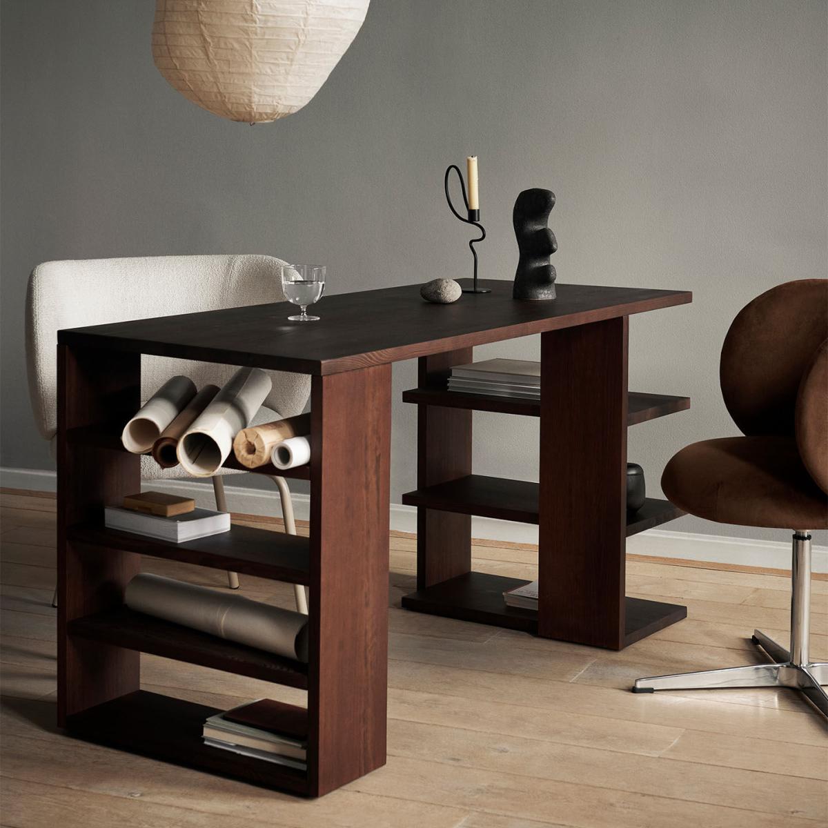 Inspired by brutalism, the Edre desk offers a play of imposing, balanced volumes. It displays solid, unstructured lines. The Edre desk is made of solid stained European pine, FSC-certified. This dark wood, with its noble connotations, lends a very Art Déco allure which adds warmth to your interior with its dark shades. The thick top sits above two modules which serve as storage space. These open shelves can accommodate your books, papers and office accessories or display your favourite decorative objects. Its versatile size and dual functionality make it easy to create a stylish office space in any room in the house. Edre offers a perfect blend of aesthetics and functionality for your work environment. Care advice: Wipe with a damp cloth. Do not leave the surface wet.