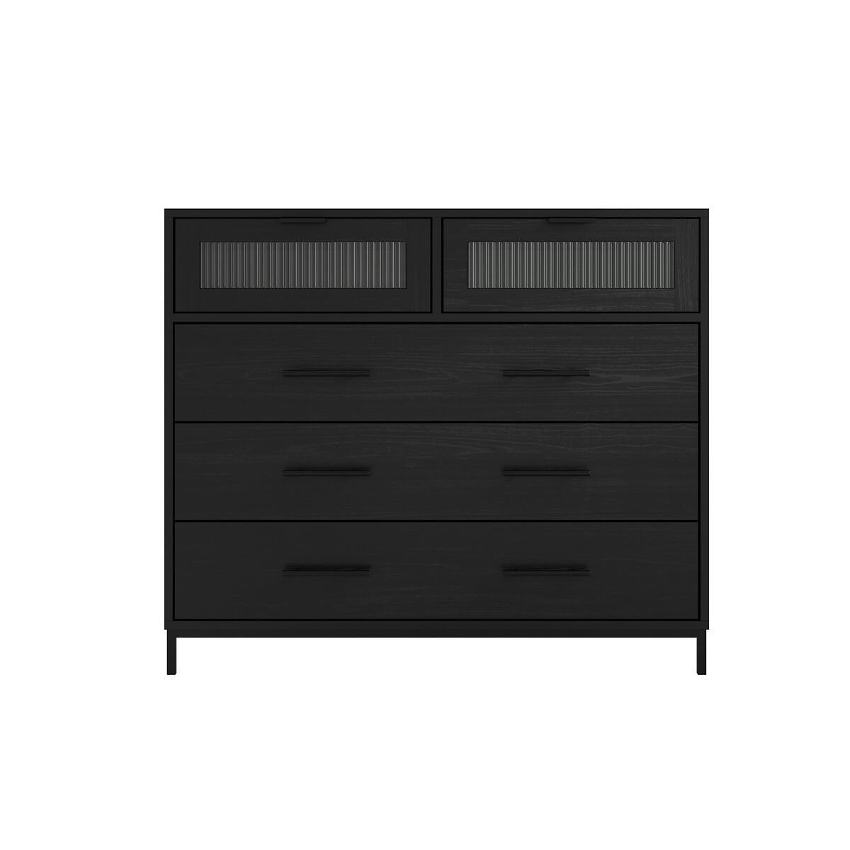 Elevate your space with the Edison chest of drawers, a perfect fusion of industrial charm and contemporary design. A sleek matte finish is paired with clear reeded glass and a robust metal frame, creating an industrial look. Its versatile design seamlessly blends with any decor, making it an essential addition to your home. Product Details• 5 drawers• Reeded glass drawer frontage on upper two drawers • Matte grain finish• Black metal frame• T-bar matte black handles• Full assembly required• Care advice - clean with a damp cloth or duster. Product Composition - Wood, Glass, Metal. Product Dimensions - 40 cm x 95 cm x 80 cm , Weight - 36 KGPackage Dimensions - 130 cm x 47 cm x 21 cm, Weight 38 KGPlease note: this product cannot be be delivered to all Offshore Islands, Scottish Highlands, Northern Ireland or Republic of Ireland. This product will be dispatched by one of our trusted suppliers. You’ll be contacted by their selected courier about your delivery.