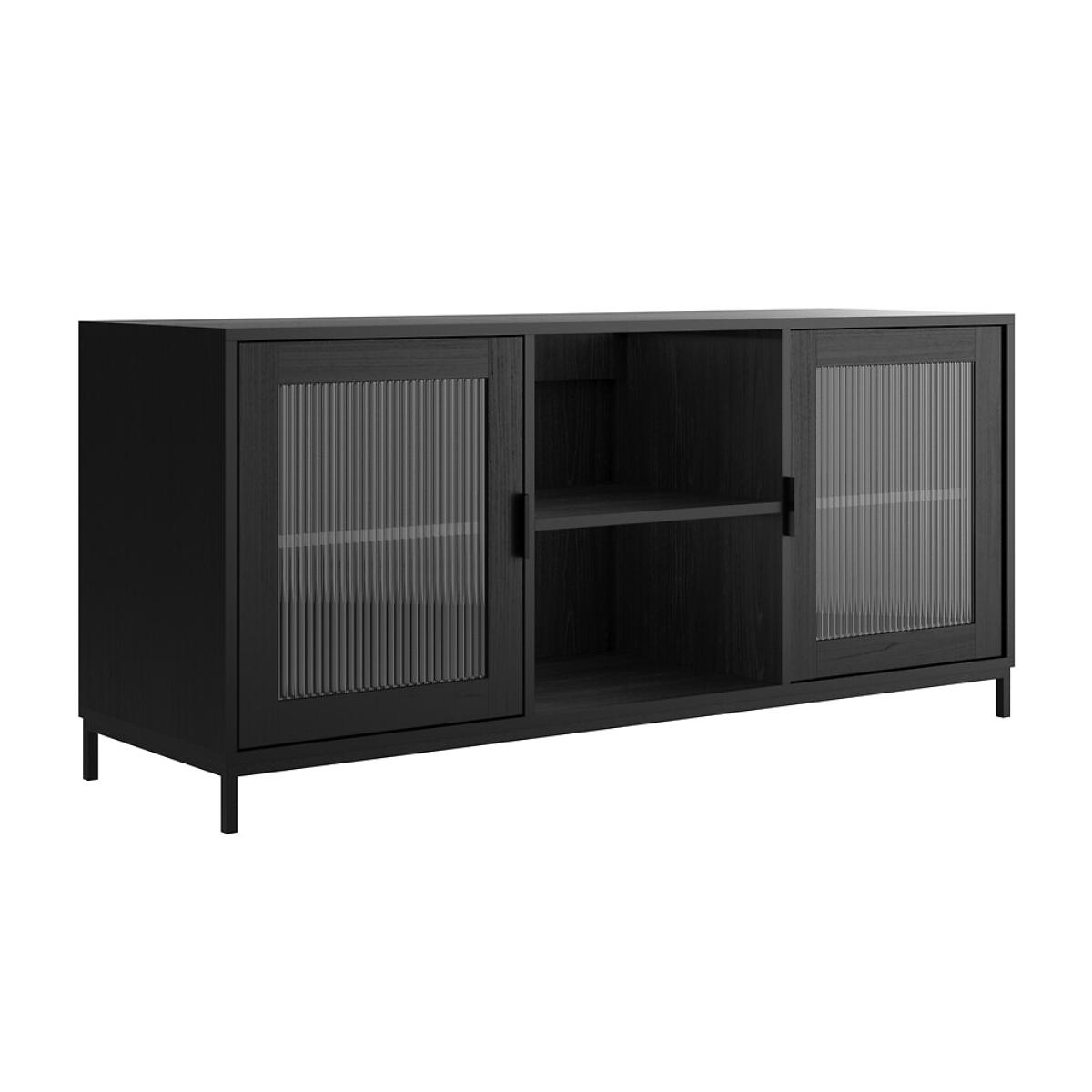 Bring modern industrial style to your home with the Edris media unit. With its matte black finish, clear reeded glass, and sleek metal frame, this unit is sure to seamlessly blend with any decor, making it the perfect addition to elevate your entertainment area. Product Details • Matte woodgrain finish • Reeded glass door fronts • Black metal legs • Hidden cable pass opening at the rear of the unit • 2 doors • 6 storage compartments • Assembly required. Product Composition - Wood, Glass. Product Dimensions - 40 cm x 58 cm x 128 cm , Weight - 30 KGPackage Dimensions - 135 cm x 48 cm x 15 cm, Weight 31.5 KGThis product will be dispatched by one of our trusted suppliers. You’ll be contacted by their selected courier about your delivery. Please note: this product cannot be be delivered to all Offshore Islands, Scottish Highlands, Northern Ireland or Republic of Ireland.