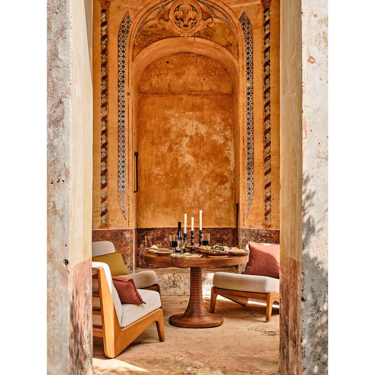 I love this table for its sculptural form and warm timber tone, which makes it a versatile piece in both contemporary and mid-century modern interiors. Its rounded shape and textured base add visual interest without overwhelming a space, making it suitable for smaller dining areas or as a statement piece in open-plan kitchens. Practical styling tips include pairing it with simple, upholstered chairs for a cosy, inviting look, or contrast it with colourful or patterned accessories to add personality. Its robust timber finish also allows for experimental styling with textured or layered textiles-think linen runners or woven placemats-to complement its natural feel.