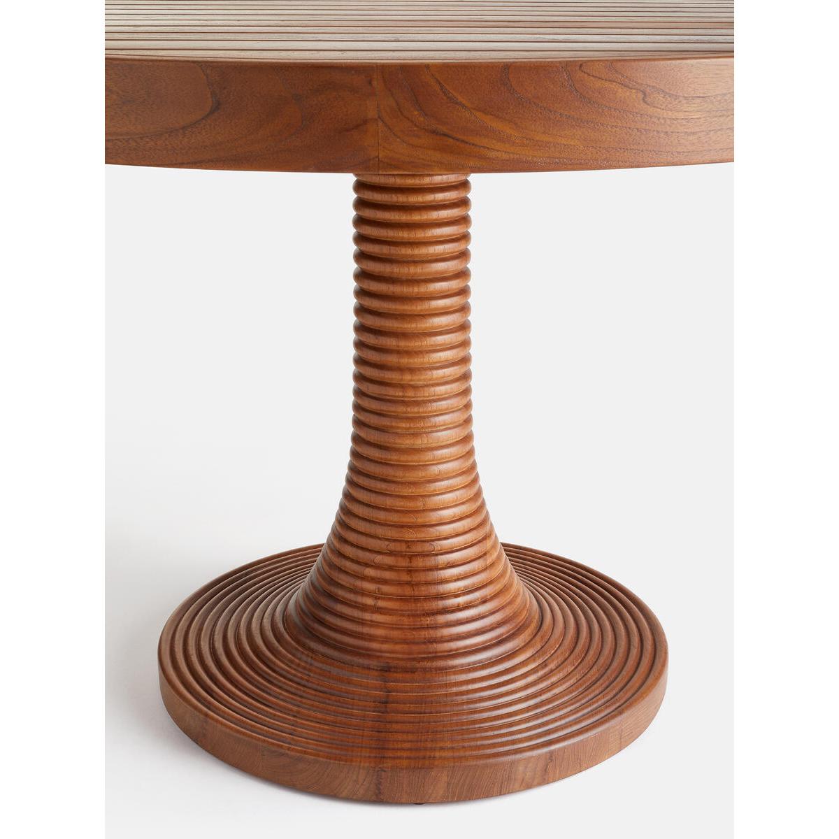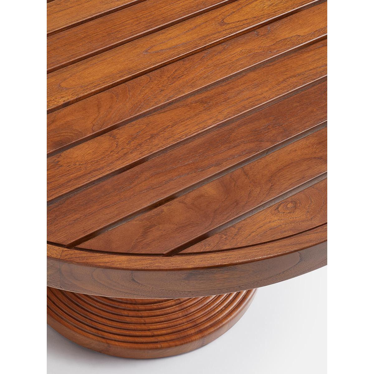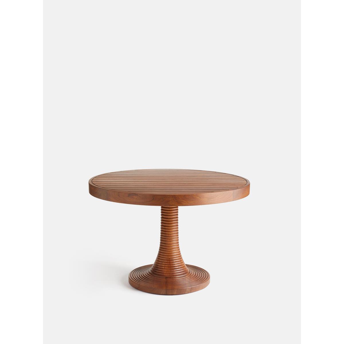 Found in the outdoor spaces at many of our Houses, including. Soho House Austin, the Edson Low Dining Table is crafted from solidteak wood with a slatted round top and elegantly tapered, ribbedbase. A rich, mid-tone stain adds warmth and depth - a great piecefor gathering friends and family outside. Solid teak wood table. Slatted round top. Tapered ribbed base. Mid-tone stain. Seats four people. Inspired by Soho House Austin.
