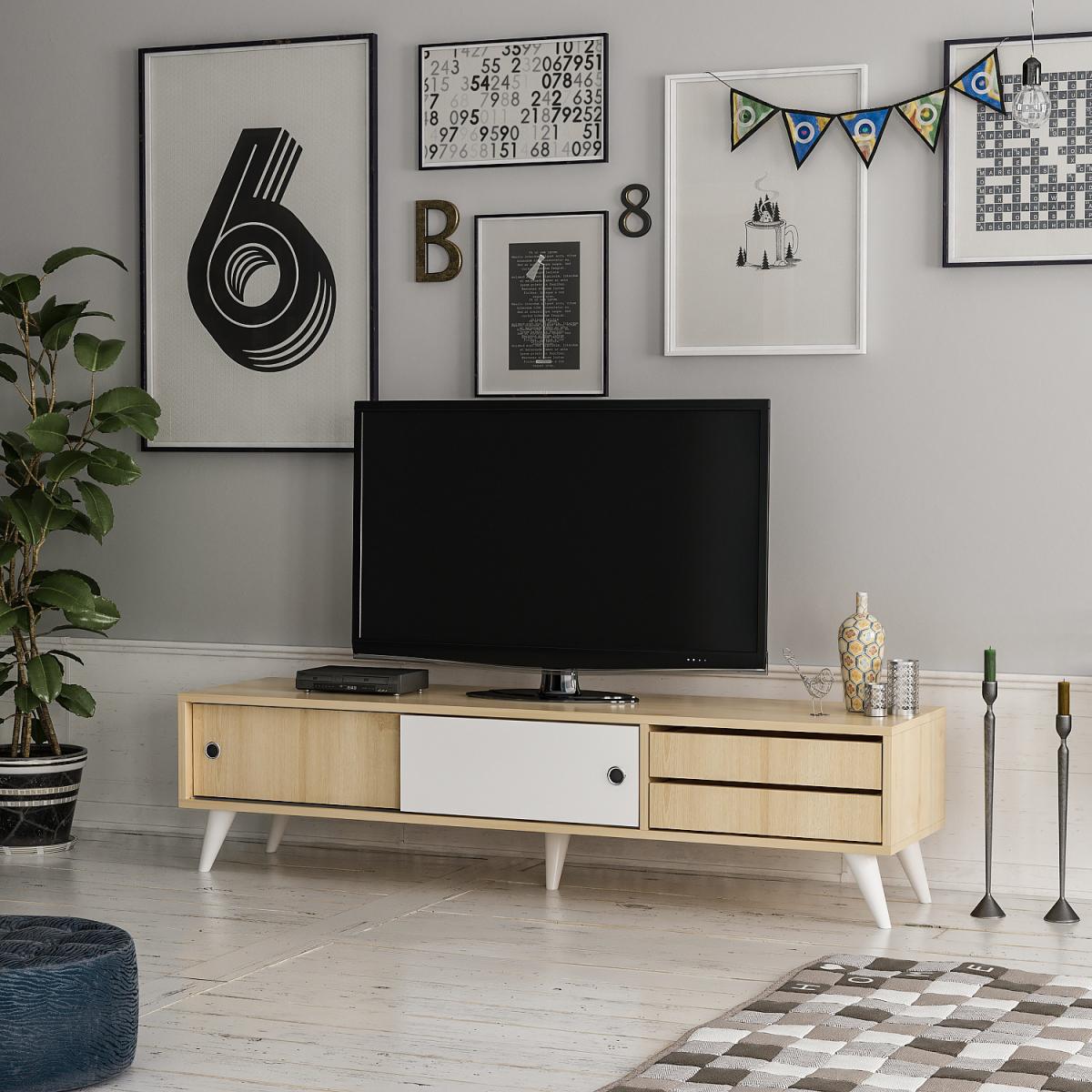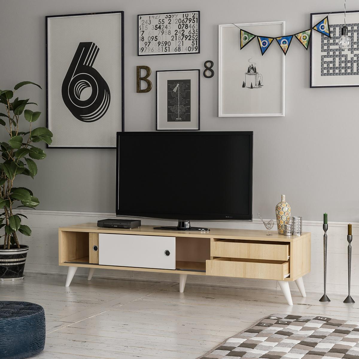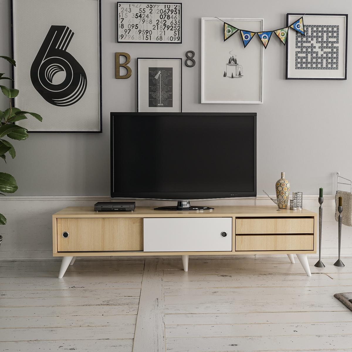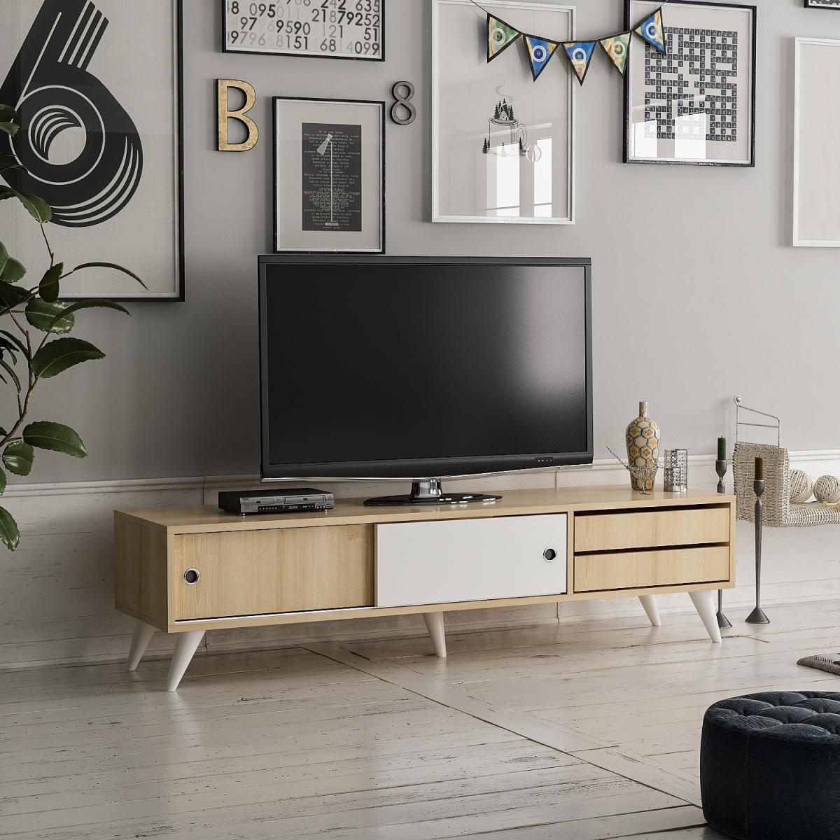 This stylish TV stand offers an ample amount of storage while not compromising on aesthetics. The TV stand will bring your room an elegant look with its design and colours. It also has 2 cabinets and 2 drawers. The TV unit is made of high-quality melamine-faced chipboard finished in oak wood look featuring a tapered shape and high-quality plastic legs. It has an uncomplicated assembly structure for your convenience.