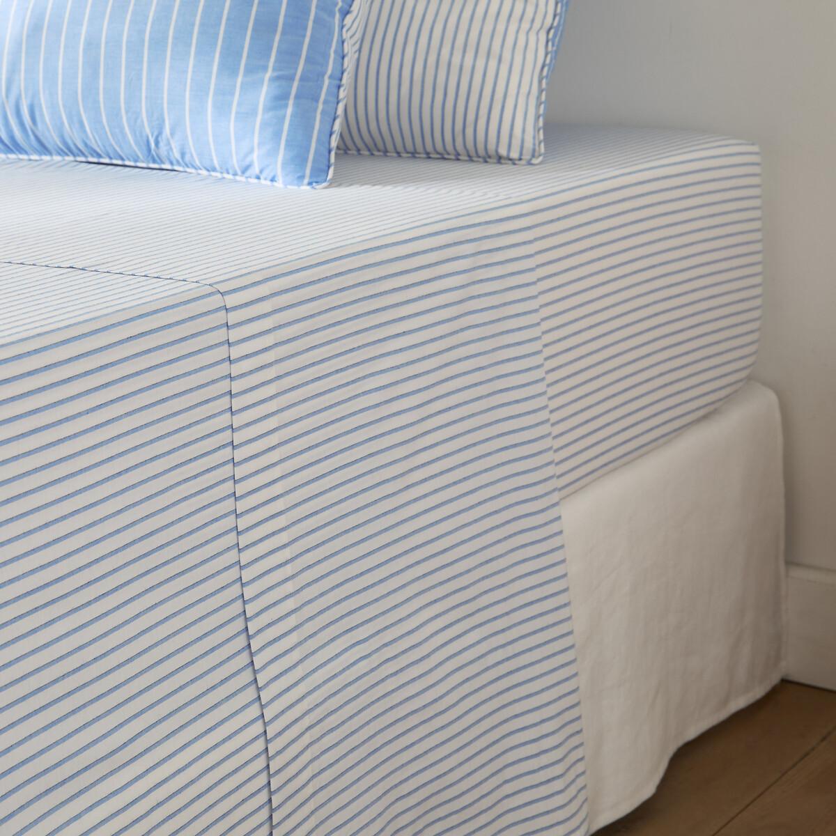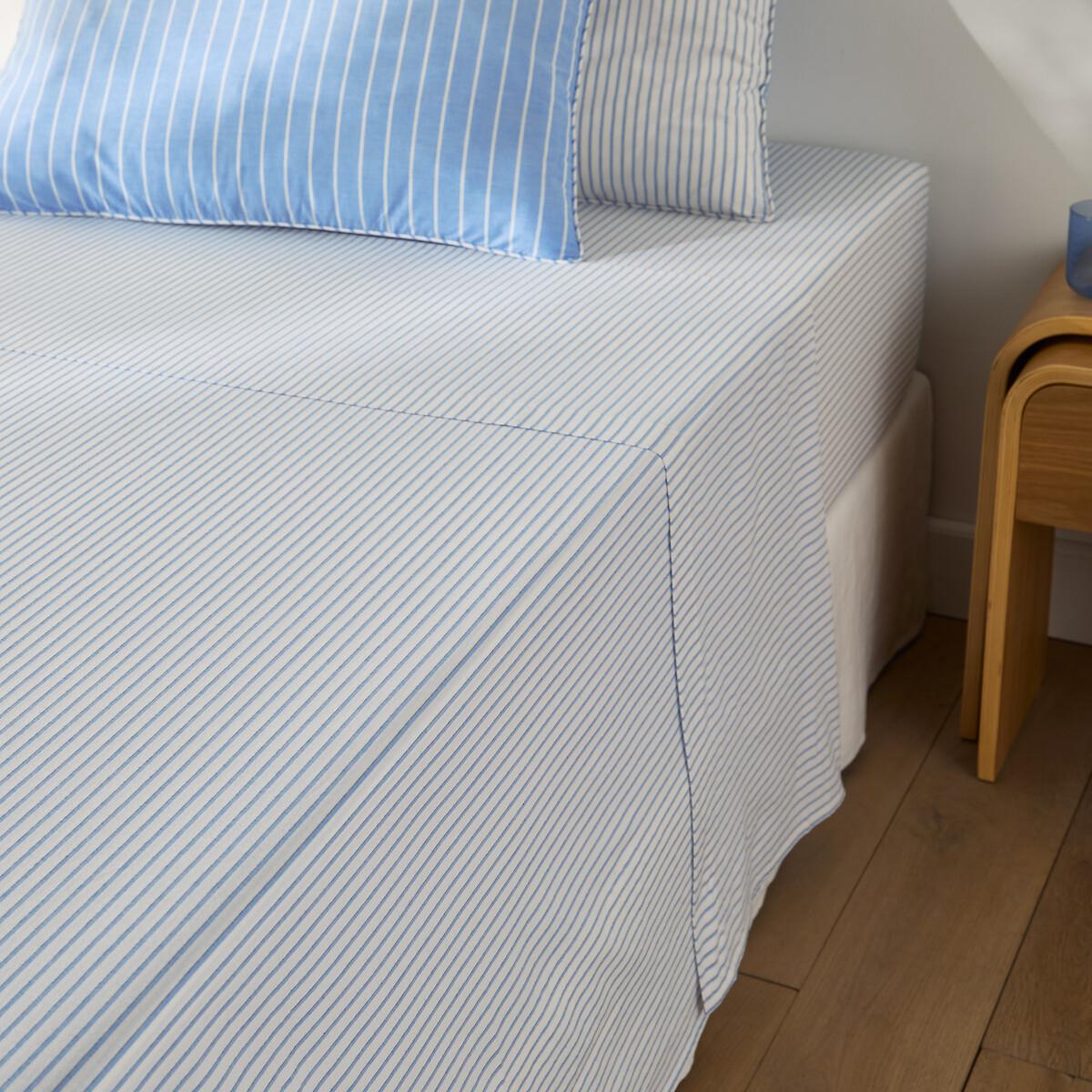 A combo of contemporary lines and repeated patterns emerge in blue and white on the Edward flat sheet, in yarn-dyed cotton percale. Designed by La Redoute Intérieurs. Yarn-dyed cotton percale offers a pleasant sensation, with a light, fresh feel. Its tight weave makes it particularly soft for premium comfort. A matt, smooth fabric that will soften with each wash. Product Details • 100% cotton • Yarn-dyed cotton percale • Blue stripes on white background. As the seasons change, add your own personal touch by mixing the Edward range with our plain cotton percale range from Scenario. Care Advice • Machine washable at 60°C • By washing your laundry at 40°C instead of 60°C, you limit energy consumption. Dimensions • 180 x 290cm: Single • 240 x 290cm: King • 270 x 290cm: King • OEKO-TEX® Standard 100. Standard 100 certification by OEKO-TEX® tests textile products for harmful substances via an independent, international label.