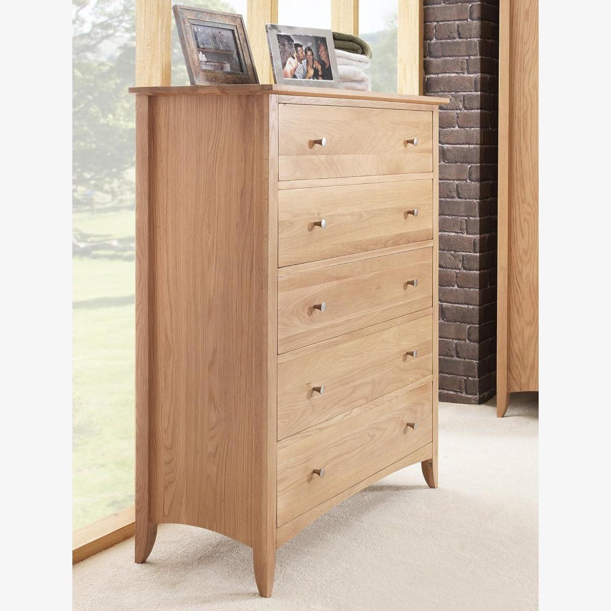 The Edward Hopper chest of drawers is a modern and stylish storage solution for any room in your home. With its sleek design and tapered legs, this chest of drawers exudes a contemporary aesthetic that will complement a variety of decor styles. Crafted with solid construction, it offers durability and longevity. The five deep drawers provide ample storage space for your belongings, while the metal easy-glide runners ensure smooth operation. The metal handles add a touch of elegance and functionality. Available in a choice of White or Oak finishes, you can select the one that best suits your personal taste and existing furniture. Measuring 100cm wide, 120cm tall, and 42cm deep (39.4 inches wide, 47.2 inches tall, and 16.5 inches deep), this chest of drawers is a practical and space-saving option. Arrives fully assembled, allowing you to enjoy its convenience right away. Upgrade your storage with this Edward Hopper chest of drawers and experience the perfect blend of style and functionality.