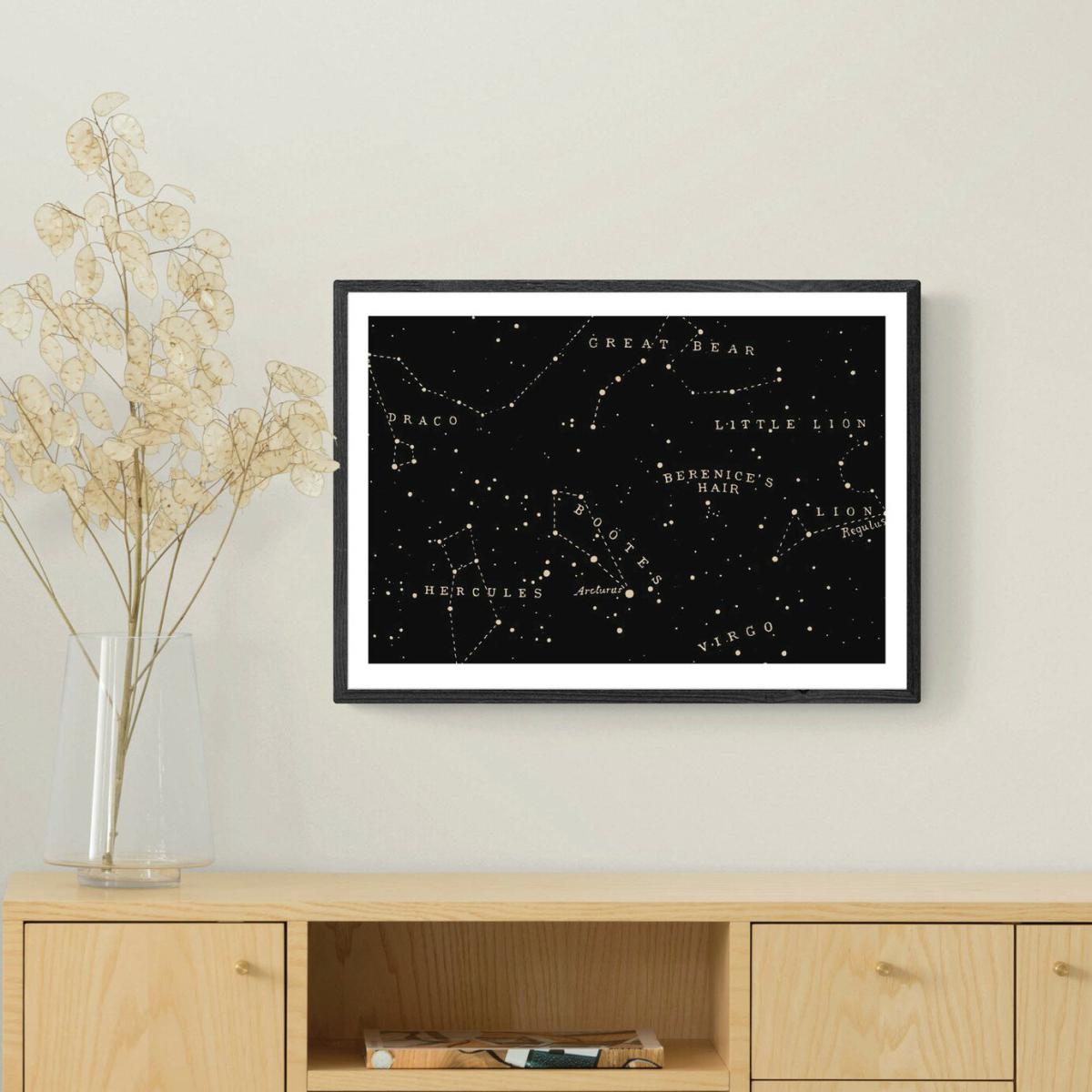 See what's in your stars with this gorgeous constellation art print by Aster. Printed with a giclee, fine art printing process on 210gsm, acid-free archival paper protecting product longevity for up to 70 years and framed in obeche wood with an acrylic glaze. This frame comes ready to hang with a saw tooth hanging system. Published by East End Prints. Overall size H31.7, W44, D2.2cm. Framed print. Rectangular. Fixtures and fittings included. Obeche wood & acrylic glazing frame included.