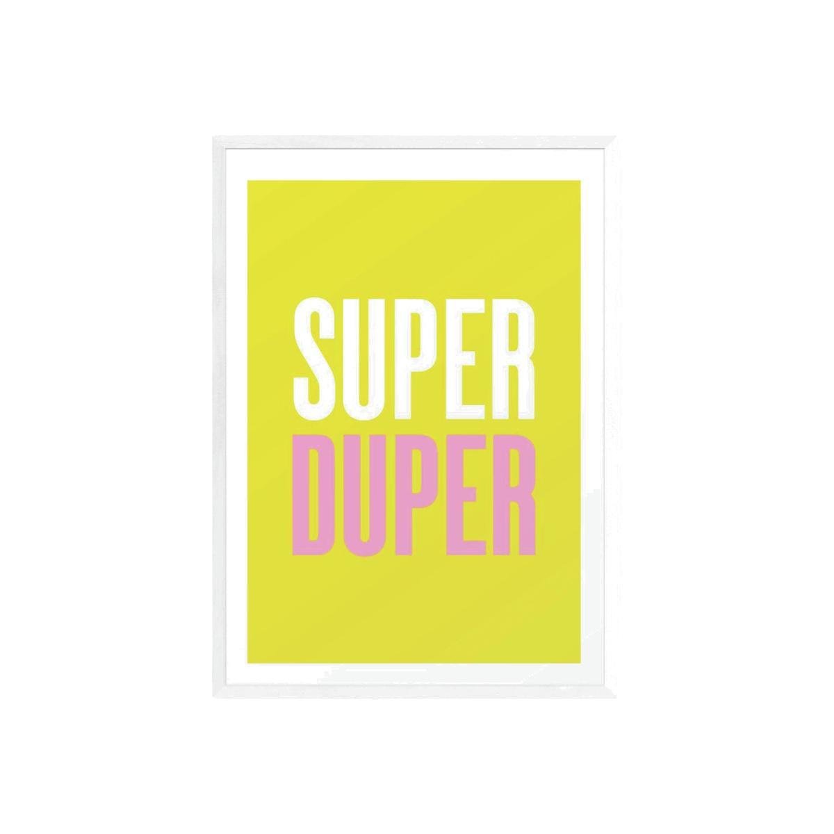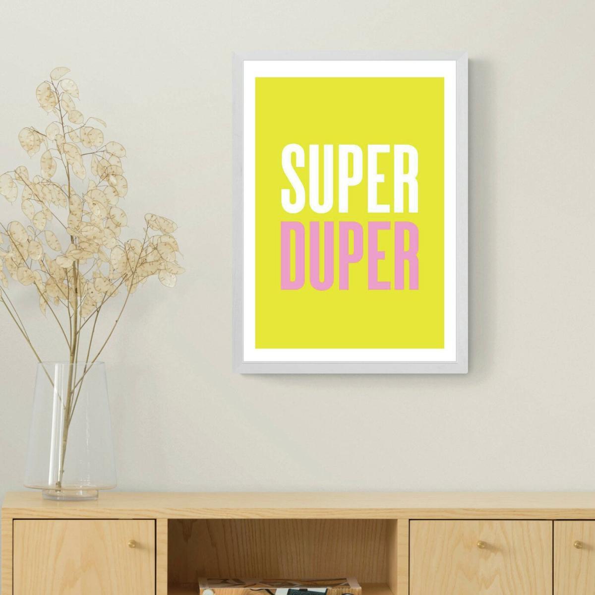 Brighten up your home with this Super Duper typographic print by Oh Fine! Art. Printed with a giclee, fine art printing process on 210gsm, acid-free archival paper protecting product longevity for up to 70 years and framed in obeche wood with an acrylic glaze. This frame comes ready to hang with a saw tooth hanging system. Published by East End Prints.