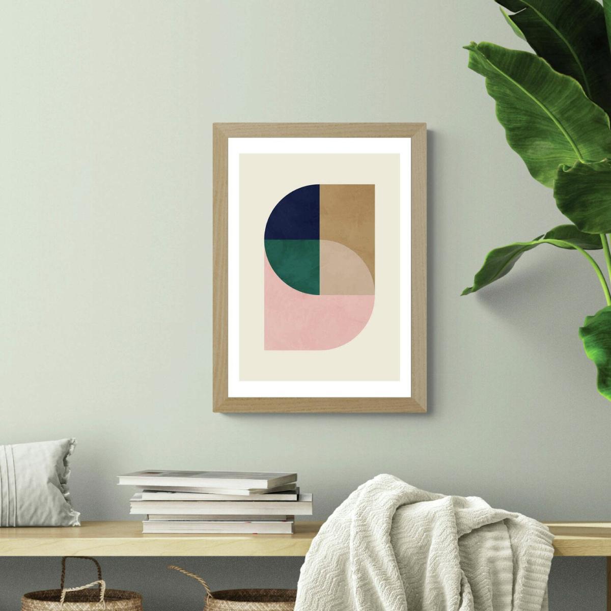 I love this piece for its clean, contemporary aesthetic and versatility. It works particularly well in minimalist or modern interiors, adding a touch of colour without overwhelming the space. The geometric design makes it a great focal point in living rooms, bedrooms or home offices. Practical styling tips include pairing it with simple, neutral furnishings to let the artwork stand out, or layering it with other framed prints and textures for a more eclectic look. When hanging, consider eye-level placement in a gallery wall or as a statement piece above a sofa or sideboard to ensure it draws the right attention.